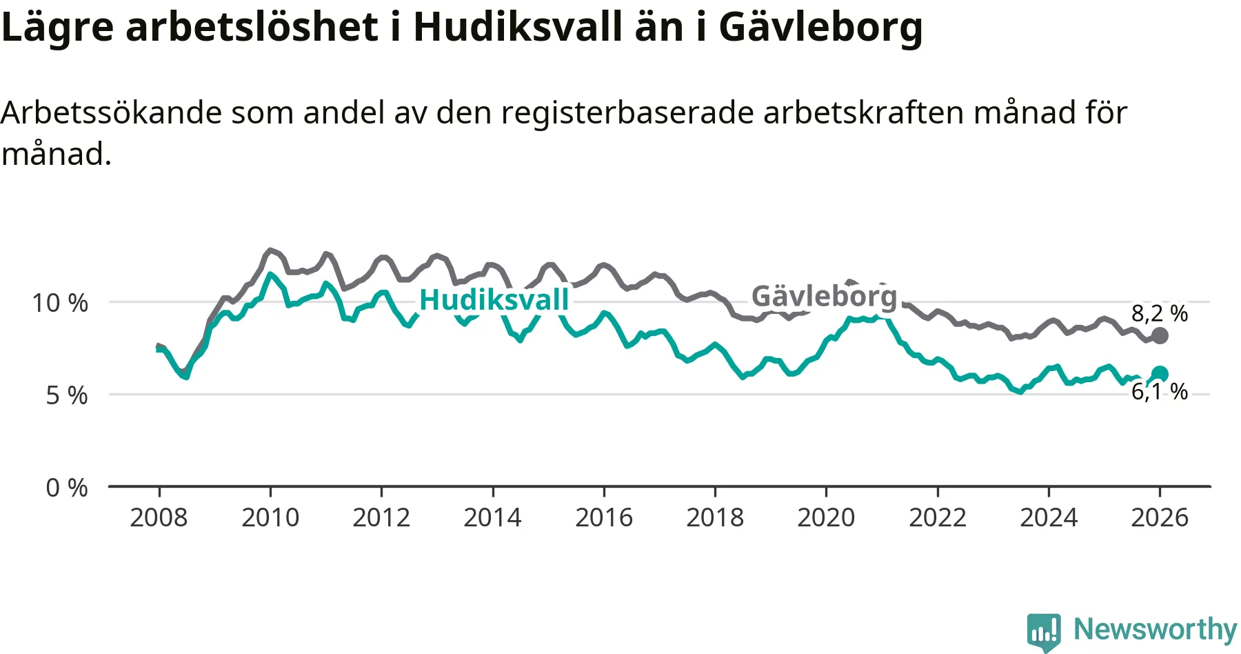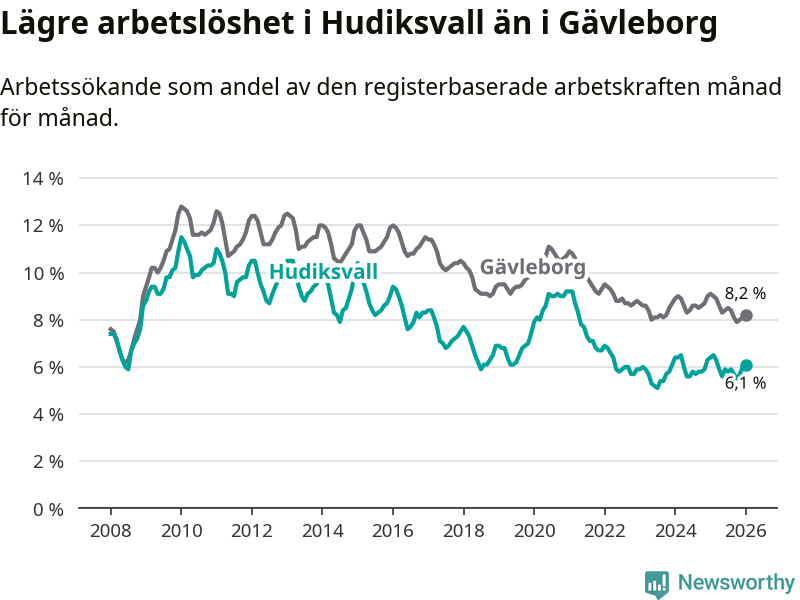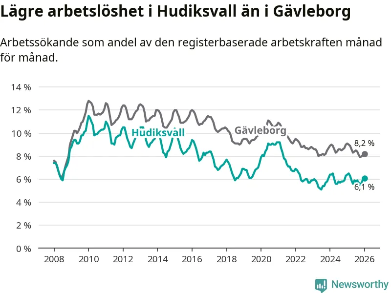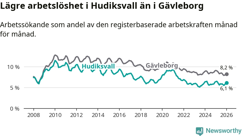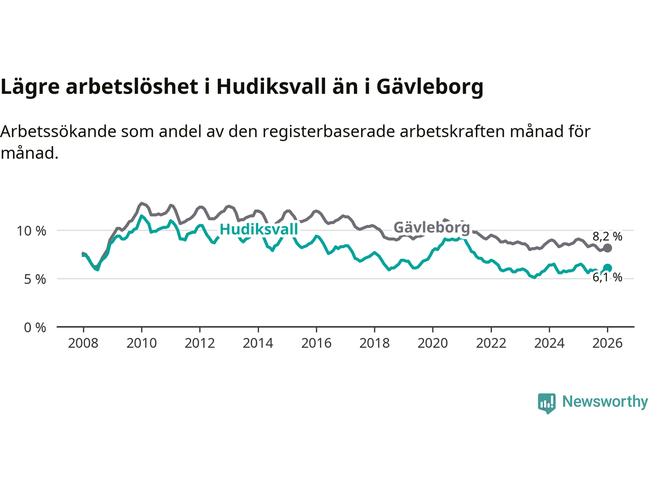 Hudiksvall hade redan tidigare lägre arbetslöshet än snittet i hela Gävleborgs län och nu växer klyftan (6,1 procent i kommunen, jämfört med 8,2 procent i hela länet). Hudiksvall har därmed även den lägsta arbetslöshetsnivån i länet. Söderhamn har den högsta (9,0 procent).