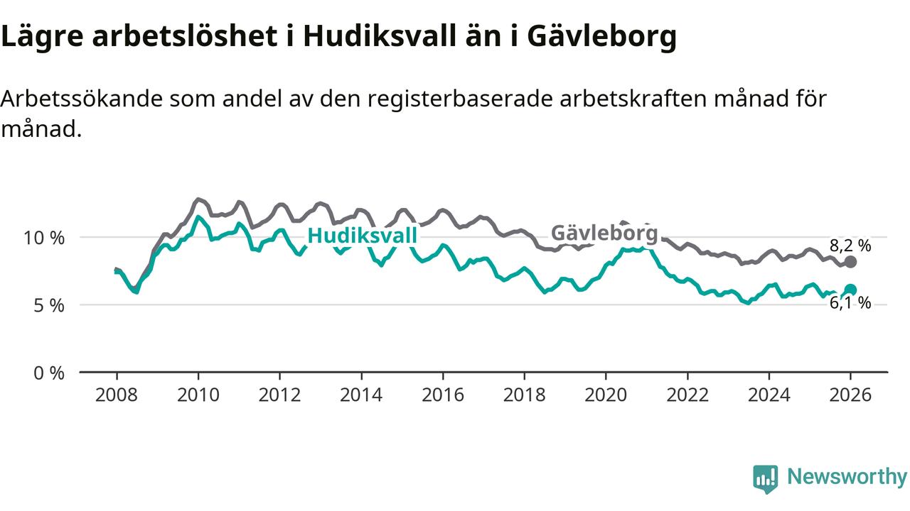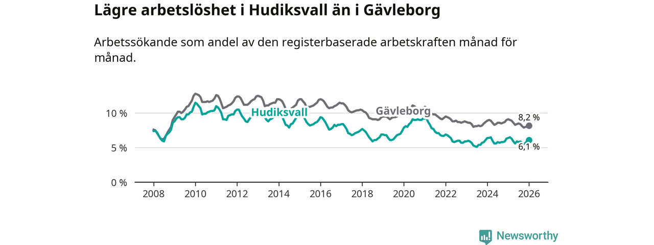 Under januari månad rapporterade Hudiksvalls kommun en total arbetslöshet på 6,1 procent. Det är en minskning jämfört med samma tidpunkt i fjol (−0,3 procentenheter). Även i Gävleborgs län sjunker arbetslösheten .