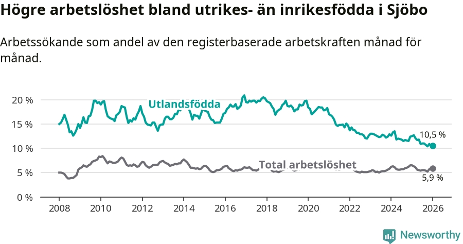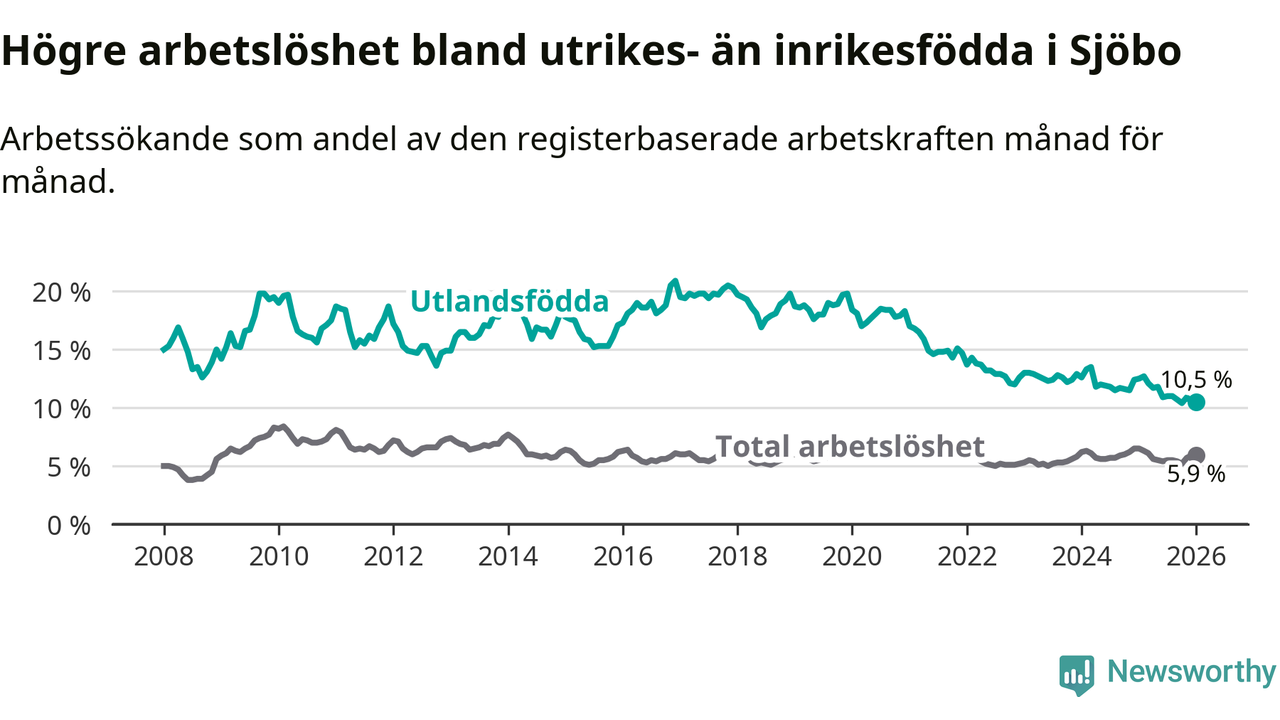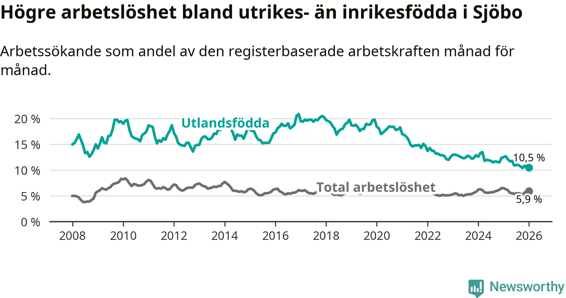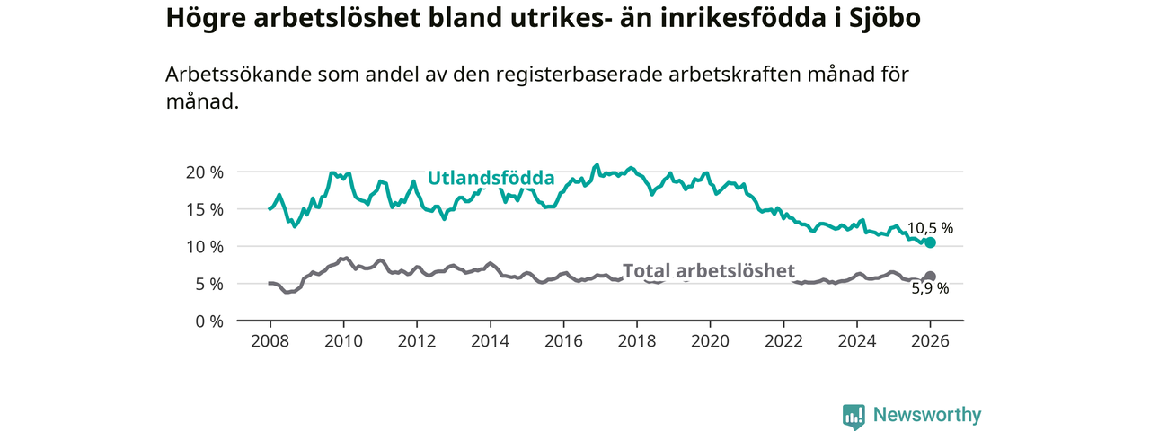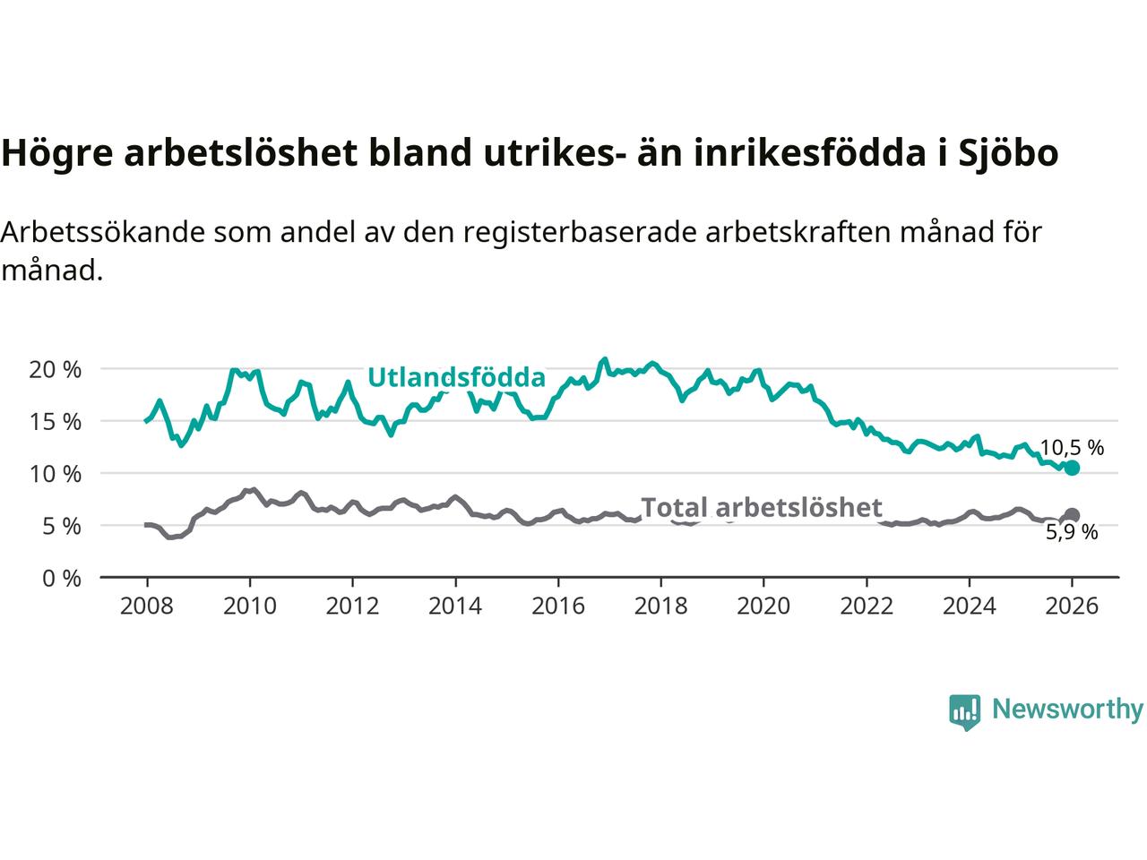 Arbetslösheten bland utlandsfödda var 10,5 procent i Sjöbo under januari månad, motsvarande 133 av 1 267 personer. Det är 2,0 procentenheter färre än vid samma tidpunkt i fjol (−23 om man räknar personer). Därmed är de utlandsföddas arbetslöshet lägre än vid samma tidpunkt i fjol för 22:a månaden i följd. Sedan mars 2024 har arbetslösheten bland utlandsfödda minskat från 13,5 till 10,5 procent.
