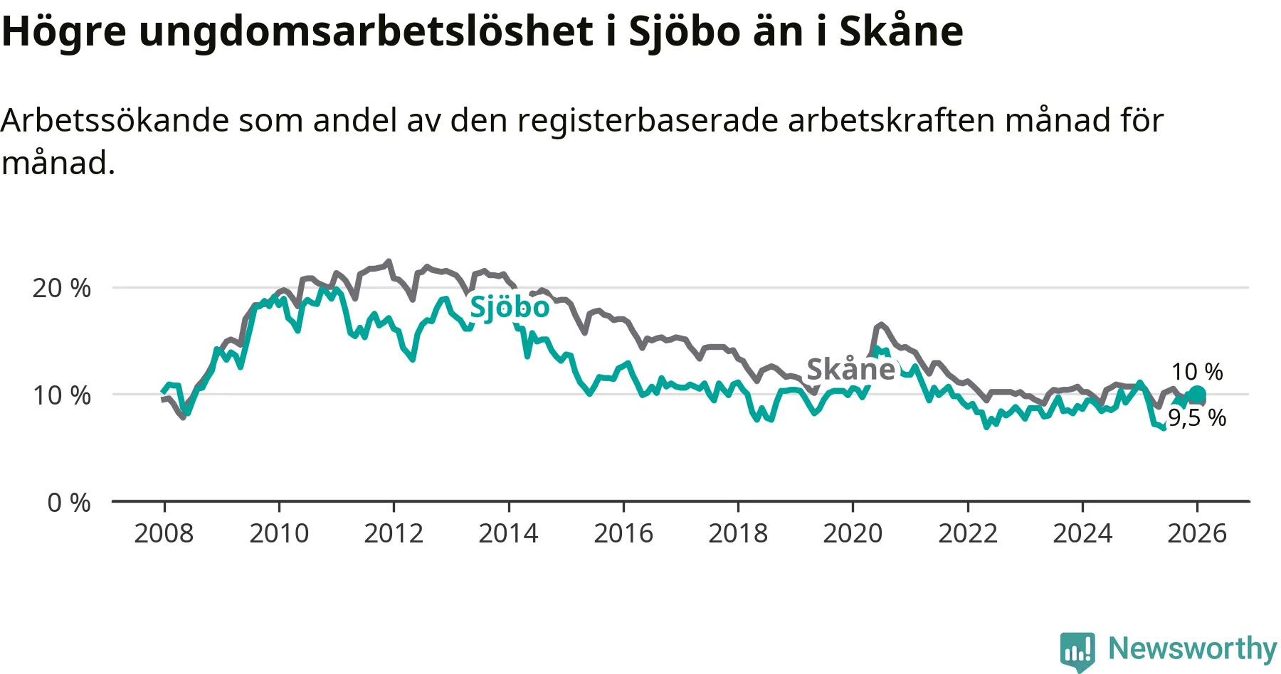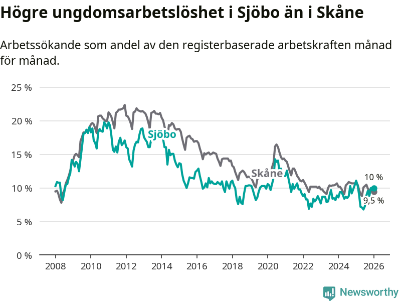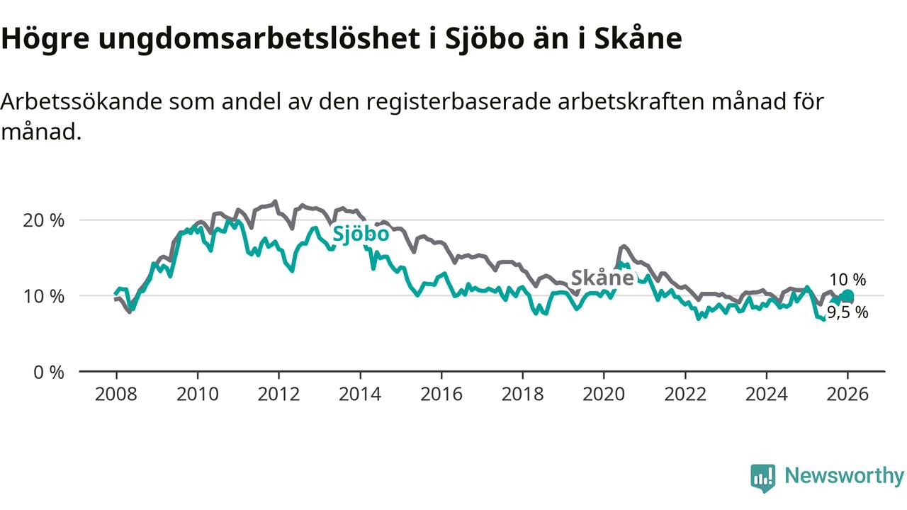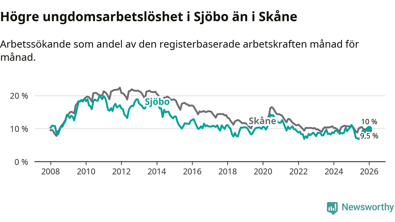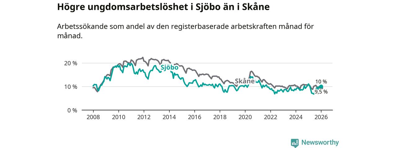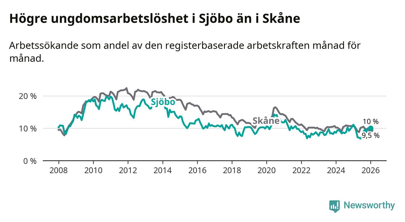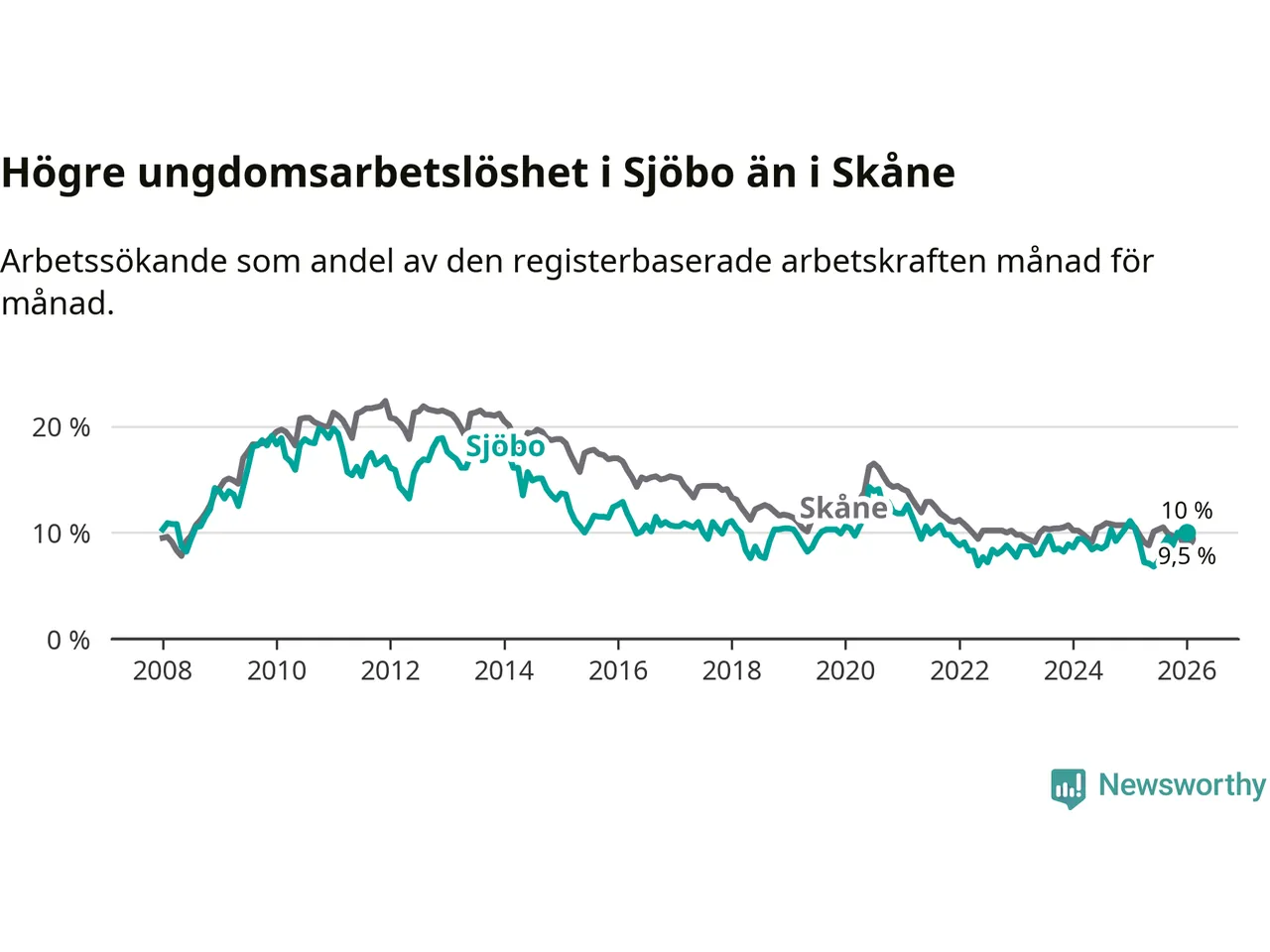 Medan Sjöbo har lägre total arbetslöshet än Skåne, ligger ungdomsarbetslösheten 0,5 procentenheter högre i Sjöbo.