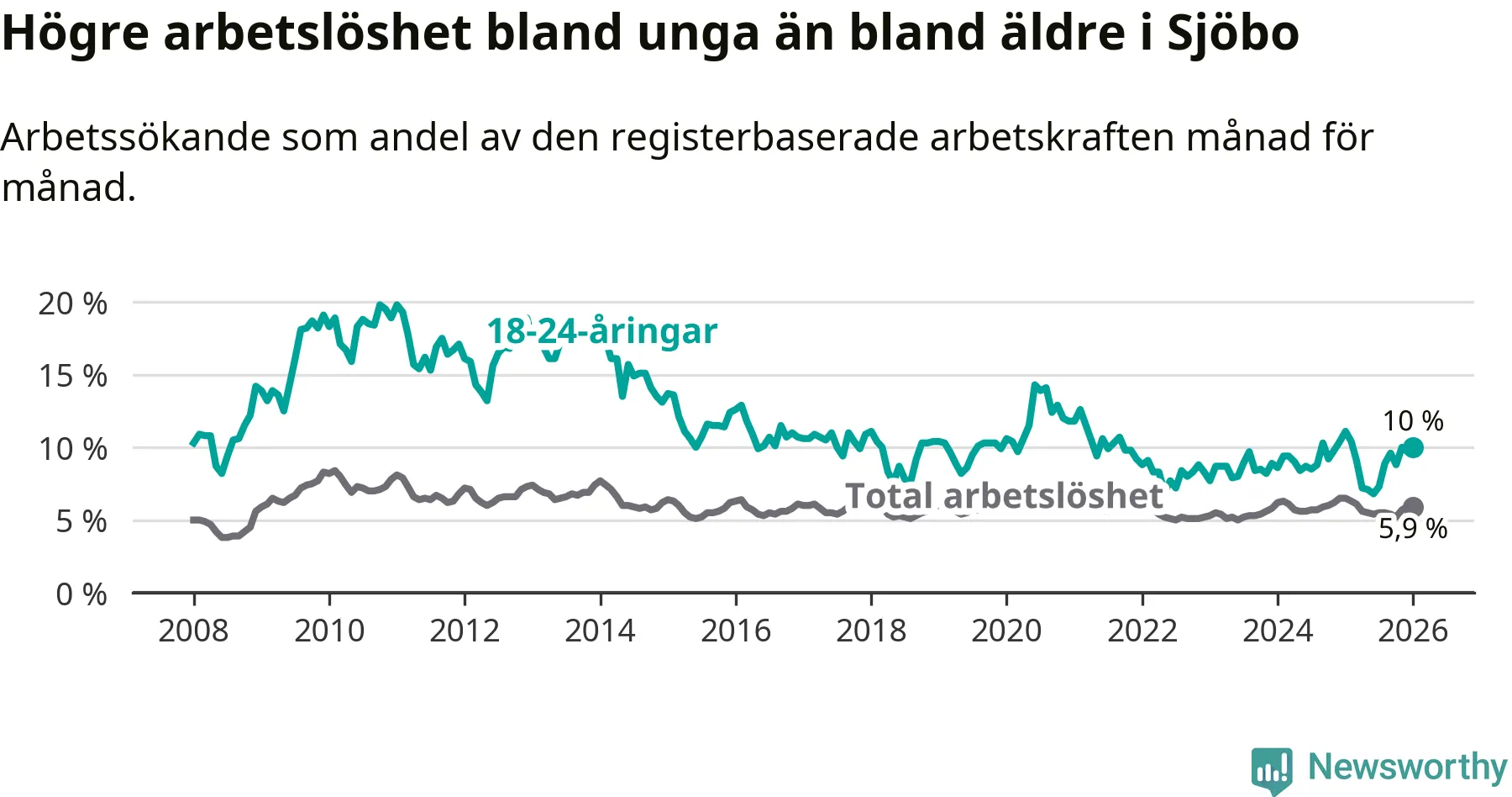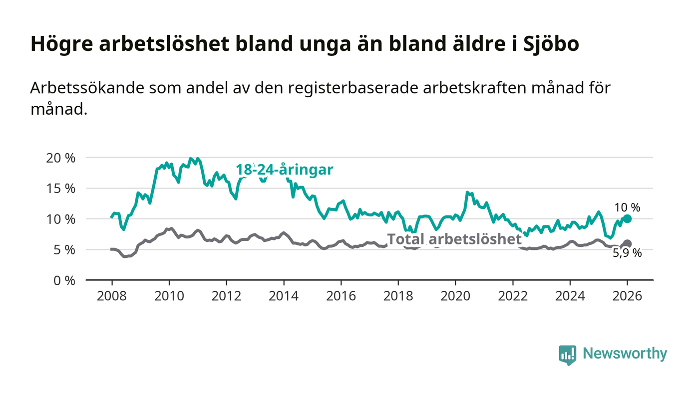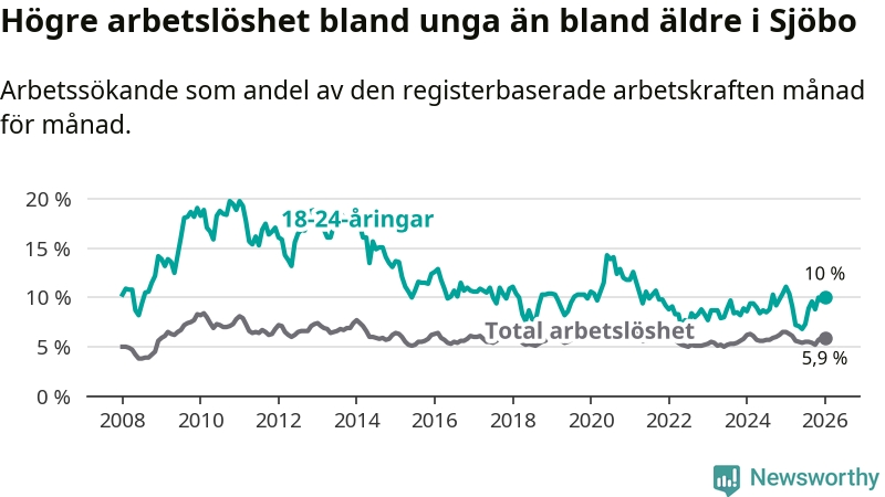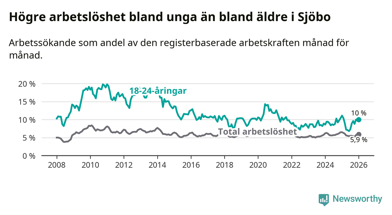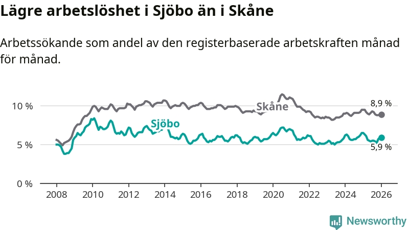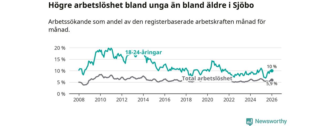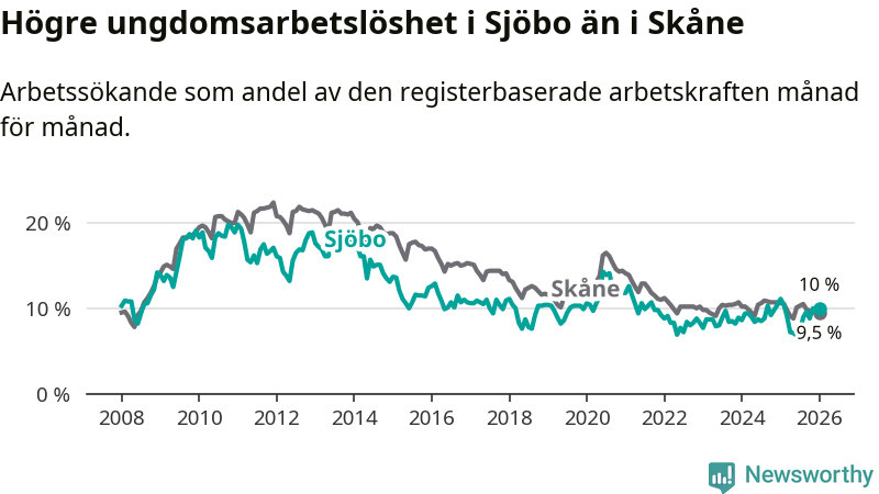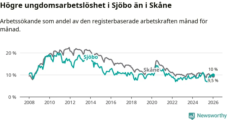 Medan Sjöbo har lägre total arbetslöshet än Skåne, ligger ungdomsarbetslösheten 0,5 procentenheter högre i Sjöbo.