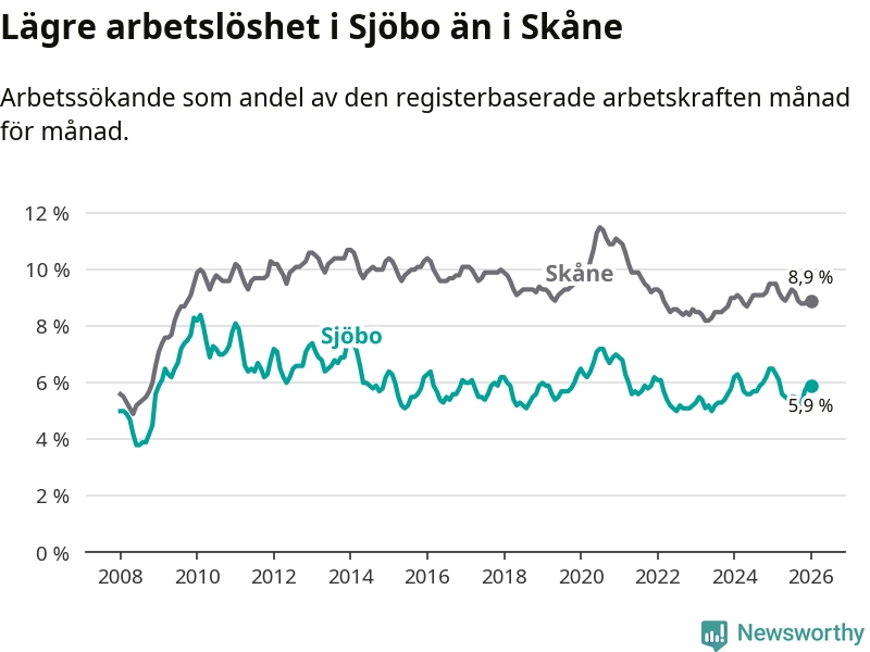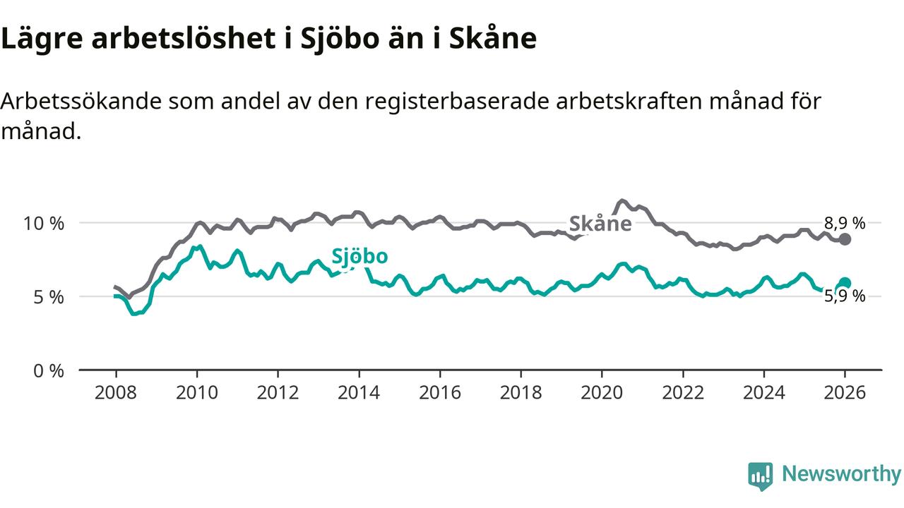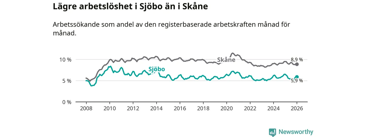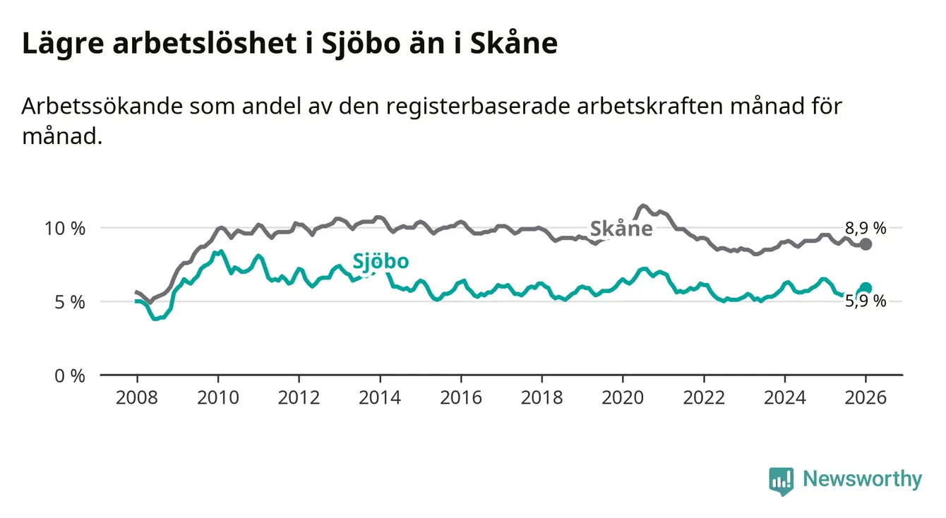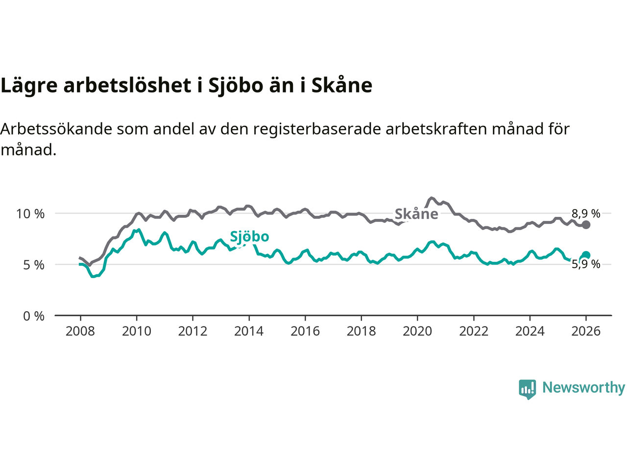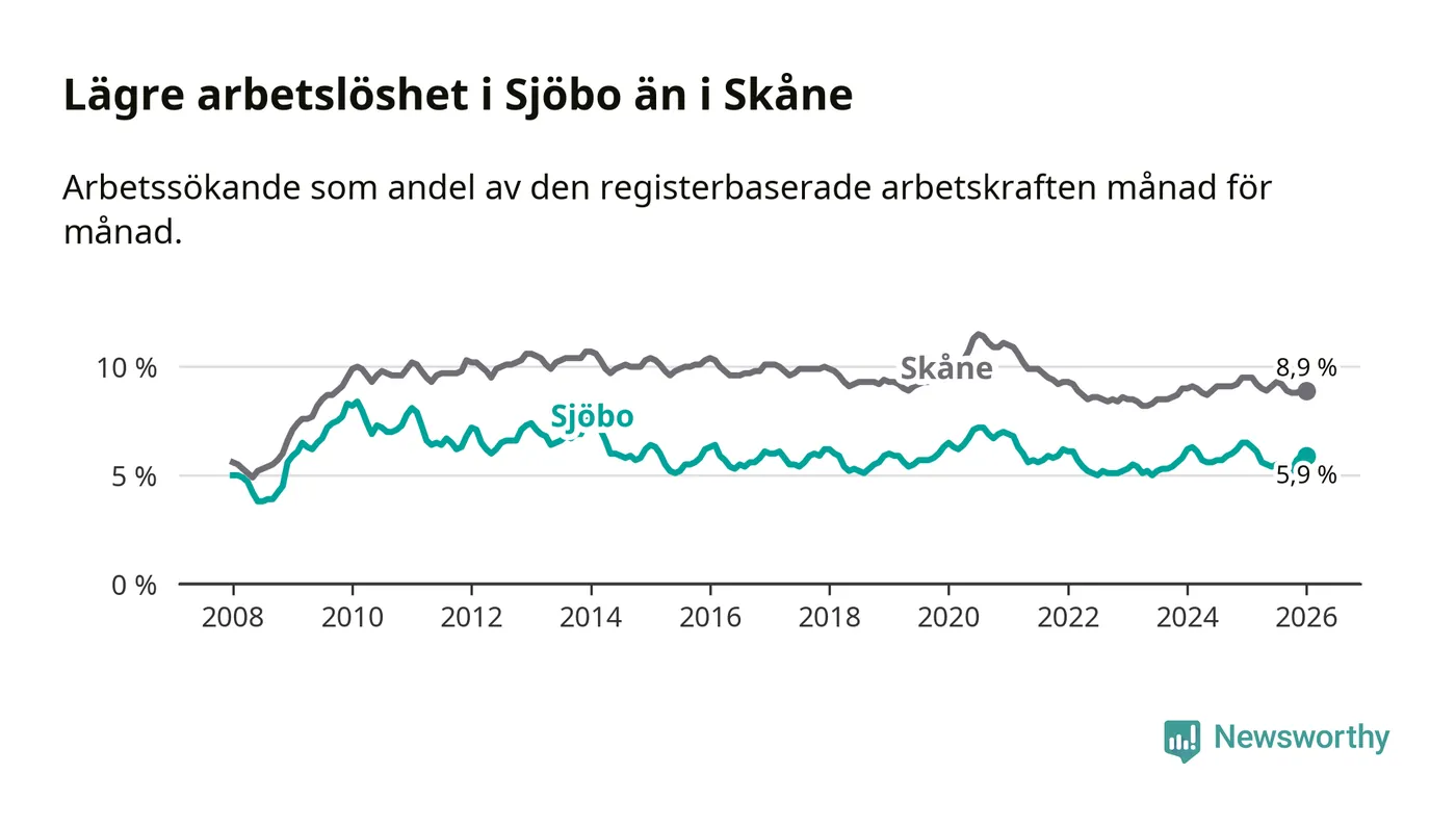 Under januari månad rapporterade Sjöbo kommun en total arbetslöshet på 5,9 procent. Det är en minskning jämfört med samma tidpunkt i fjol (−0,6 procentenheter). Även i Skåne län sjunker arbetslösheten .