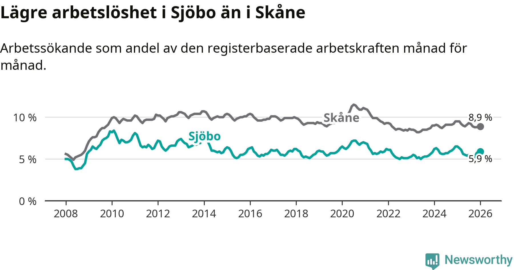 Graf: Arbetslöshet i Sjöbo kommun och Skåne län