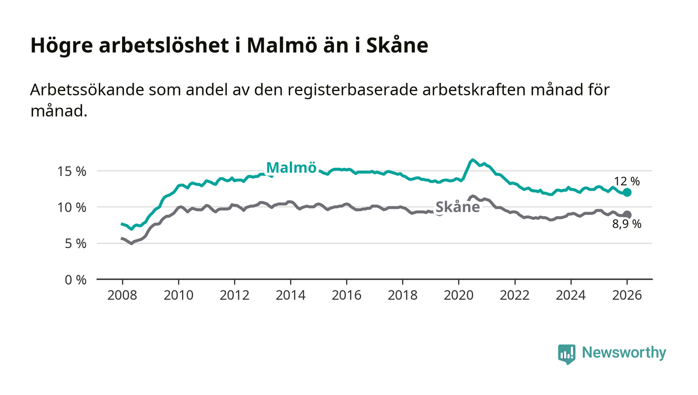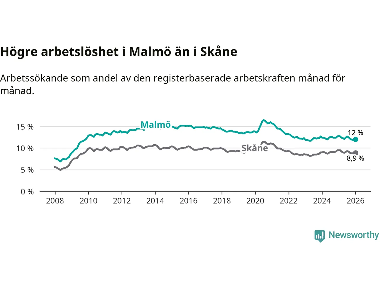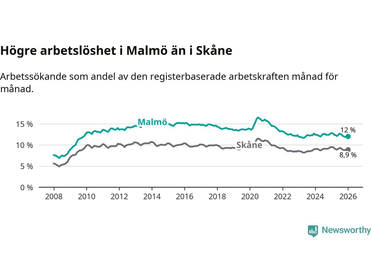 Även om arbetslösheten i Malmö alltså minskar, så ligger den fortfarande över snittet i hela Skåne län (12,0 procent i kommunen, jämfört med 8,9 procent i hela länet). Lomma har den lägsta arbetslösheten i länet (3,9 procent), medan Perstorp har den högsta (13,4 procent). För att Malmö skulle komma ner i samma arbetslöshetsnivå som Lomma skulle 15 458 personer behöva sysselsättas.