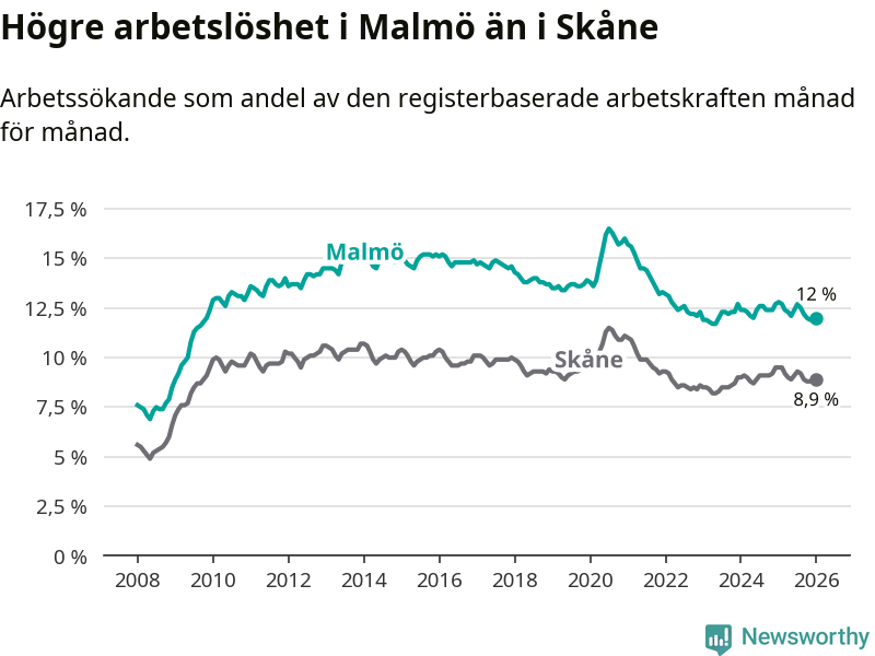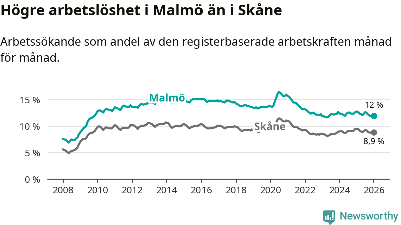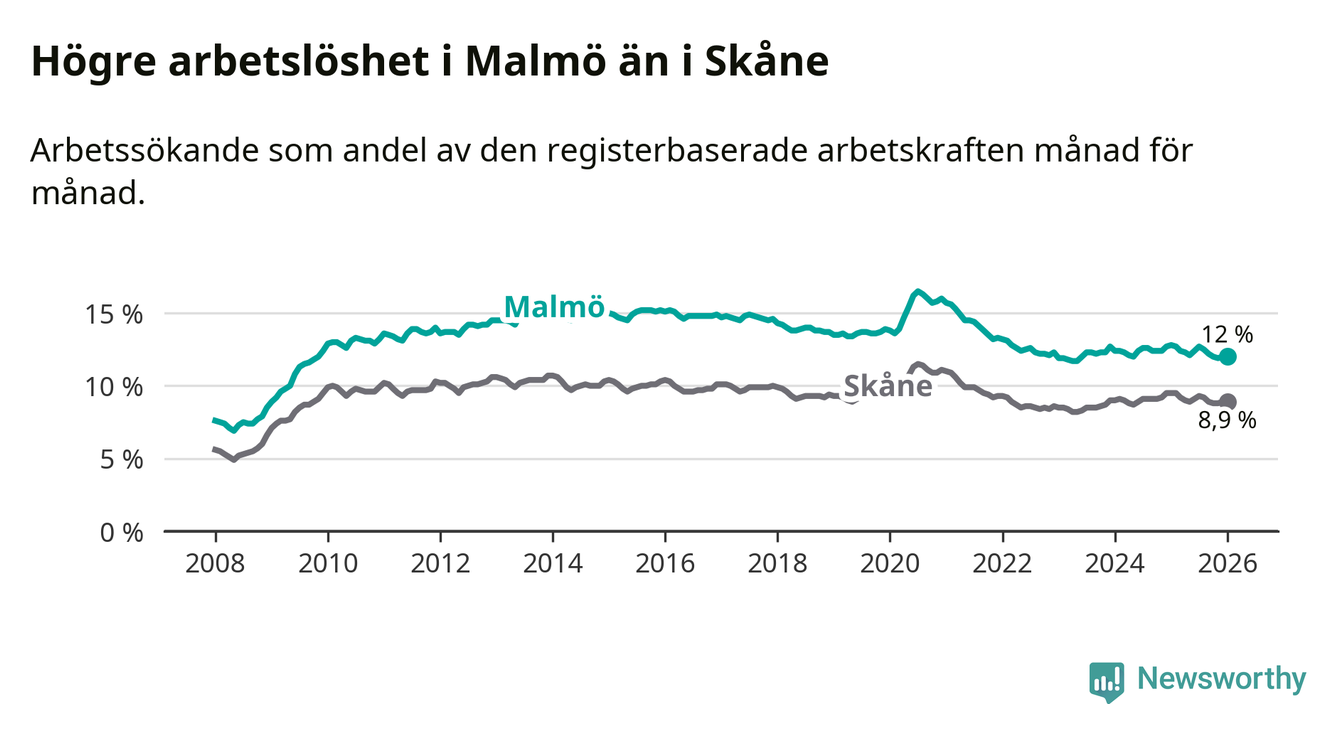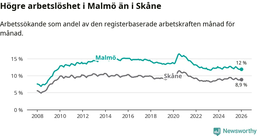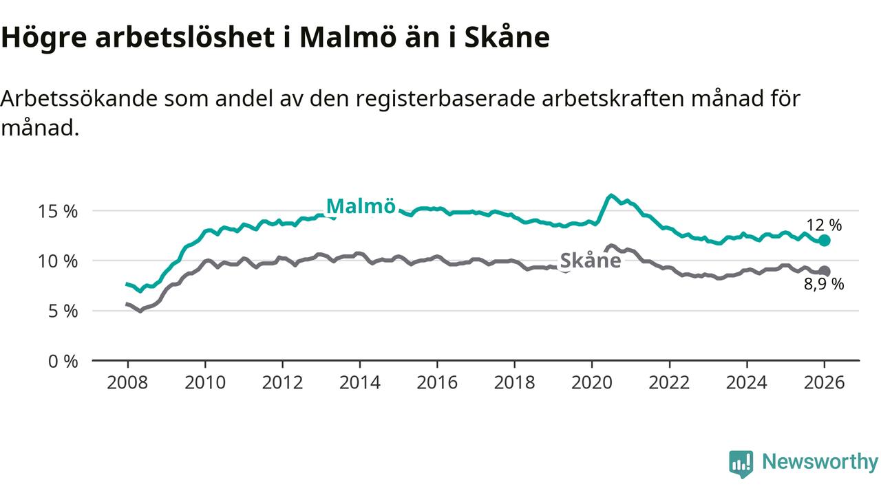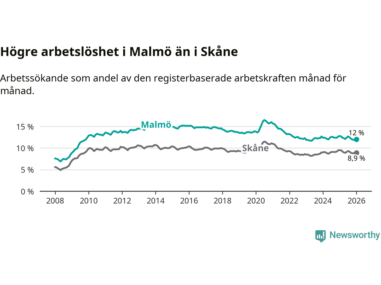 Även om arbetslösheten i Malmö alltså minskar, så ligger den fortfarande över snittet i hela Skåne län (12,0 procent i kommunen, jämfört med 8,9 procent i hela länet). Lomma har den lägsta arbetslösheten i länet (3,9 procent), medan Perstorp har den högsta (13,4 procent). För att Malmö skulle komma ner i samma arbetslöshetsnivå som Lomma skulle 15 458 personer behöva sysselsättas.
