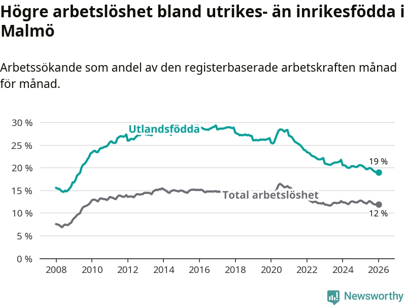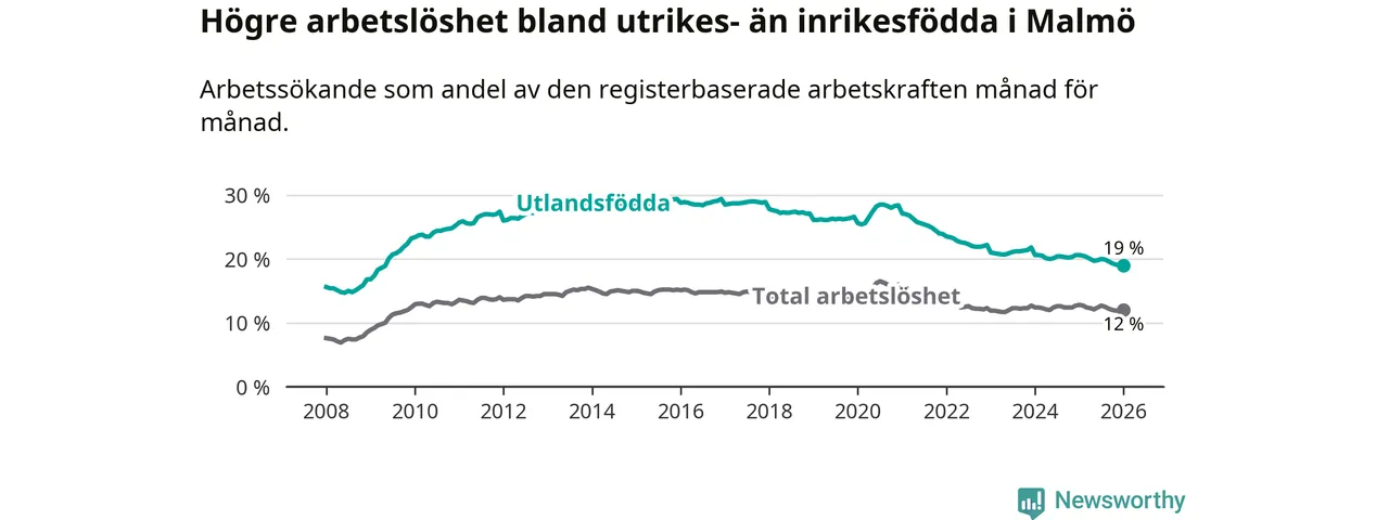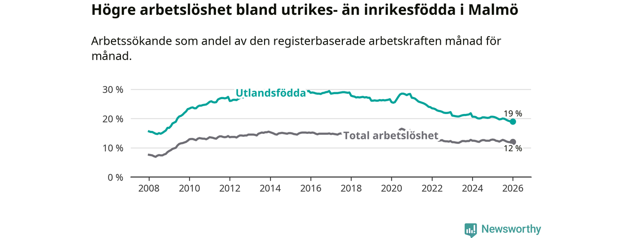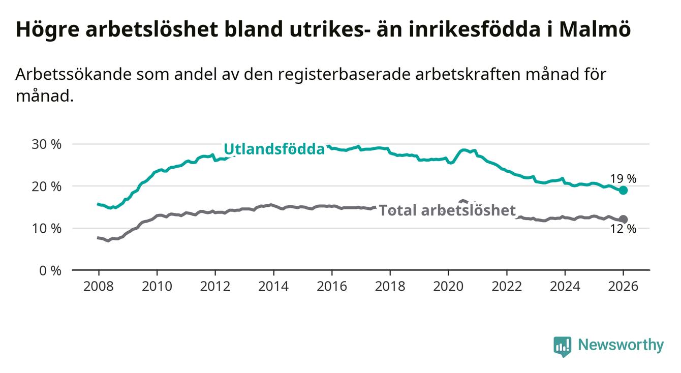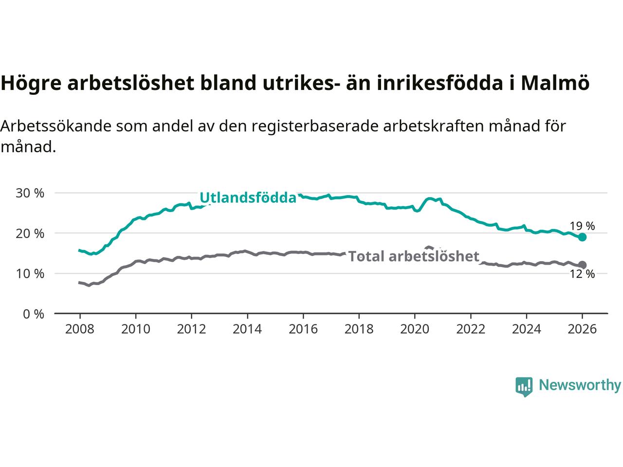 Arbetslösheten bland utlandsfödda var 19,0 procent i Malmö under januari månad, motsvarande 15 007 av 78 984 personer. Det är 1,6 procentenheter färre än vid samma tidpunkt i fjol (−876 om man räknar personer). Därmed är de utlandsföddas arbetslöshet lägre än vid samma tidpunkt i fjol för tolfte månaden i följd. Sedan januari 2025 har arbetslösheten bland utlandsfödda minskat från 20,6 till 19,0 procent.