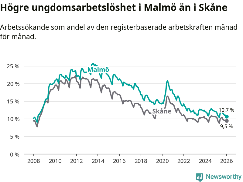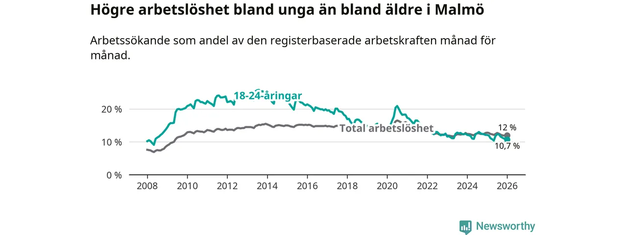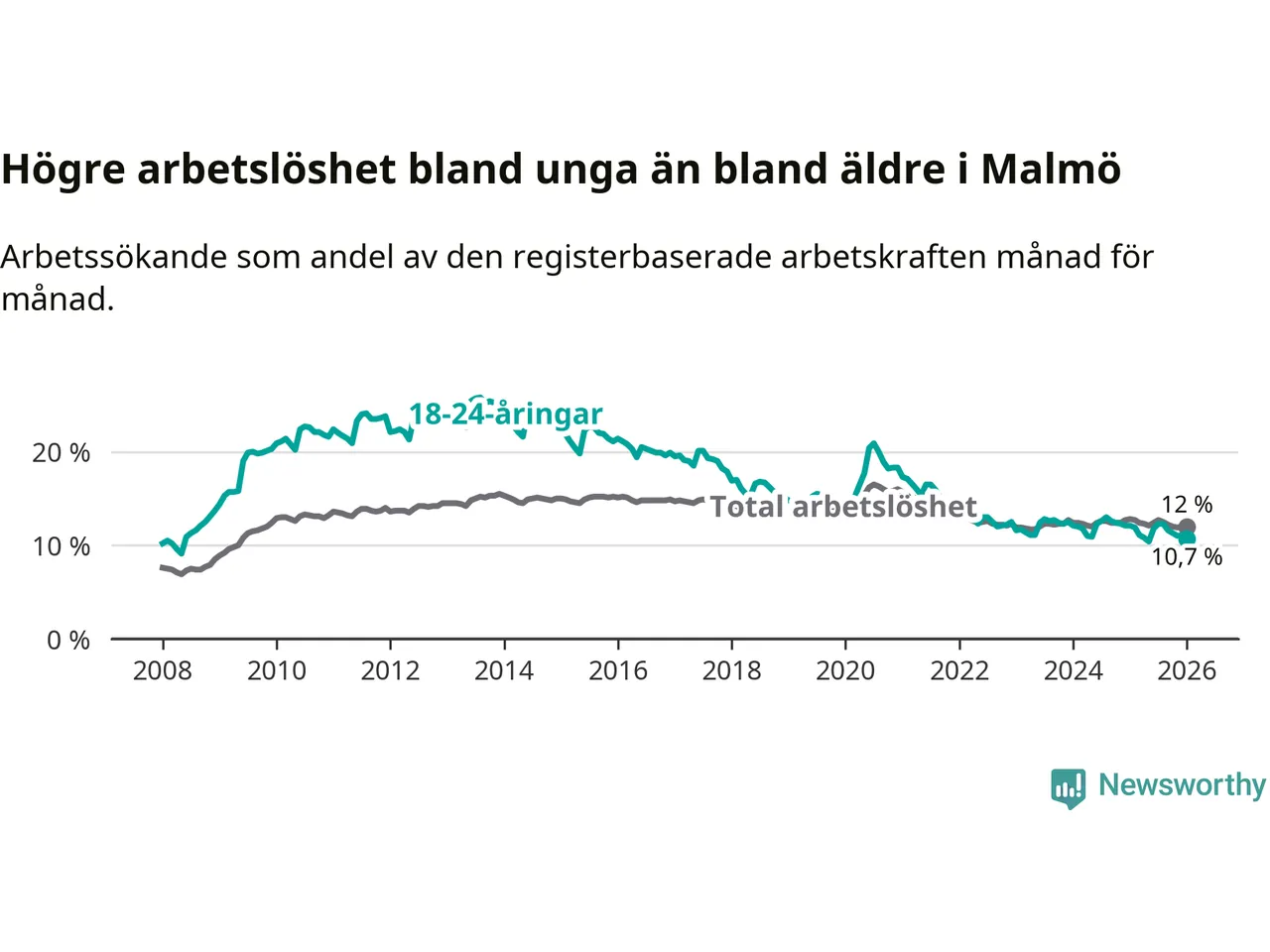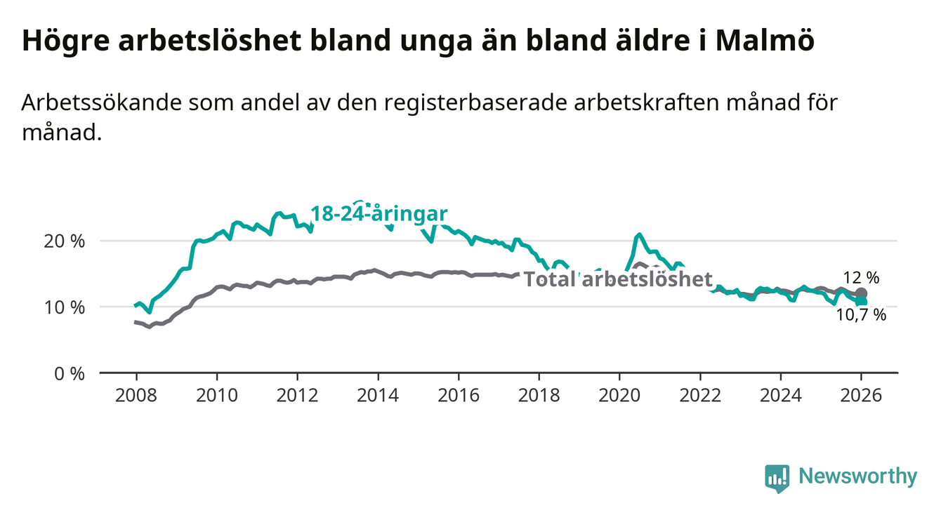 I och med den senaste månadens nedgång har de ungas arbetslöshet i Malmö sjunkit tolv månader i följd (ner från 12,1 procent i januari 2025 till 10,7 procent nu).