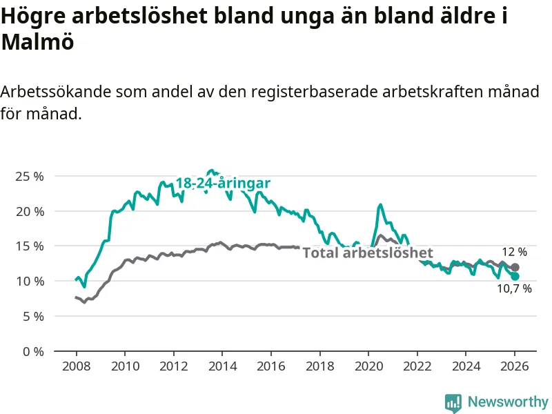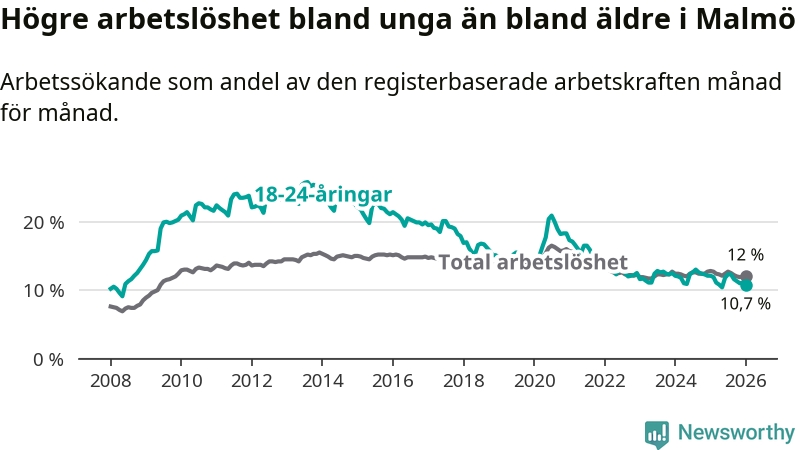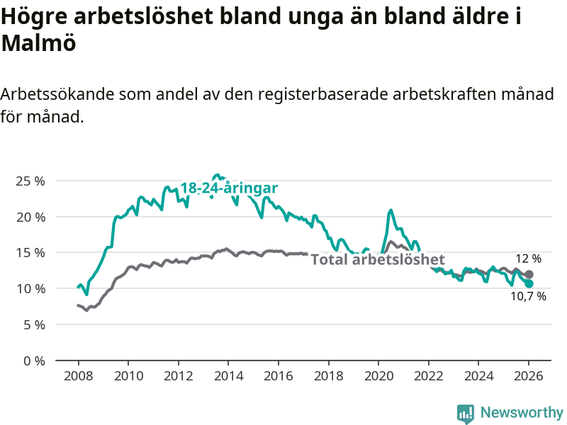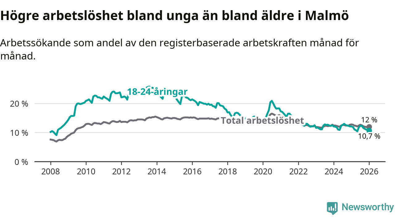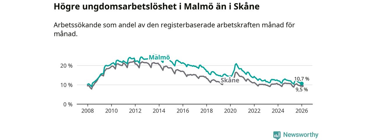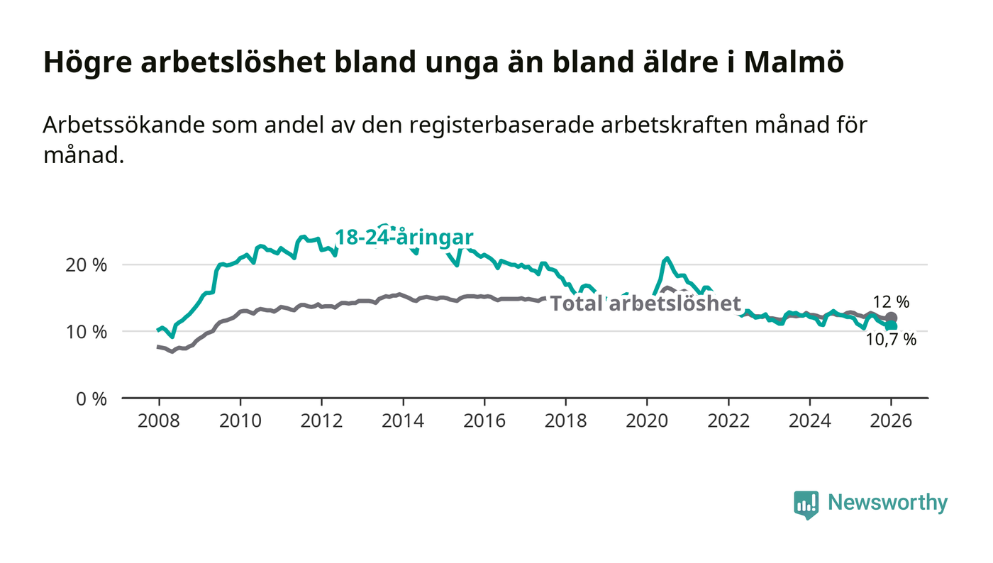 I och med den senaste månadens nedgång har de ungas arbetslöshet i Malmö sjunkit tolv månader i följd (ner från 12,1 procent i januari 2025 till 10,7 procent nu).