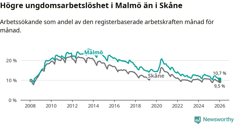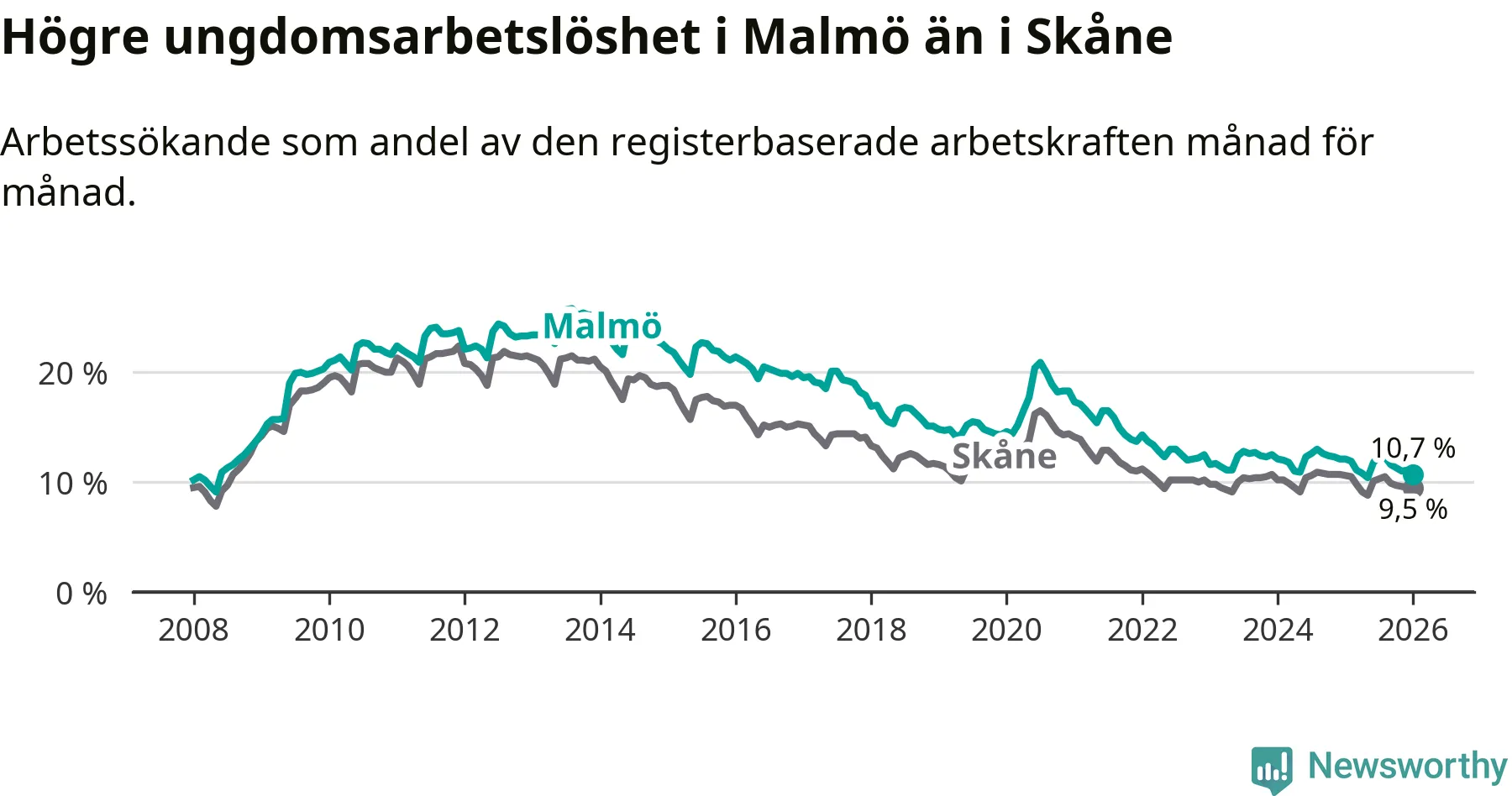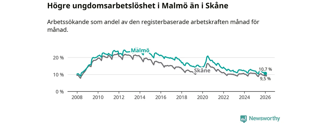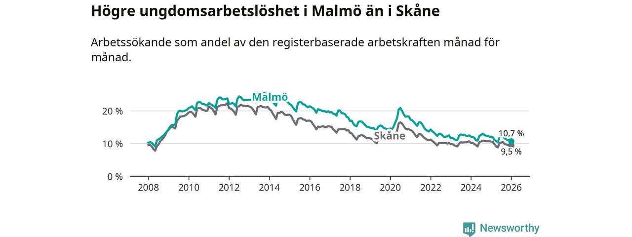 Precis som den totala arbetslösheten ligger ungdomsarbetslösheten i Malmö högre än i Skåne som helhet. Skillnaden mellan kommunen och länet är 1,2 procentenheter.