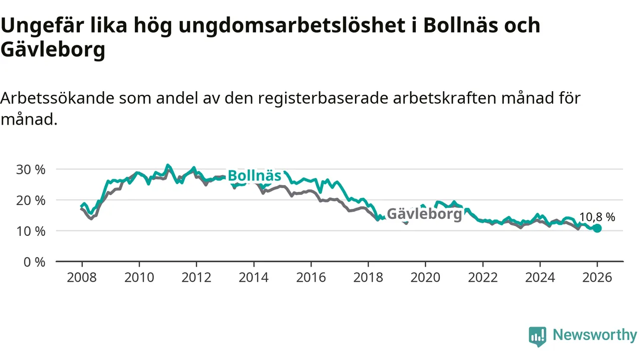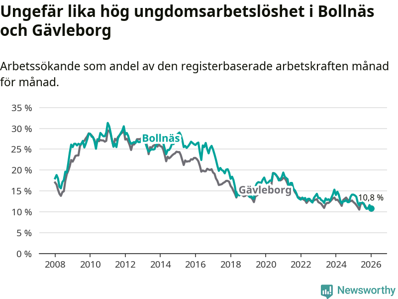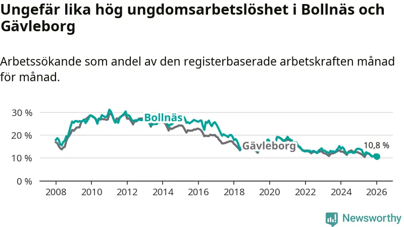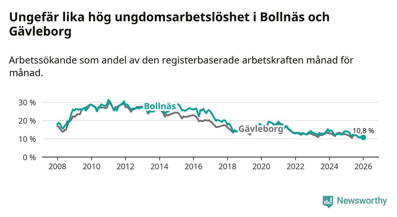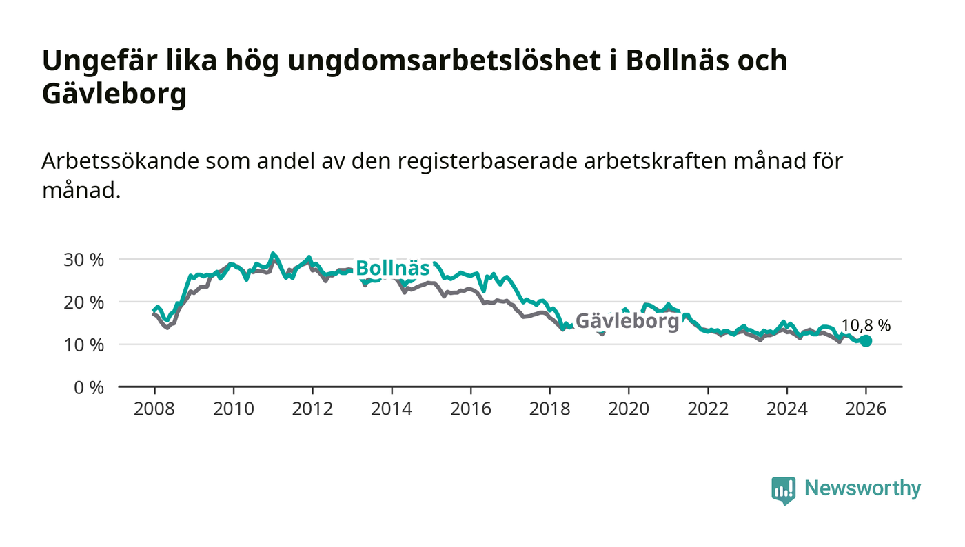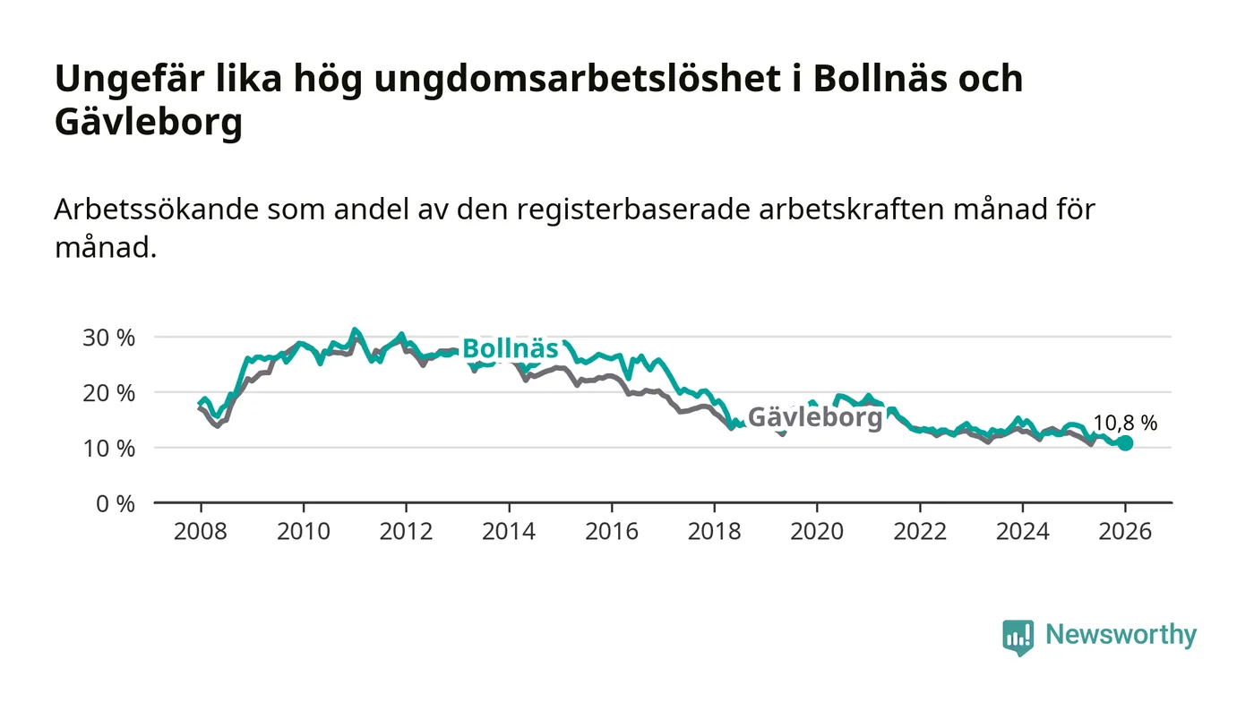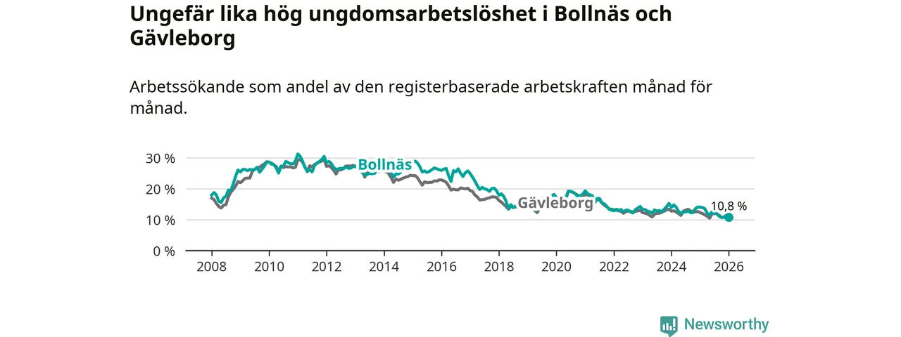 Medan Bollnäs har högre total arbetslöshet än Gävleborg, ligger ungdomsarbetslösheten på i stort sett samma nivå.