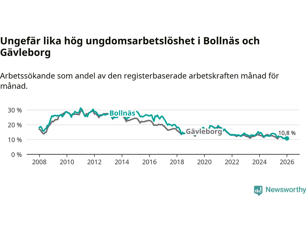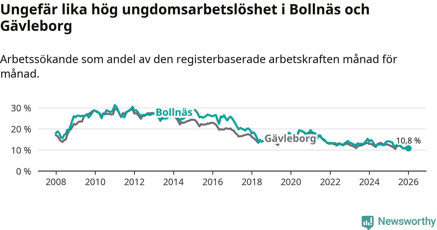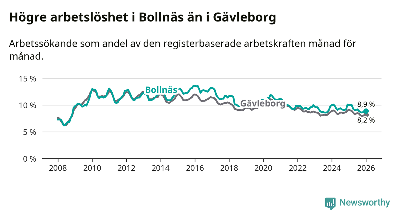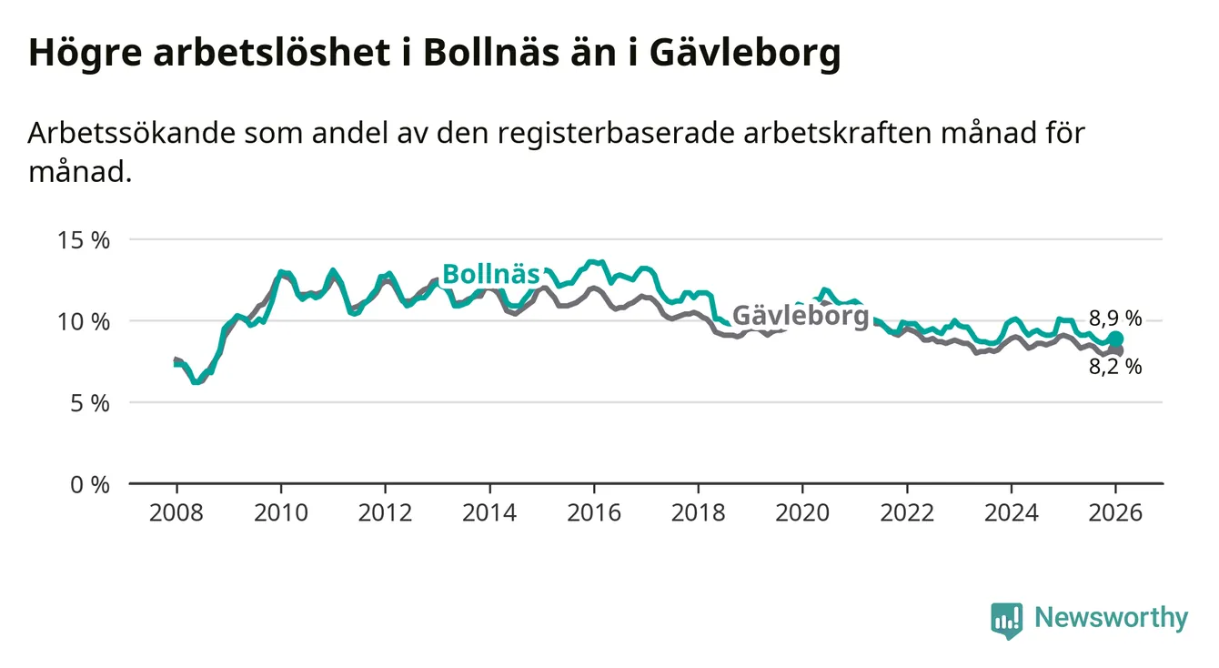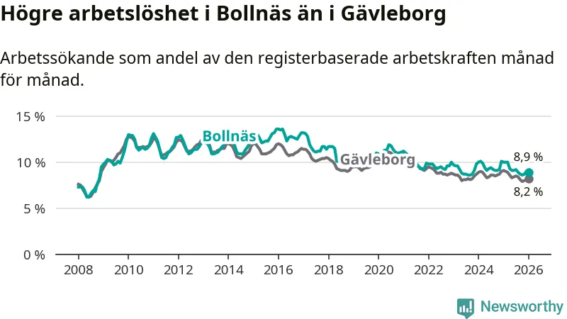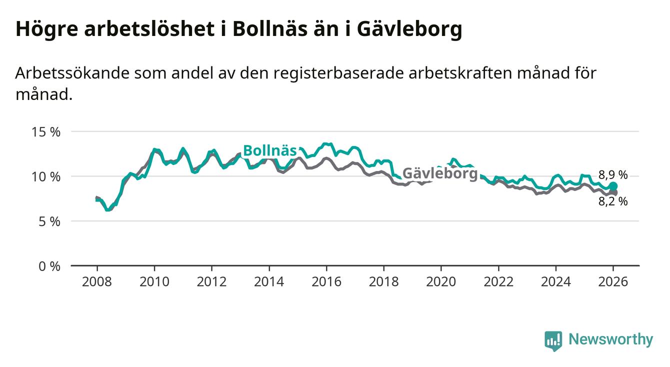 Medan Bollnäs har högre total arbetslöshet än Gävleborg, ligger ungdomsarbetslösheten på i stort sett samma nivå.