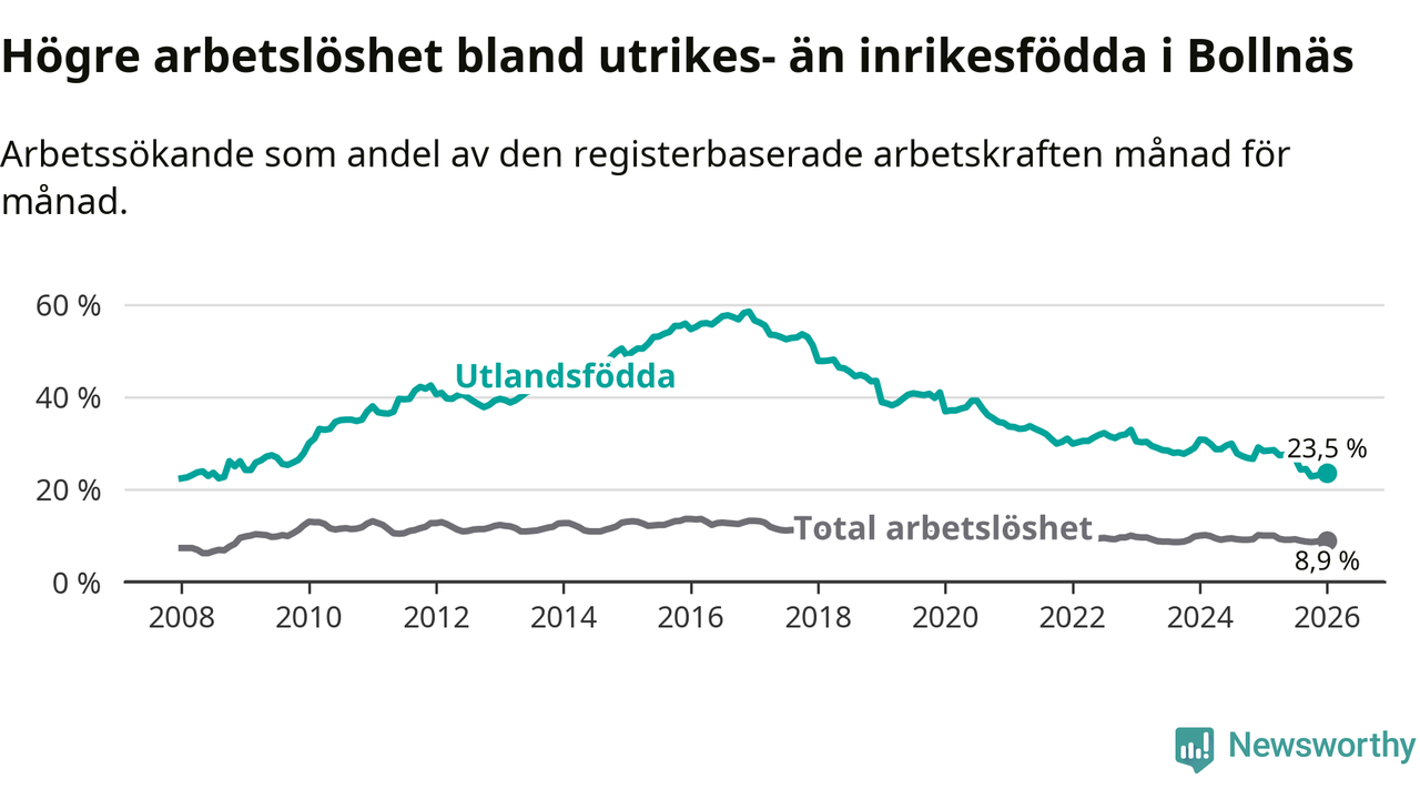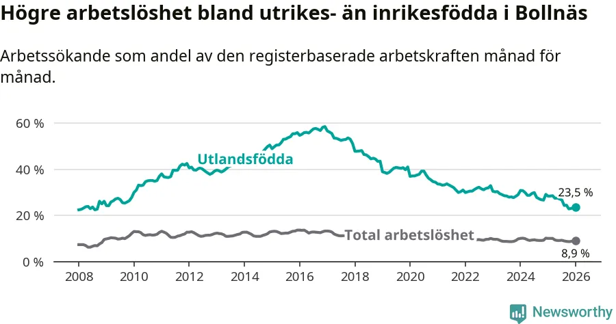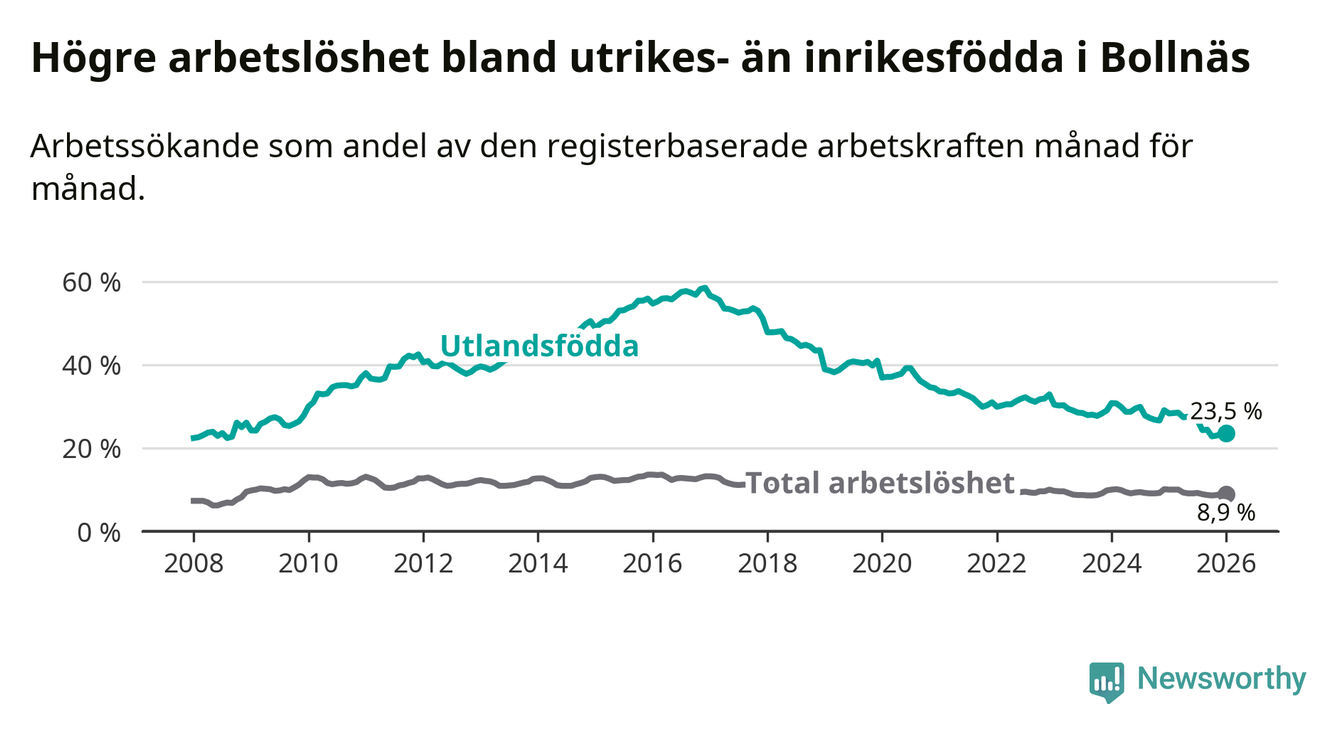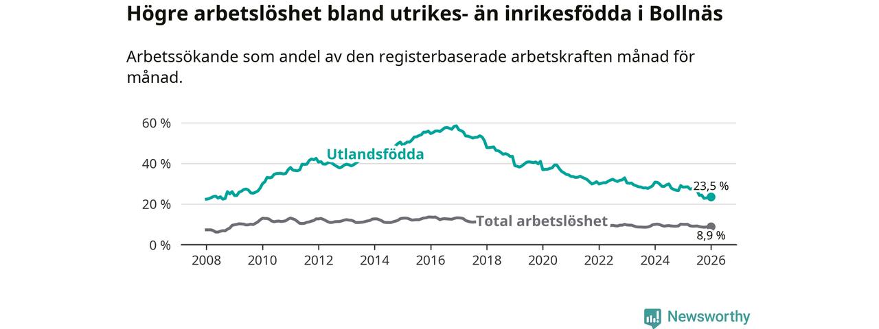 Arbetslösheten bland utlandsfödda var 23,5 procent i Bollnäs under januari månad, motsvarande 427 av 1 817 personer. Det är 4,8 procentenheter färre än vid samma tidpunkt i fjol (−88 om man räknar personer). Därmed är de utlandsföddas arbetslöshet lägre än vid samma tidpunkt i fjol för 13:e månaden i följd. Sedan december 2024 har arbetslösheten bland utlandsfödda minskat från 29,1 till 23,5 procent.