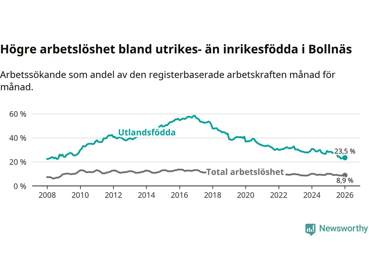 Skillnaden i arbetslöshet mellan utrikesfödda och hela befolkningen är 14,6 procentenheter i Bollnäs. Det är en betydligt mindre skillnad än för ett år sedan (−3,7 procentenheter).