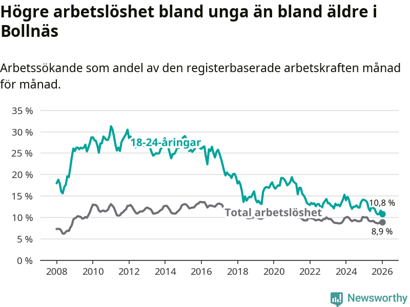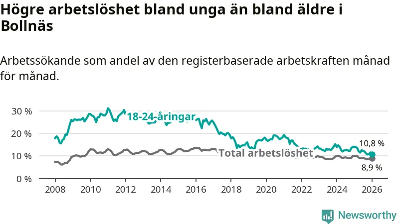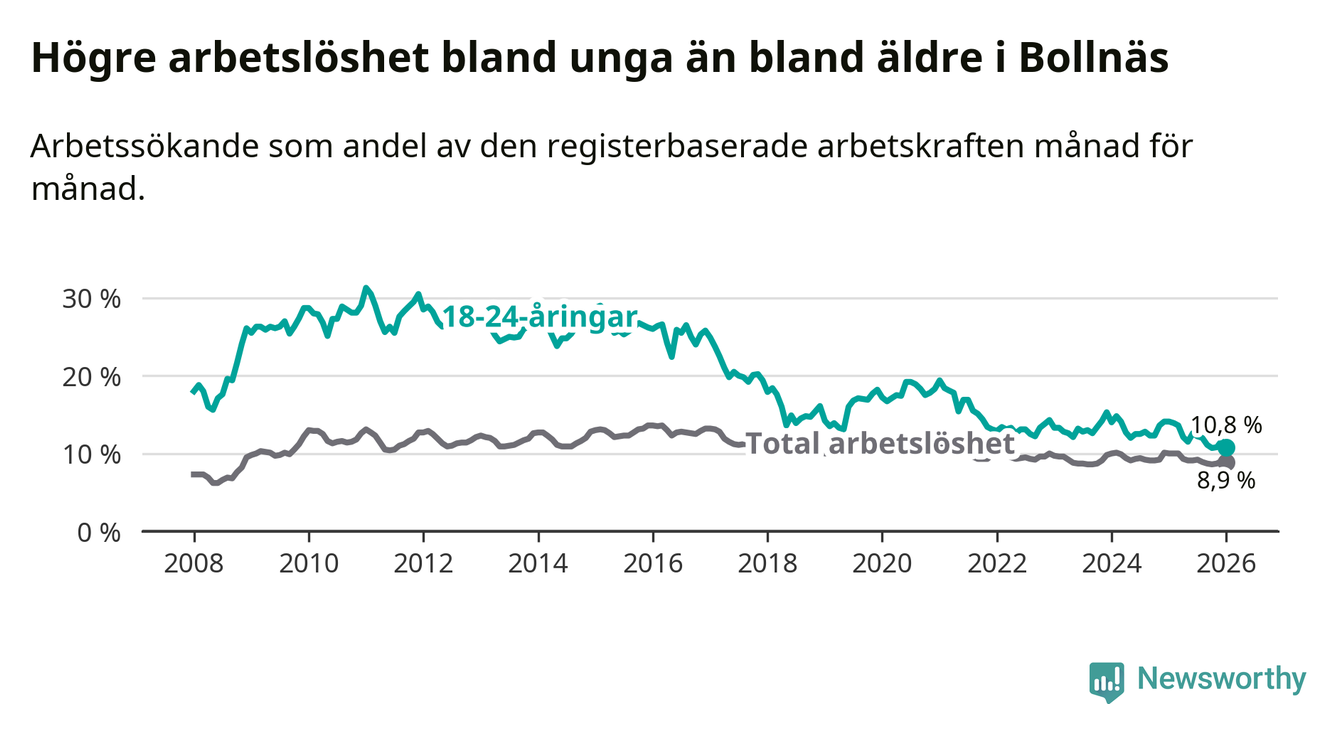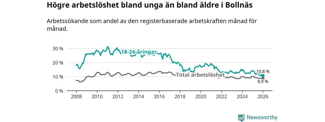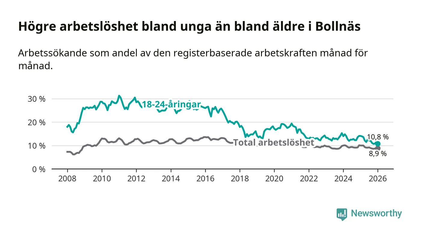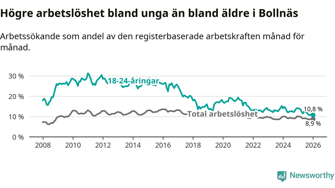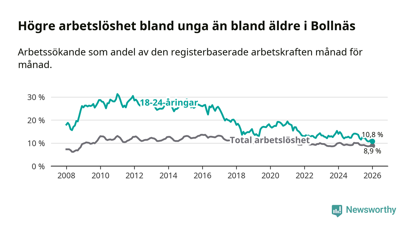 I och med den senaste månadens nedgång har de ungas arbetslöshet i Bollnäs sjunkit sju månader i följd (ner från 12,6 procent i juni 2025 till 10,8 procent nu).