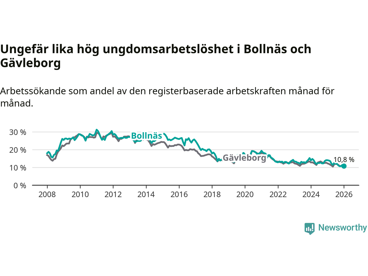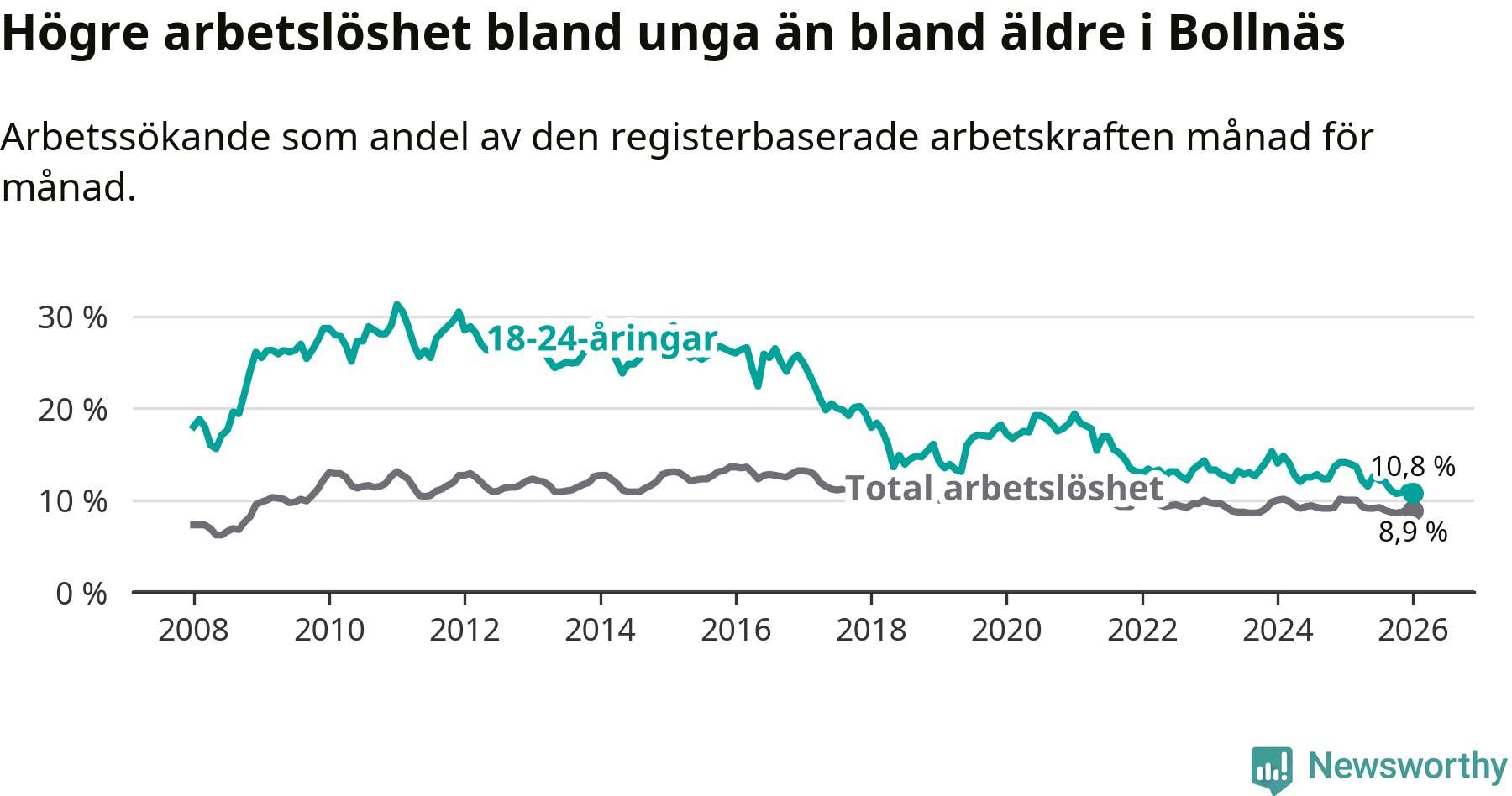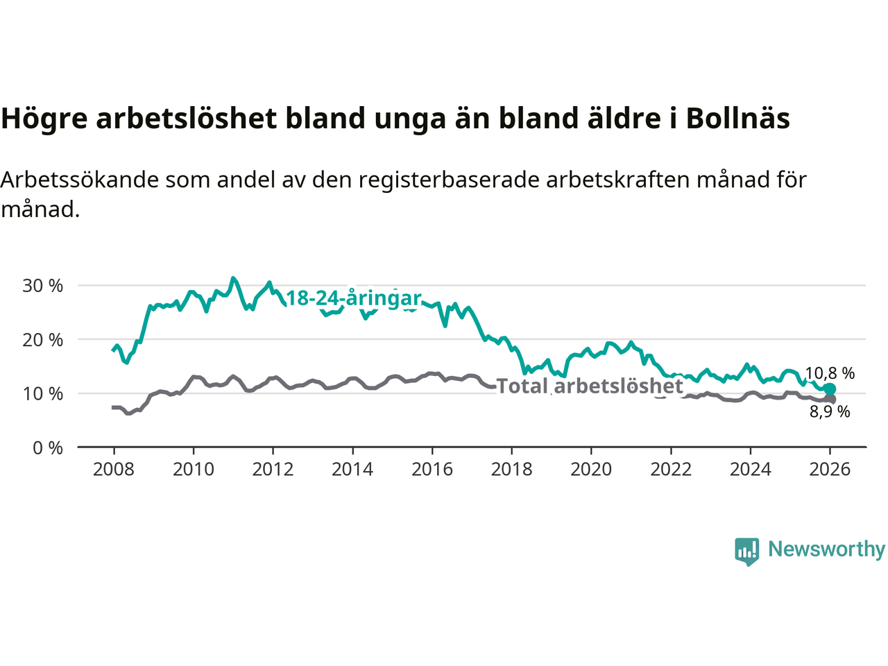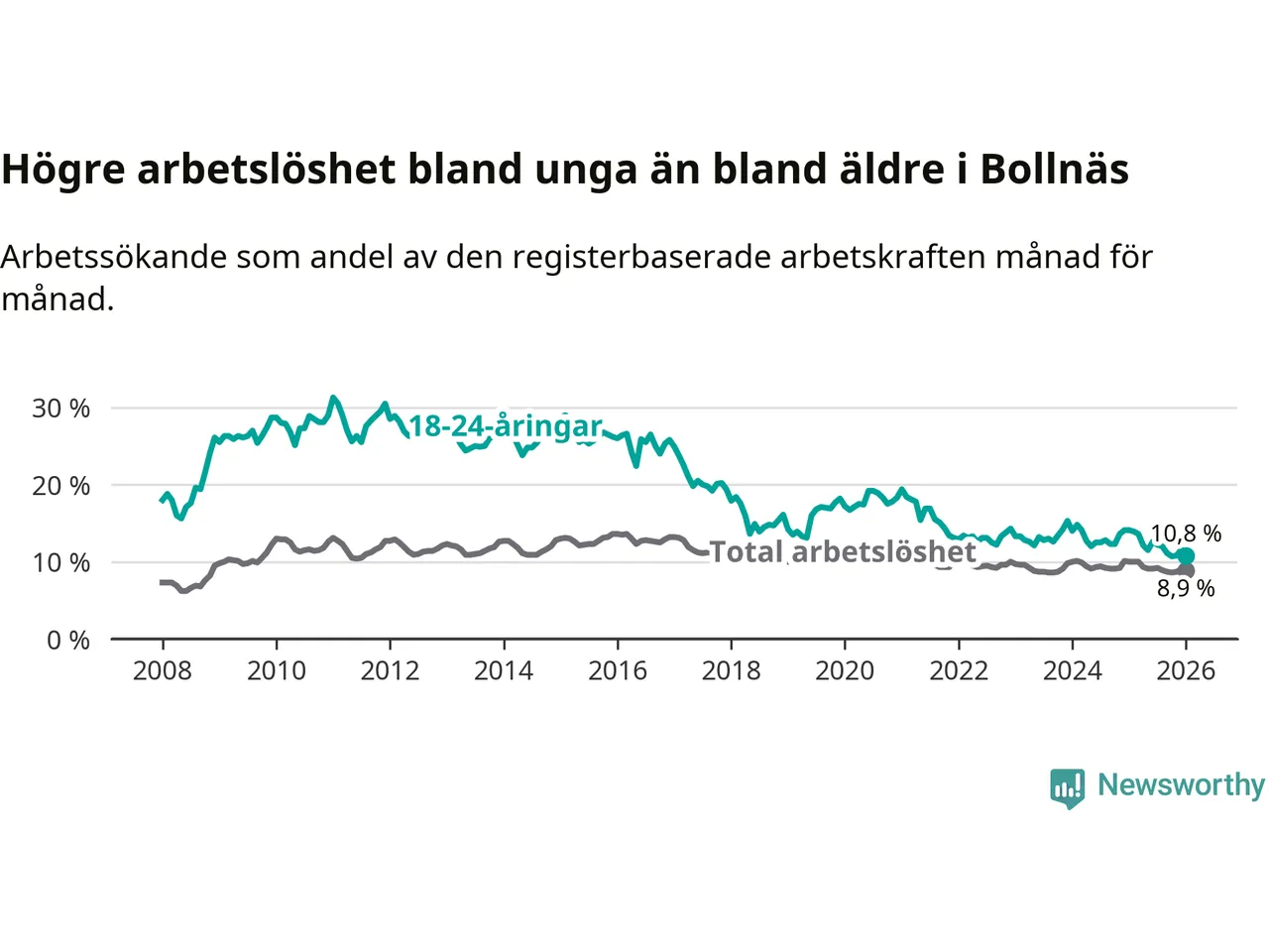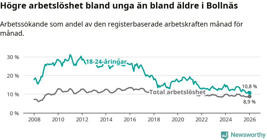 I och med den senaste månadens nedgång har de ungas arbetslöshet i Bollnäs sjunkit sju månader i följd (ner från 12,6 procent i juni 2025 till 10,8 procent nu).