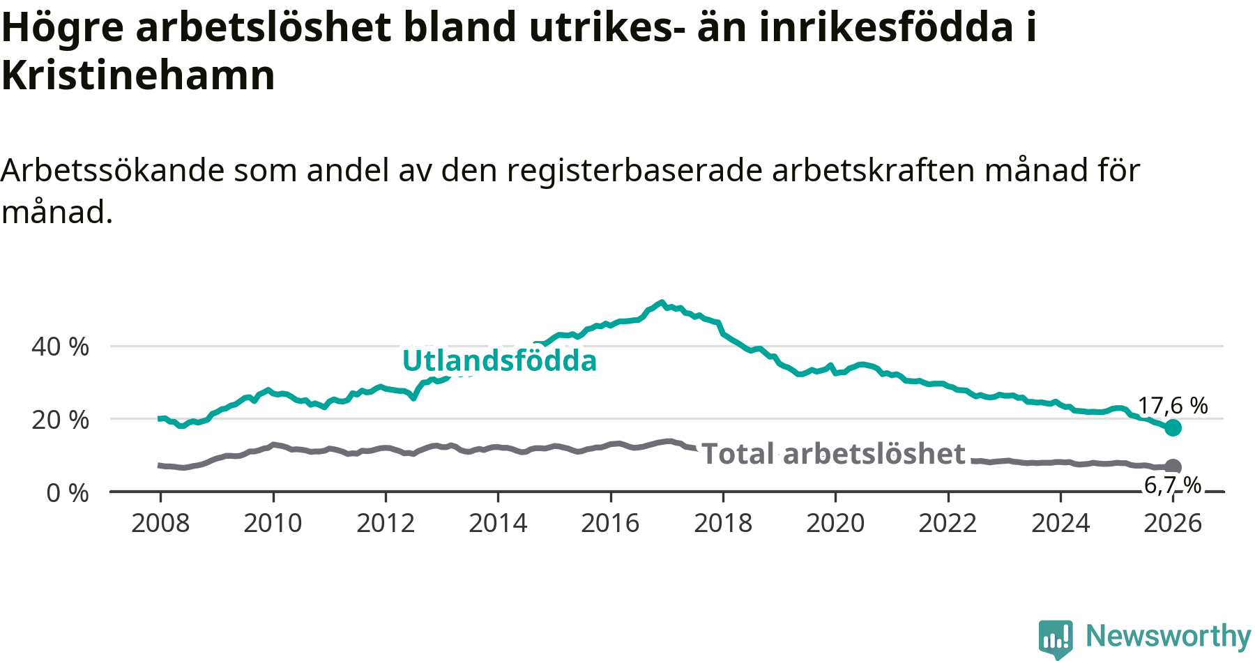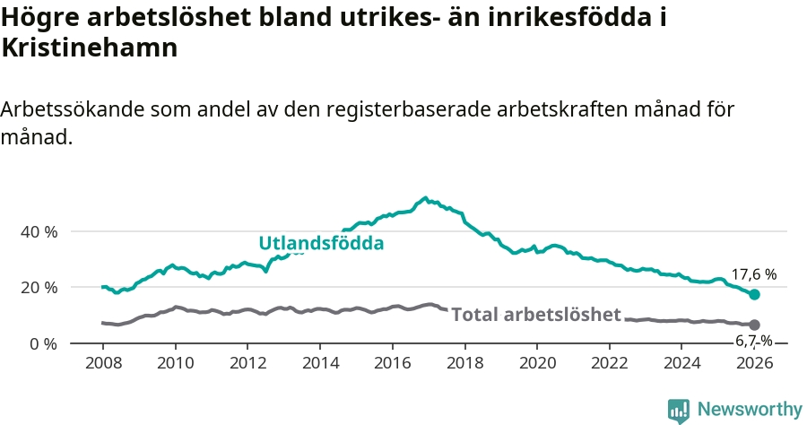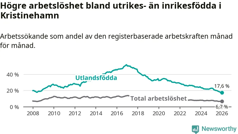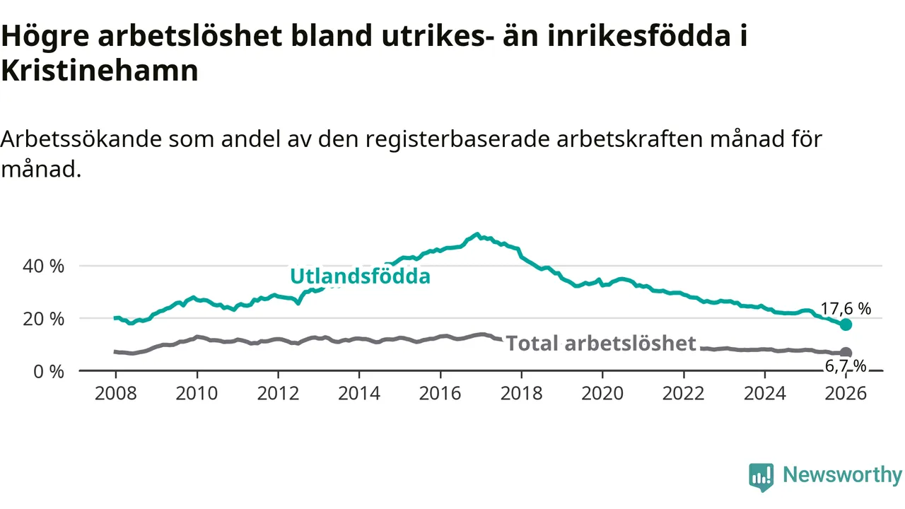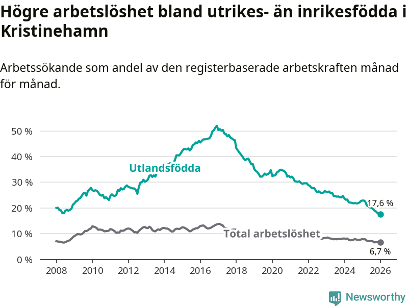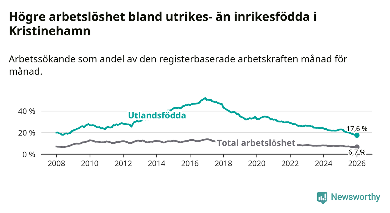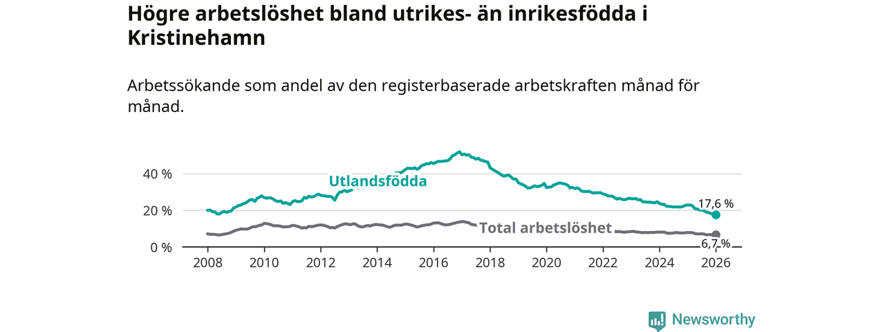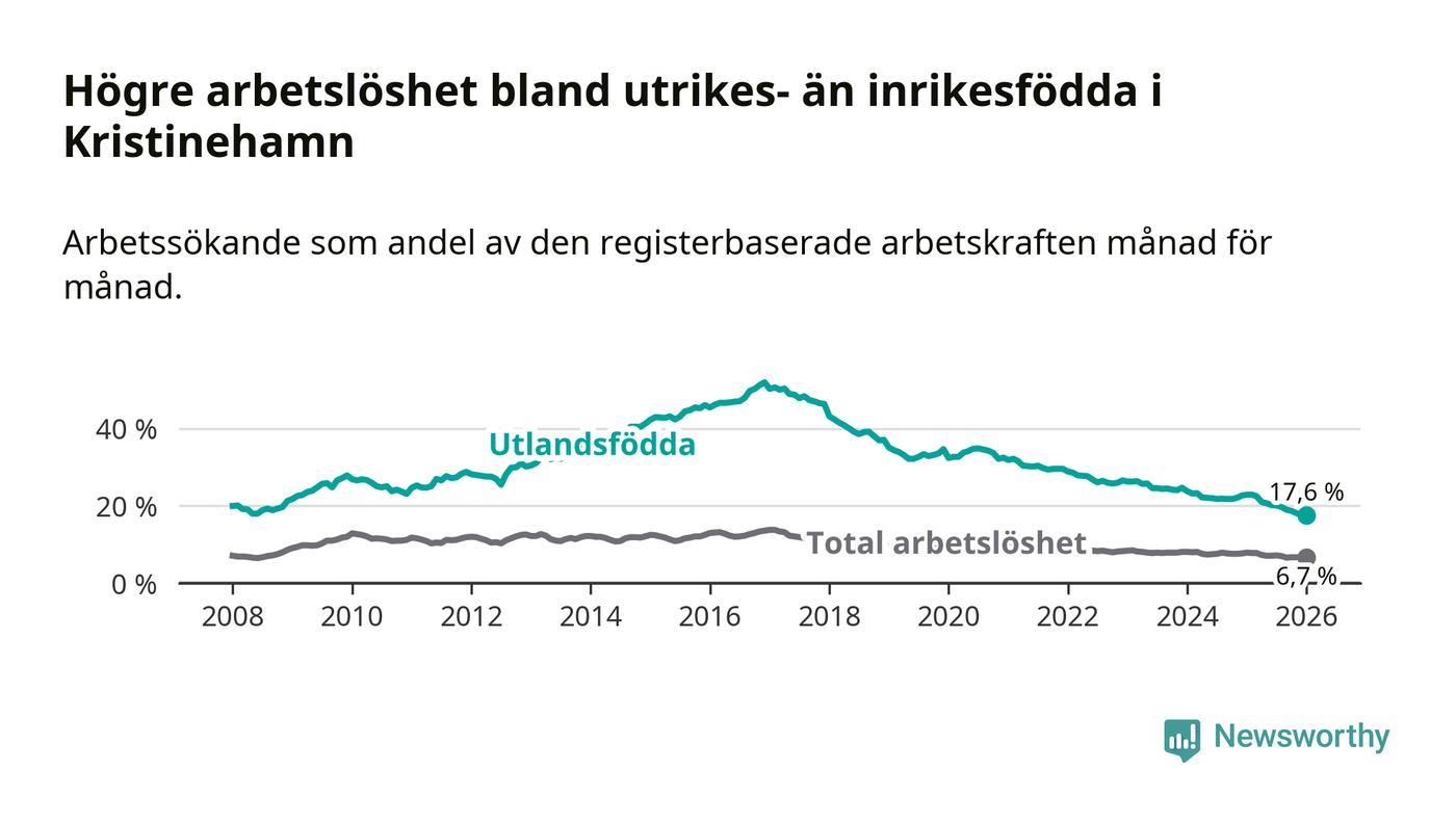 Arbetslösheten bland utlandsfödda var 17,6 procent i Kristinehamn under januari månad, motsvarande 311 av 1 767 personer. Det är 5,3 procentenheter färre än vid samma tidpunkt i fjol (−91 om man räknar personer). Därmed har de utlandsföddas arbetslöshet varit lägre än vid samma tidpunkt i fjol i över fem år i sträck. Sedan oktober 2020 har arbetslösheten bland utlandsfödda minskat från 33,7 till 17,6 procent. Den nuvarande arbetslöshetsnivån är den lägsta sedan januari 2008.