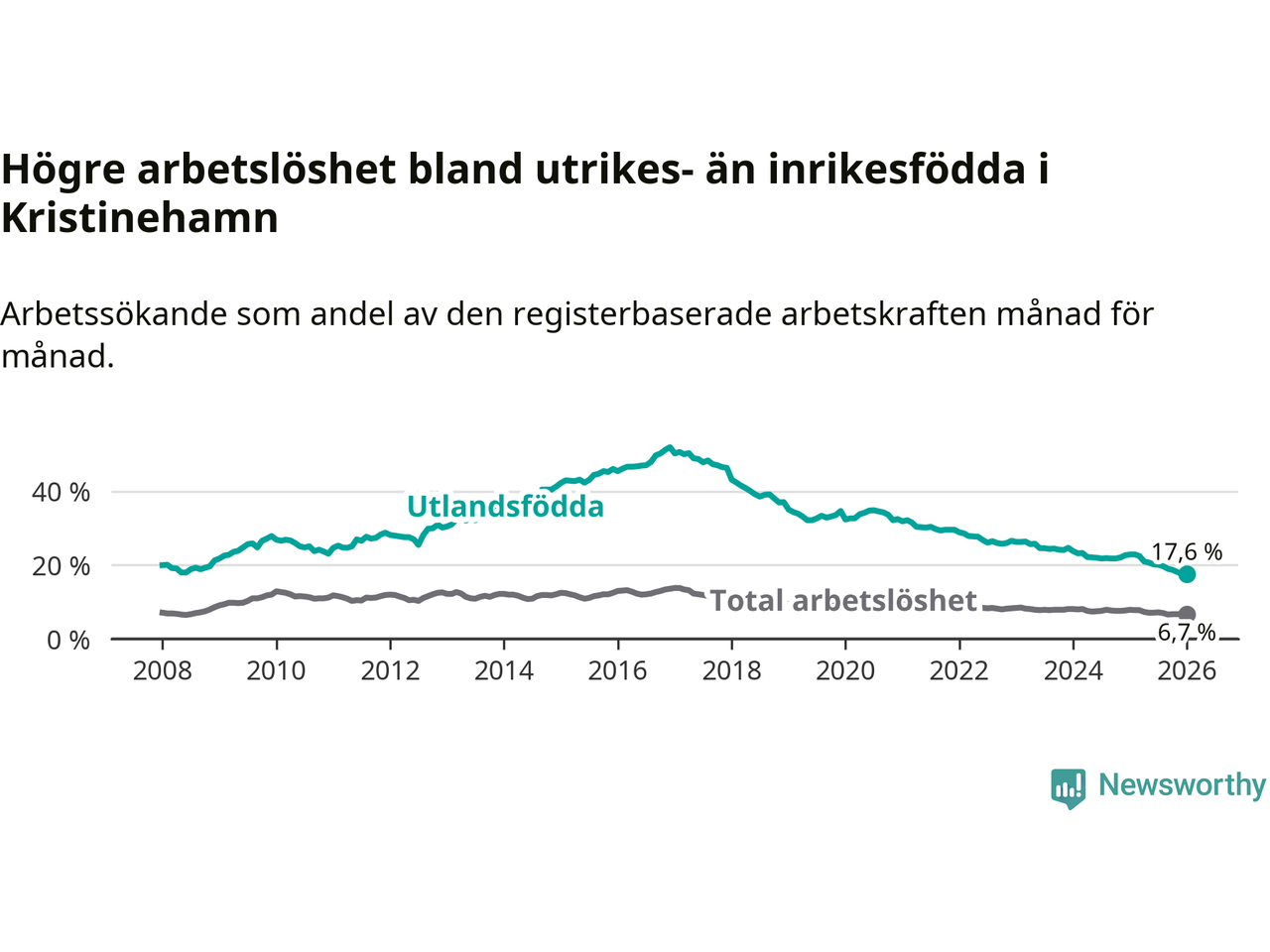 | Bland utlandsfödda | 17,6 % | −5,3 % ▼ | 14,3 % | −1,9 % ▼ | 14,3 % | −1,5 % ▼ |