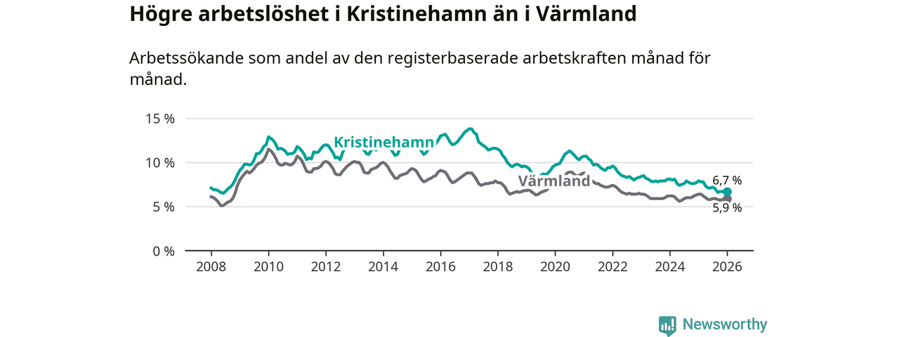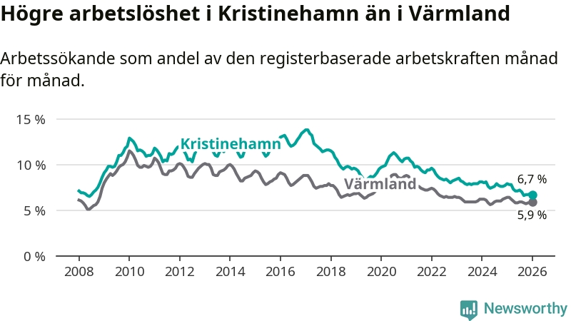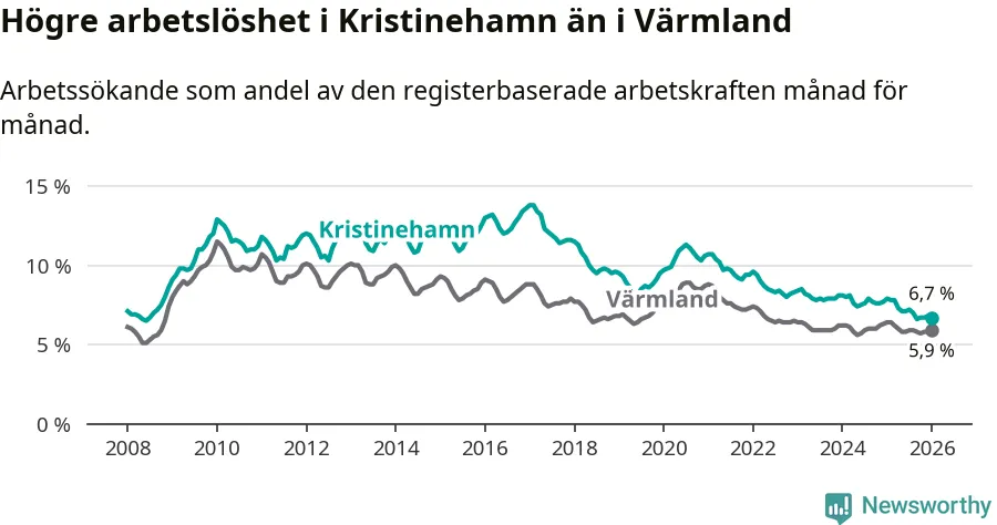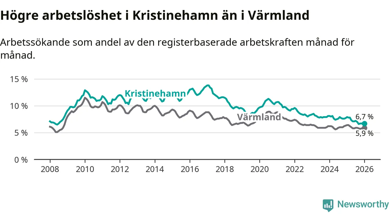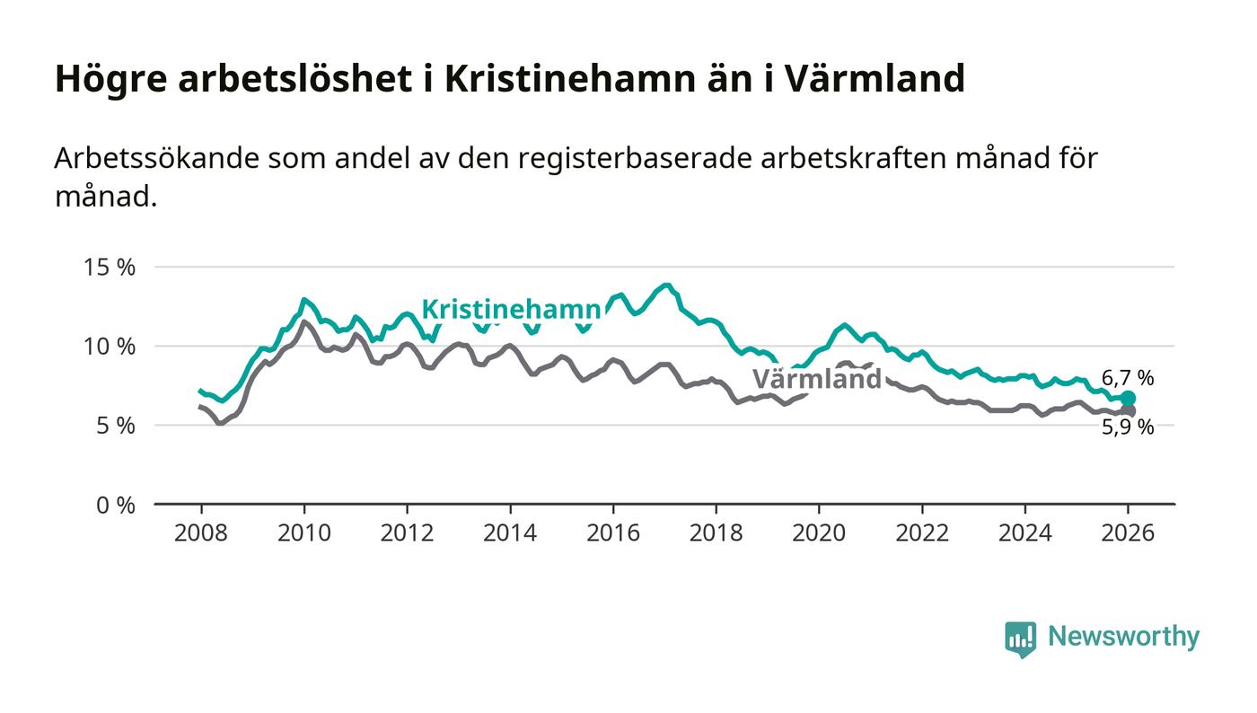 Under januari månad rapporterade Kristinehamns kommun en total arbetslöshet på 6,7 procent. Det är en minskning jämfört med samma tidpunkt i fjol (−1,2 procentenheter). Även i Värmlands län sjunker arbetslösheten .