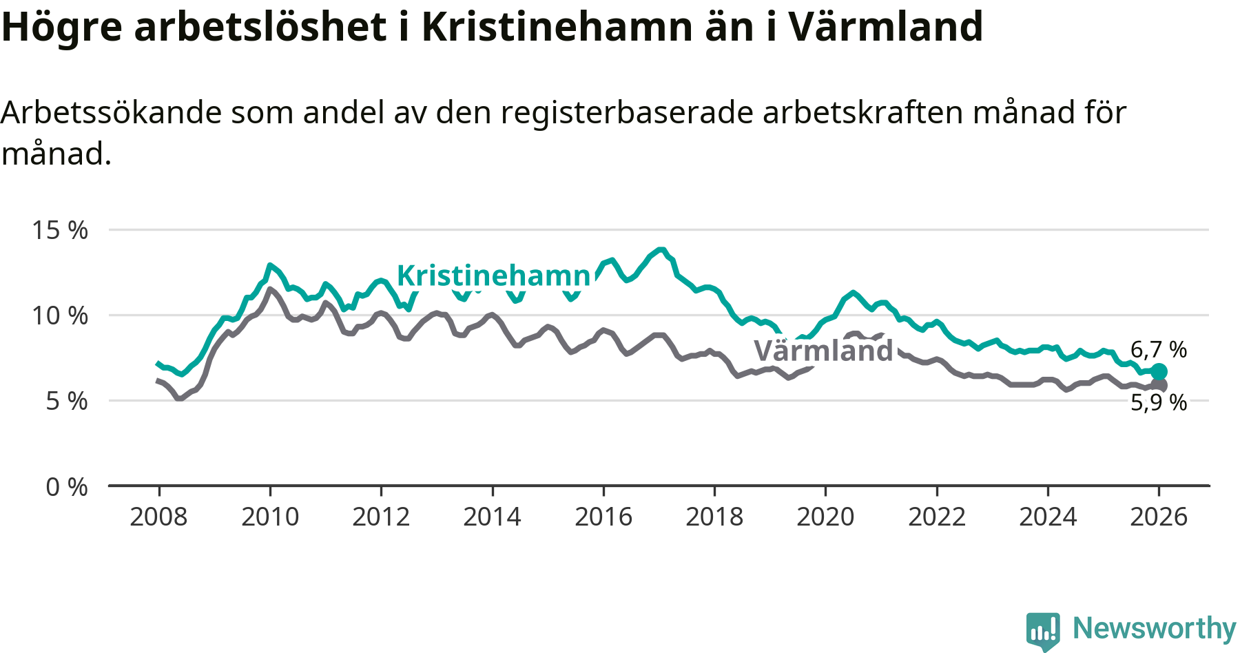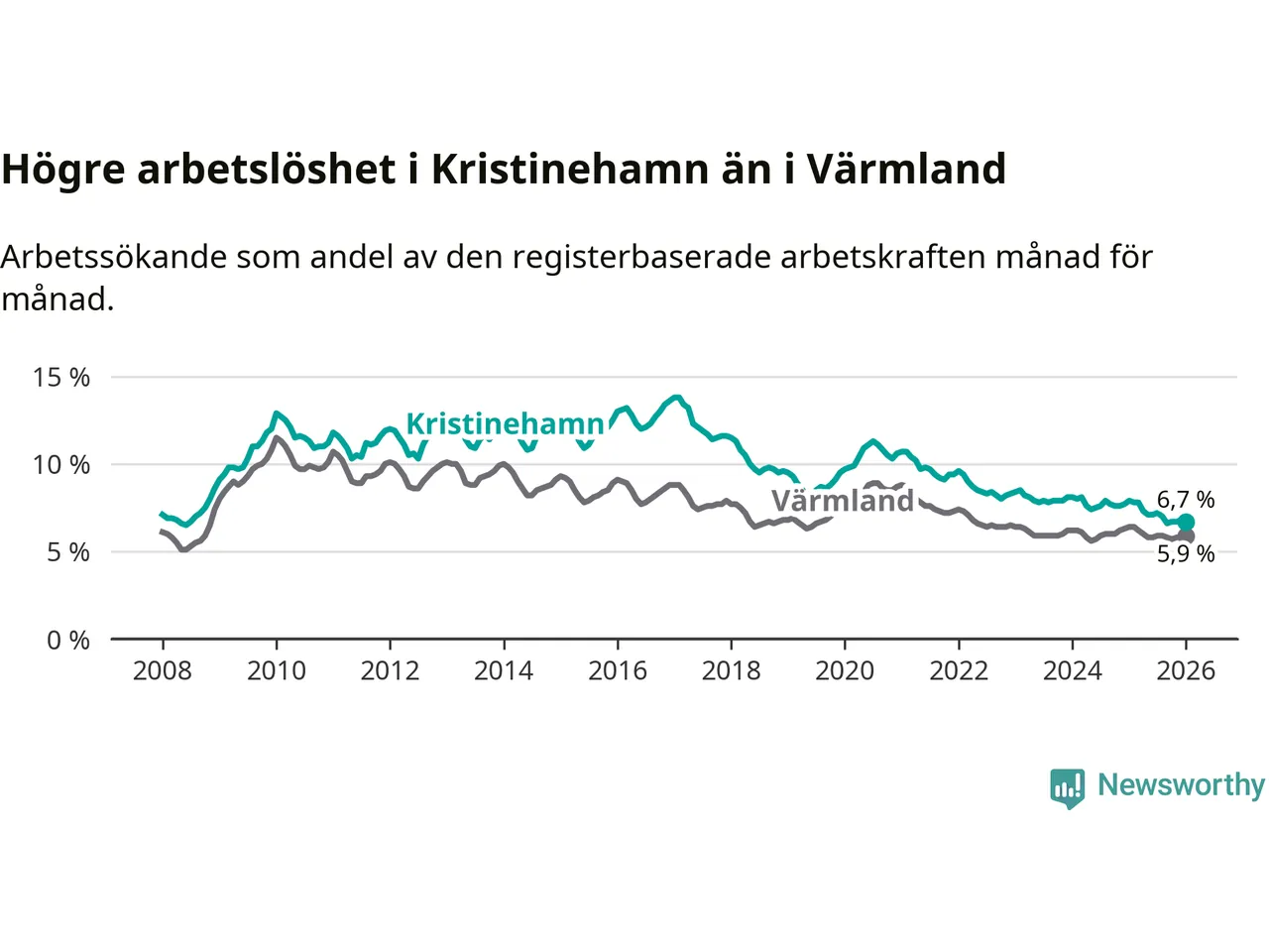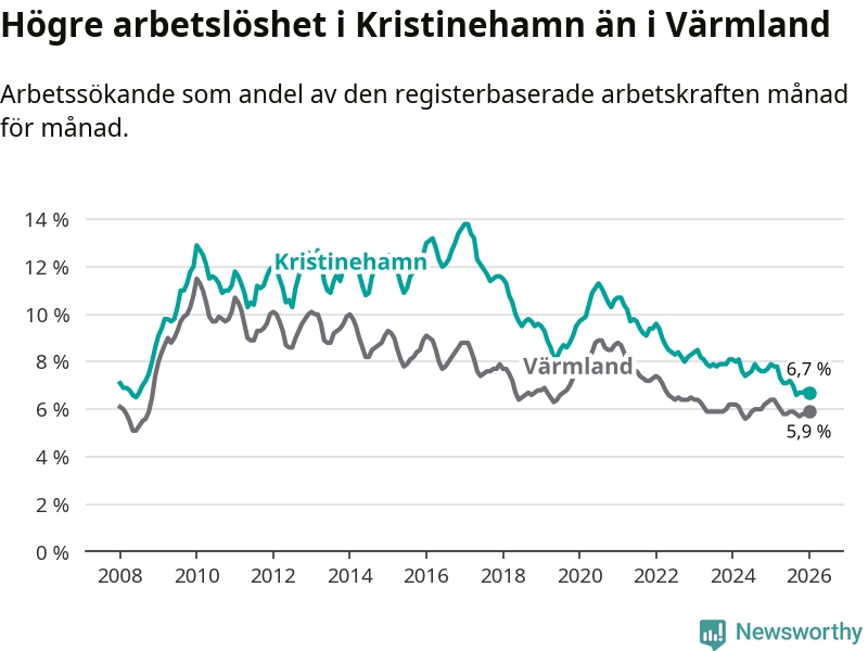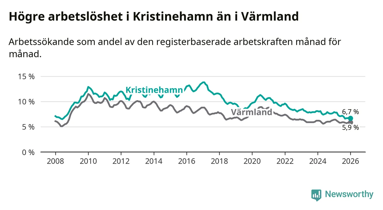 Under januari månad rapporterade Kristinehamns kommun en total arbetslöshet på 6,7 procent. Det är en minskning jämfört med samma tidpunkt i fjol (−1,2 procentenheter). Även i Värmlands län sjunker arbetslösheten .