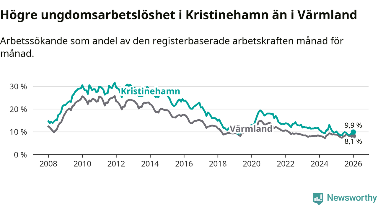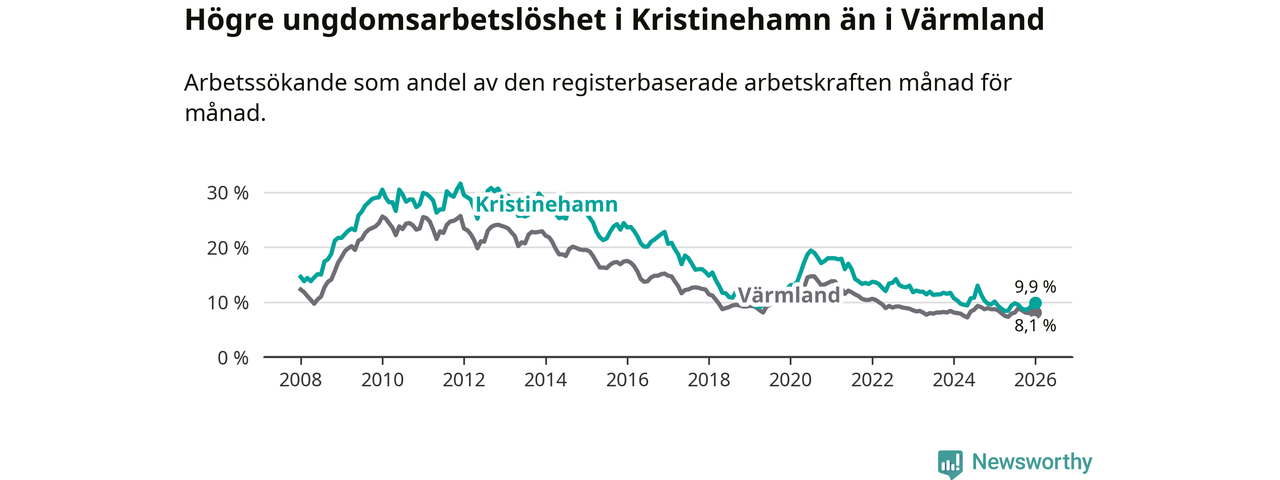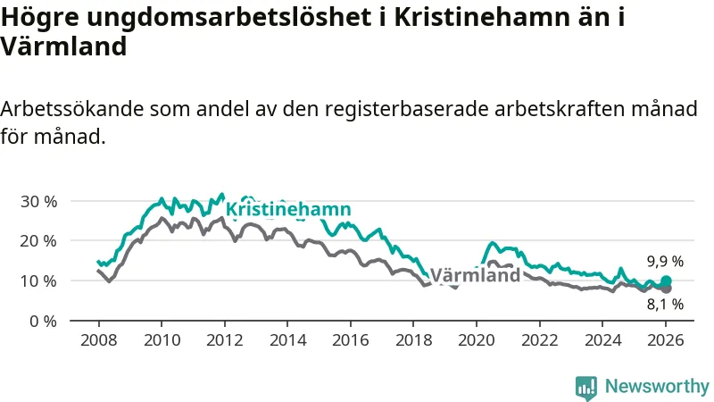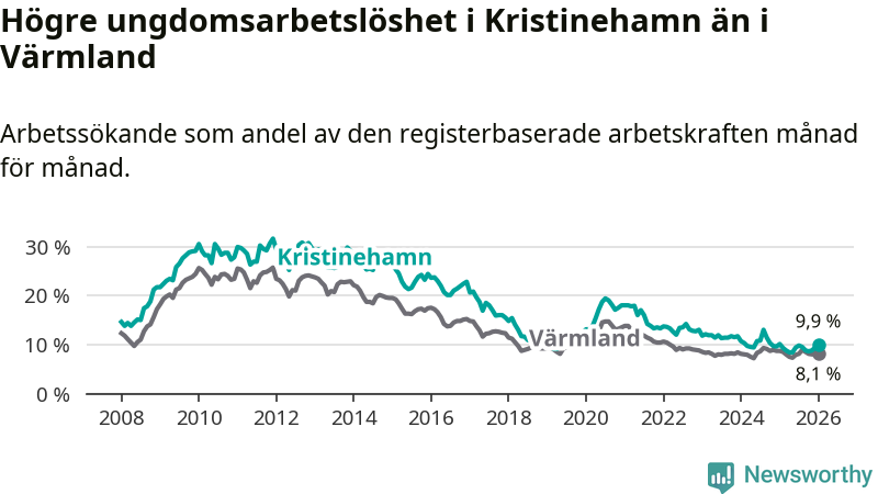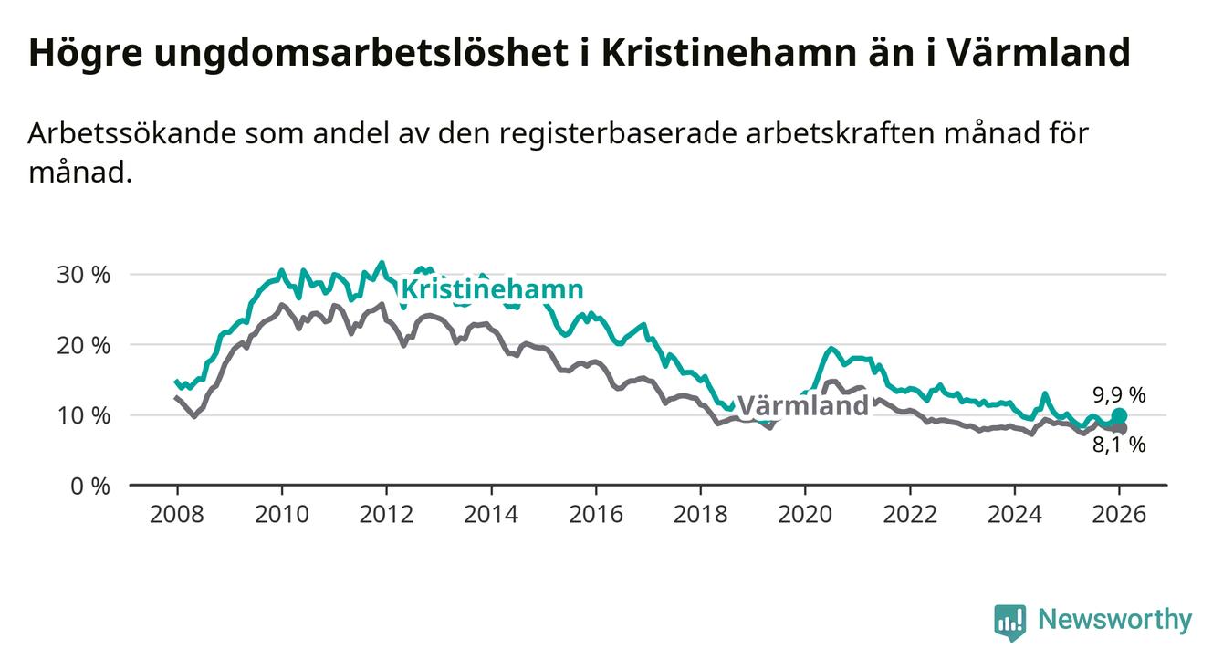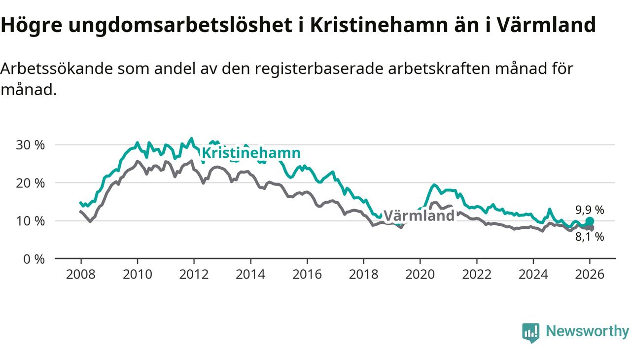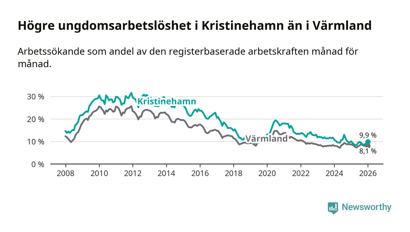Precis som den totala arbetslösheten ligger ungdomsarbetslösheten i Kristinehamn högre än i Värmland som helhet. Skillnaden mellan kommunen och länet är 1,8 procentenheter.