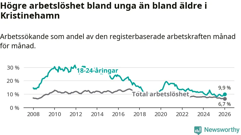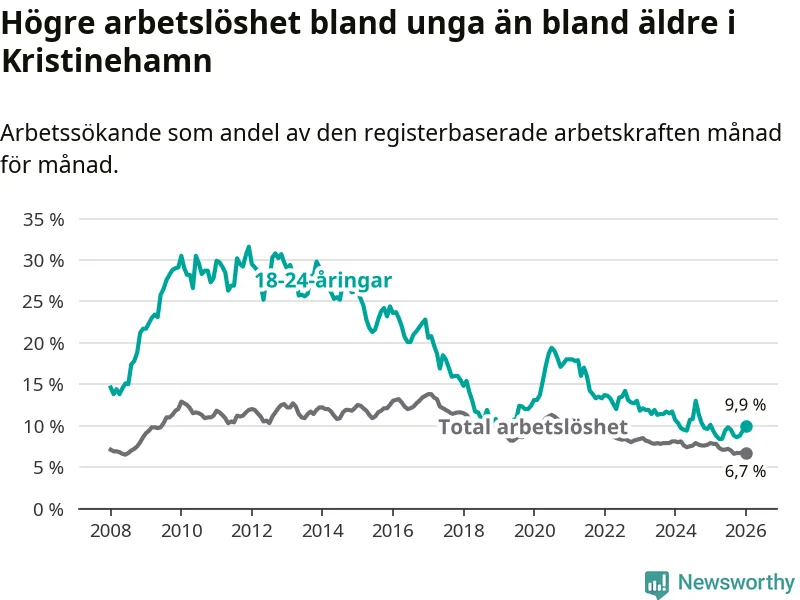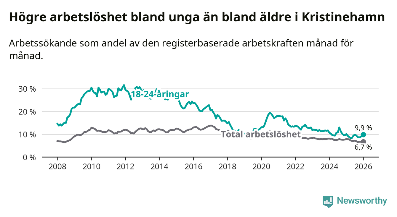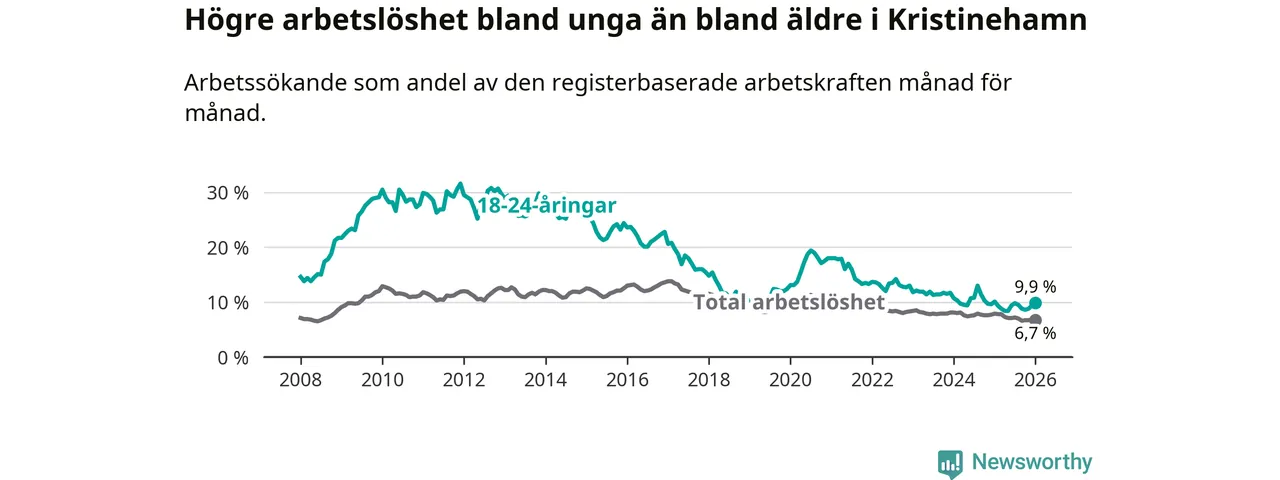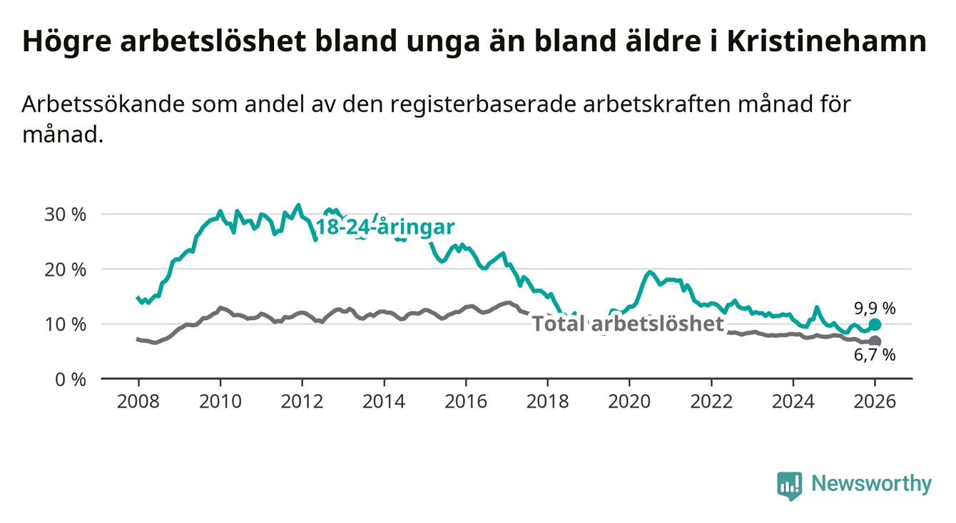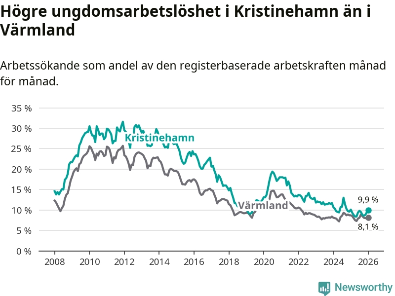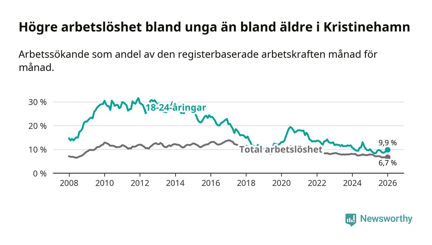 Precis som den totala arbetslösheten ligger ungdomsarbetslösheten i Kristinehamn högre än i Värmland som helhet. Skillnaden mellan kommunen och länet är 1,8 procentenheter.