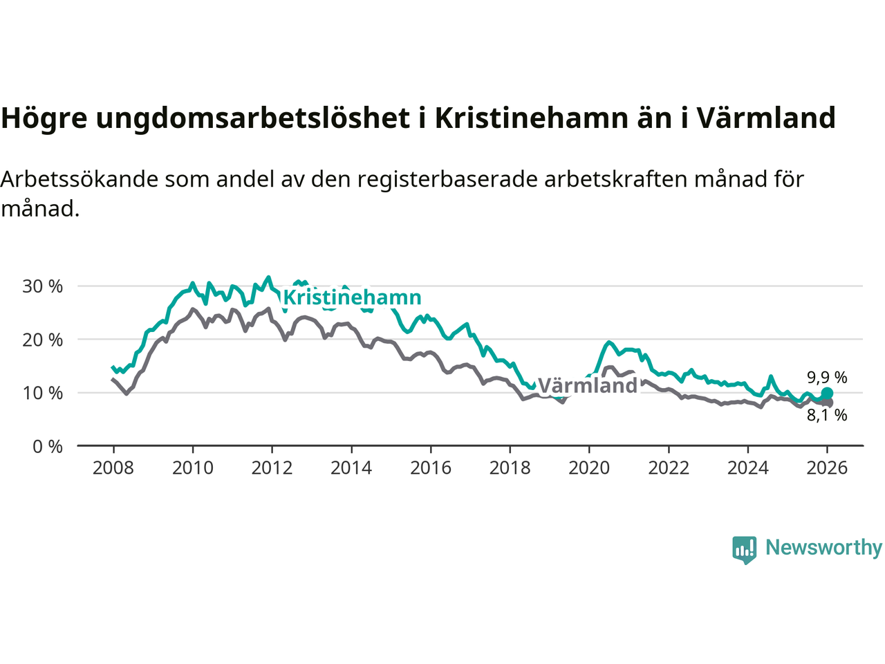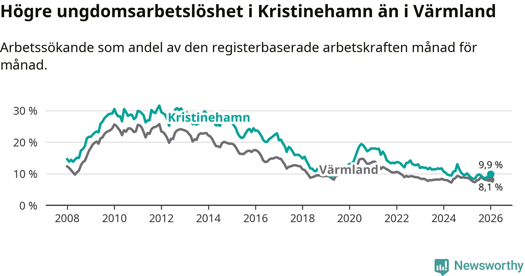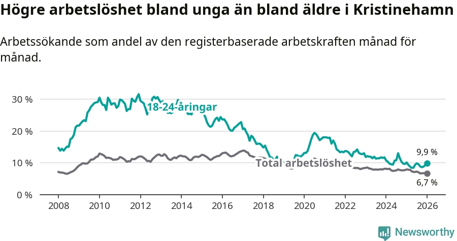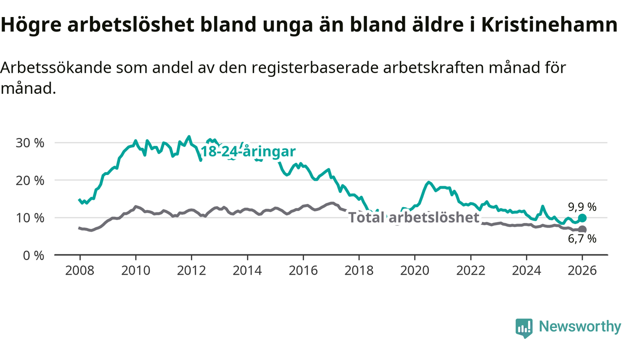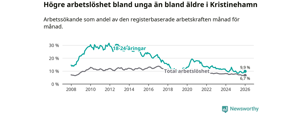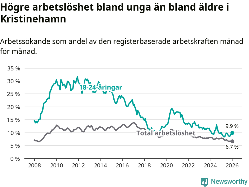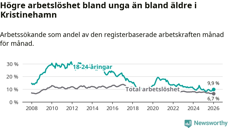 Precis som den totala arbetslösheten ligger ungdomsarbetslösheten i Kristinehamn högre än i Värmland som helhet. Skillnaden mellan kommunen och länet är 1,8 procentenheter.