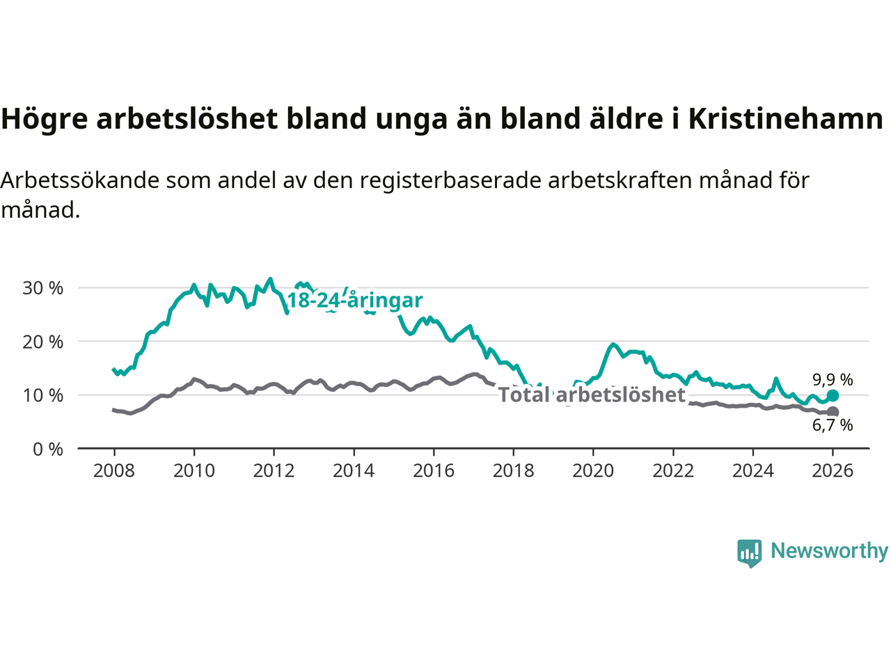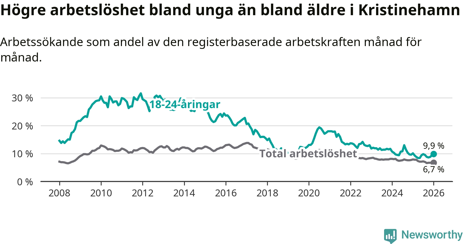 Precis som den totala arbetslösheten sjunker arbetslösheten bland unga (−0,2 procentenheter). I januari var 9,9 procent av 18–24-åringarna inskrivna som arbetssökande (motsvarande 103 personer). Mäter vi antalet inskrivna ser vi en minskning med ett personer på ett års sikt.