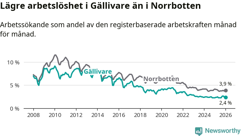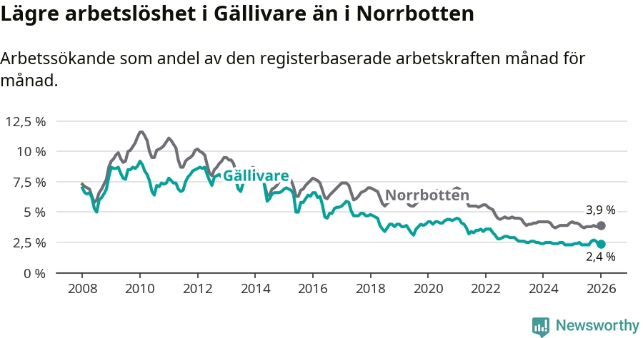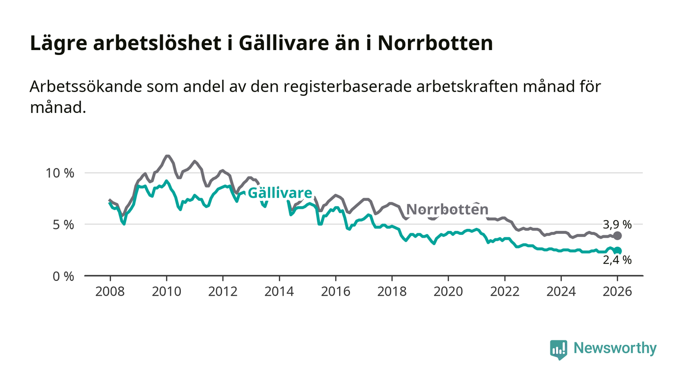 Även om arbetslösheten i Gällivare alltså ökar, så ligger den fortfarande under snittet i hela Norrbottens län (2,4 procent i kommunen, jämfört med 3,9 procent i hela länet). Gällivare har därmed även den lägsta arbetslöshetsnivån i inte bara länet, utan även hela Sverige. Haparanda har den högsta (7,1 procent).