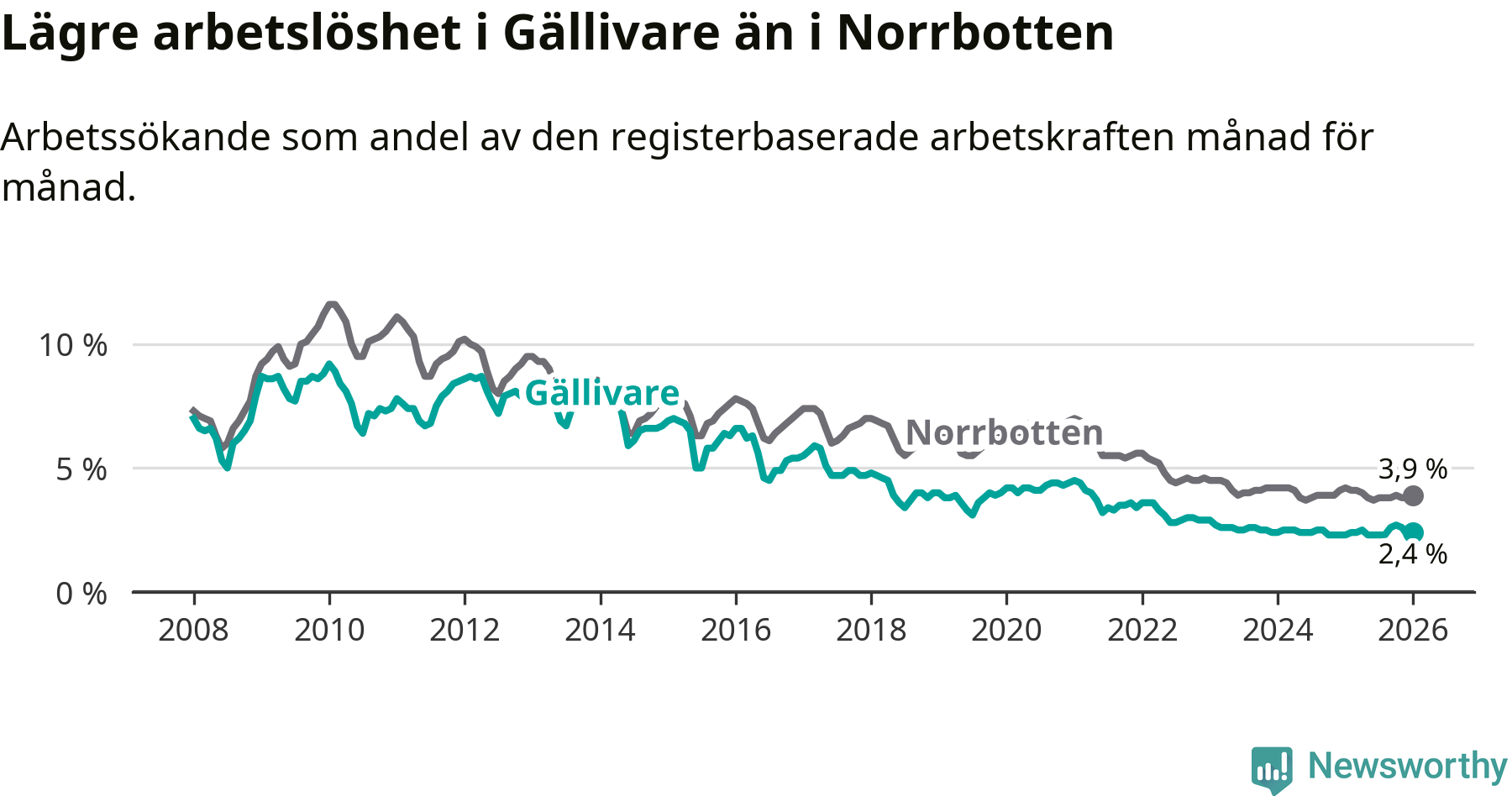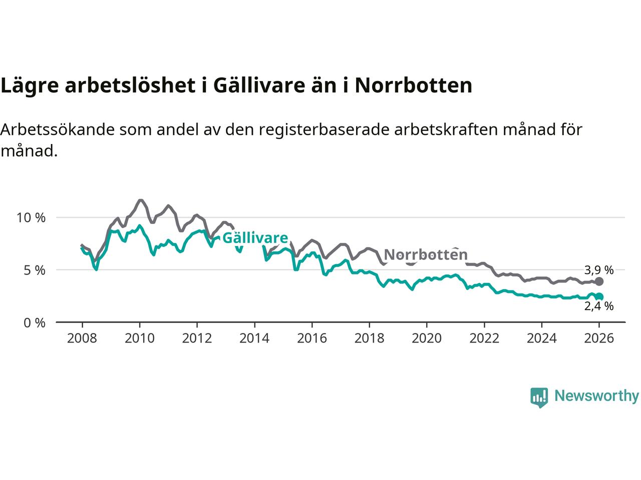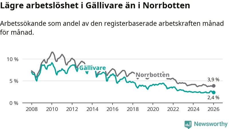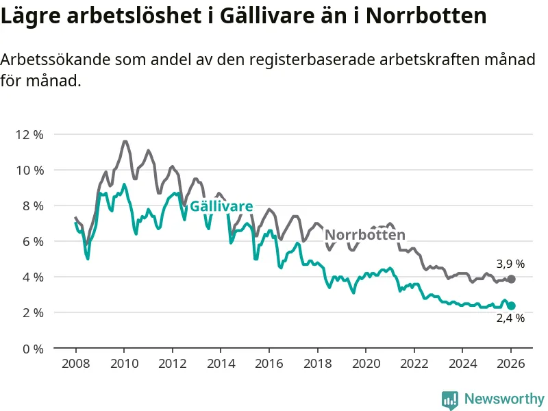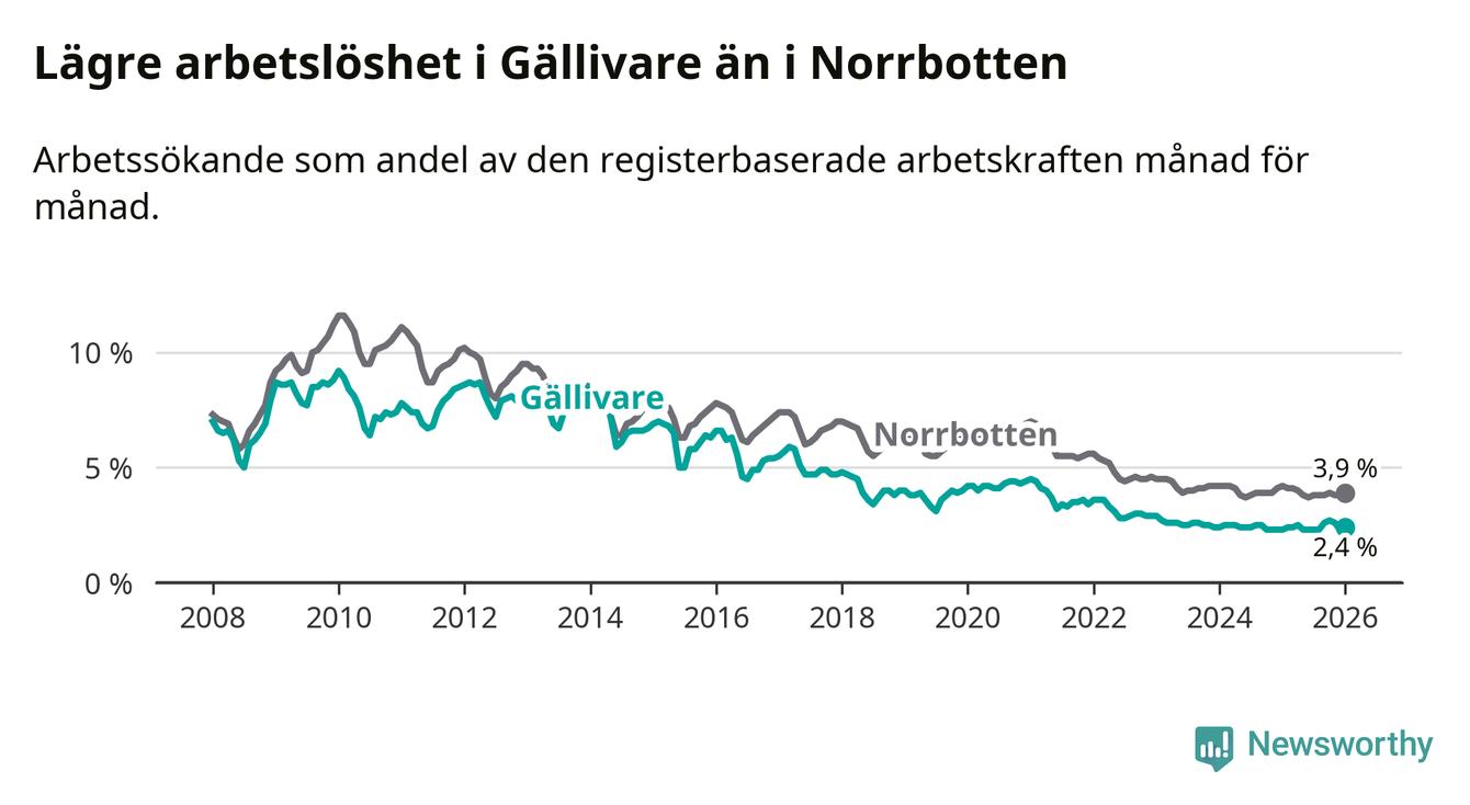 Under januari månad rapporterade Gällivare kommun en total arbetslöshet på 2,4 procent. Det är en ökning jämfört med samma tidpunkt i fjol (+0,1 procentenheter). I Norrbottens län däremot sjunker arbetslösheten .