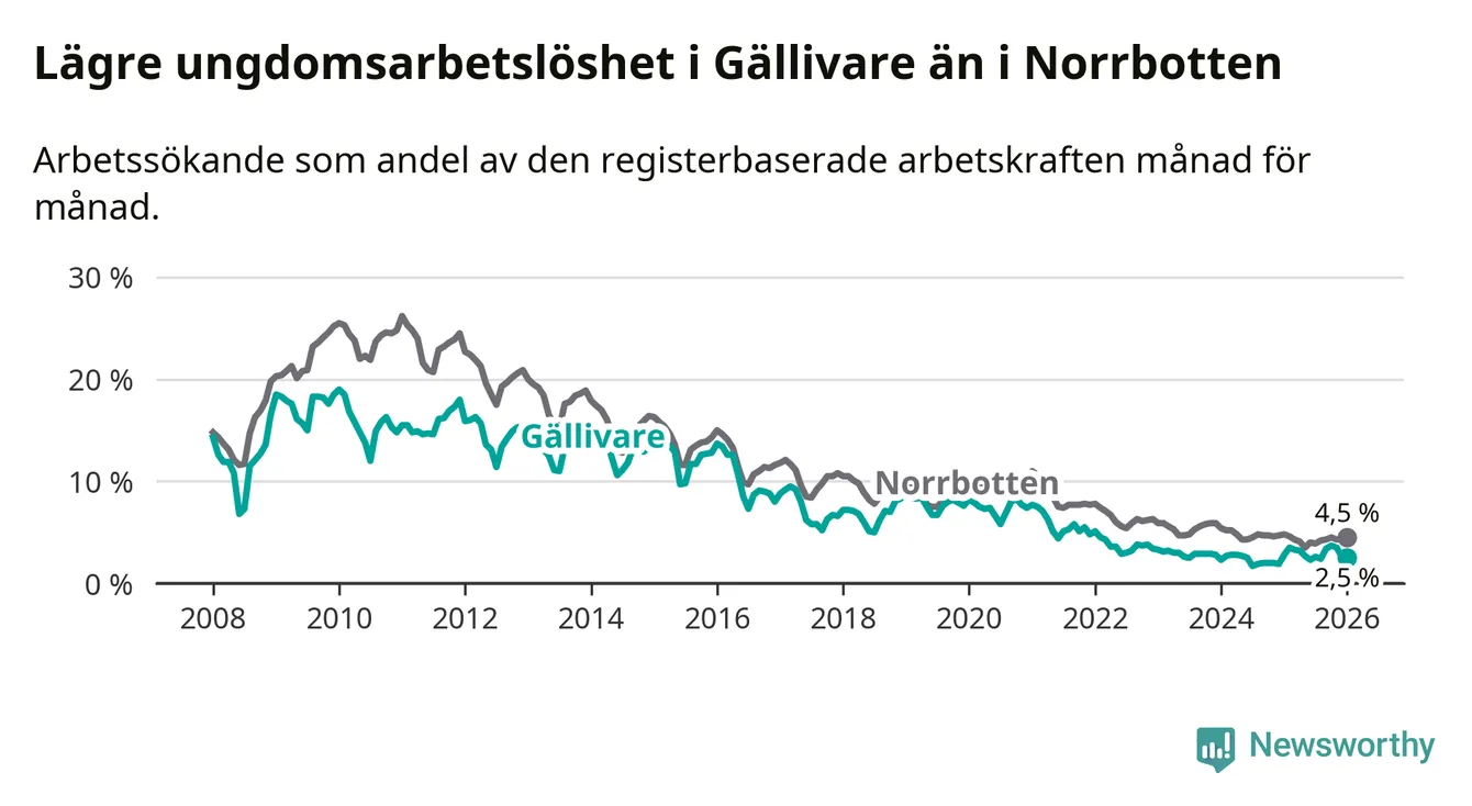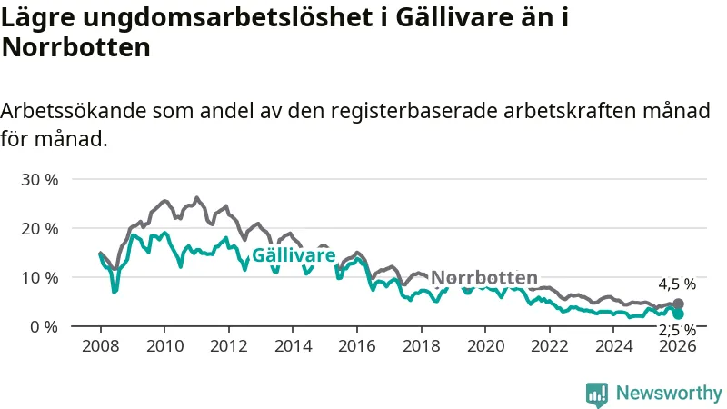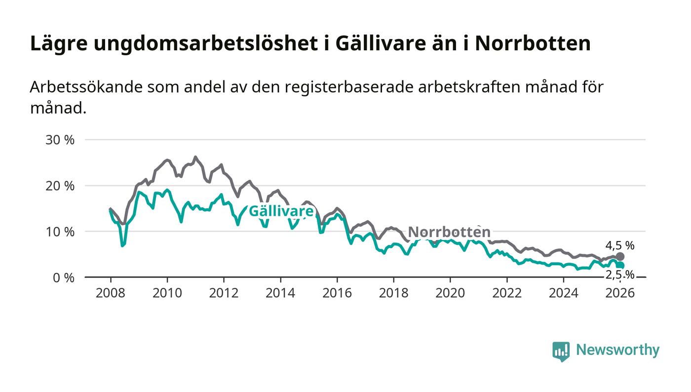 Precis som den totala arbetslösheten ligger ungdomsarbetslösheten i Gällivare lägre än i Norrbotten som helhet. Skillnaden mellan kommunen och länet är 2,0 procentenheter.