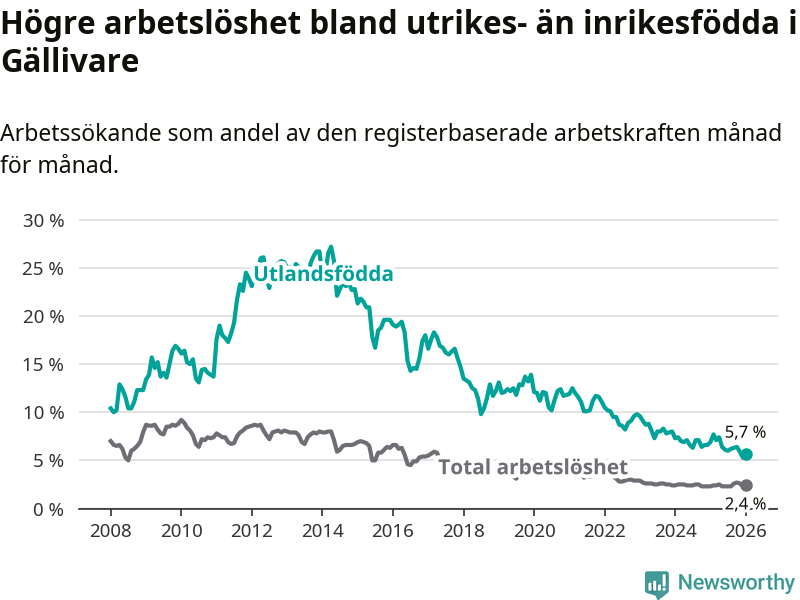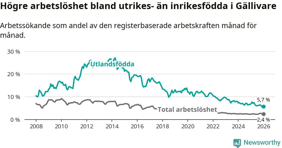 Skillnaden i arbetslöshet mellan utrikesfödda och hela befolkningen är 3,3 procentenheter i Gällivare. Det är en mindre skillnad än för ett år sedan (−1,3 procentenheter).