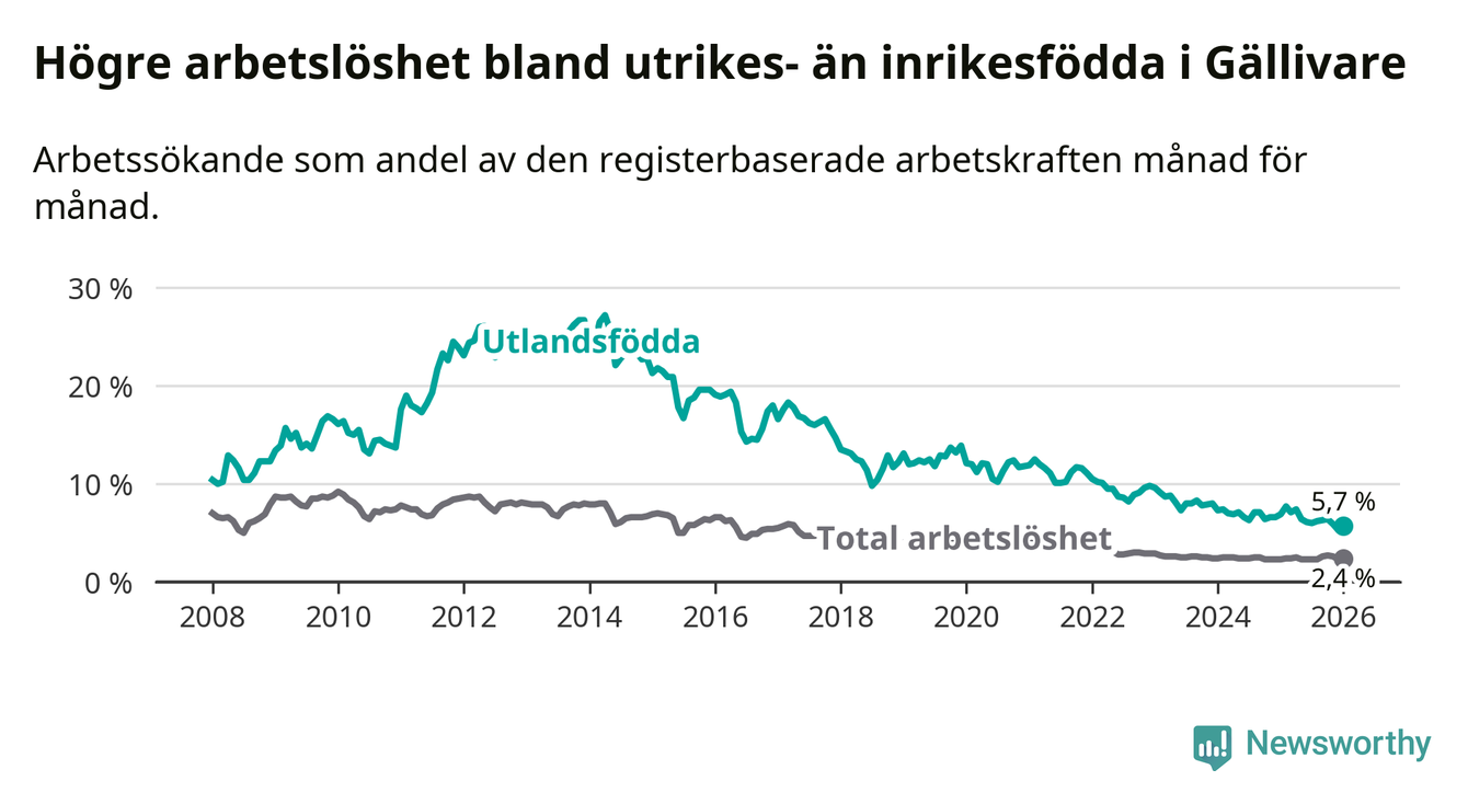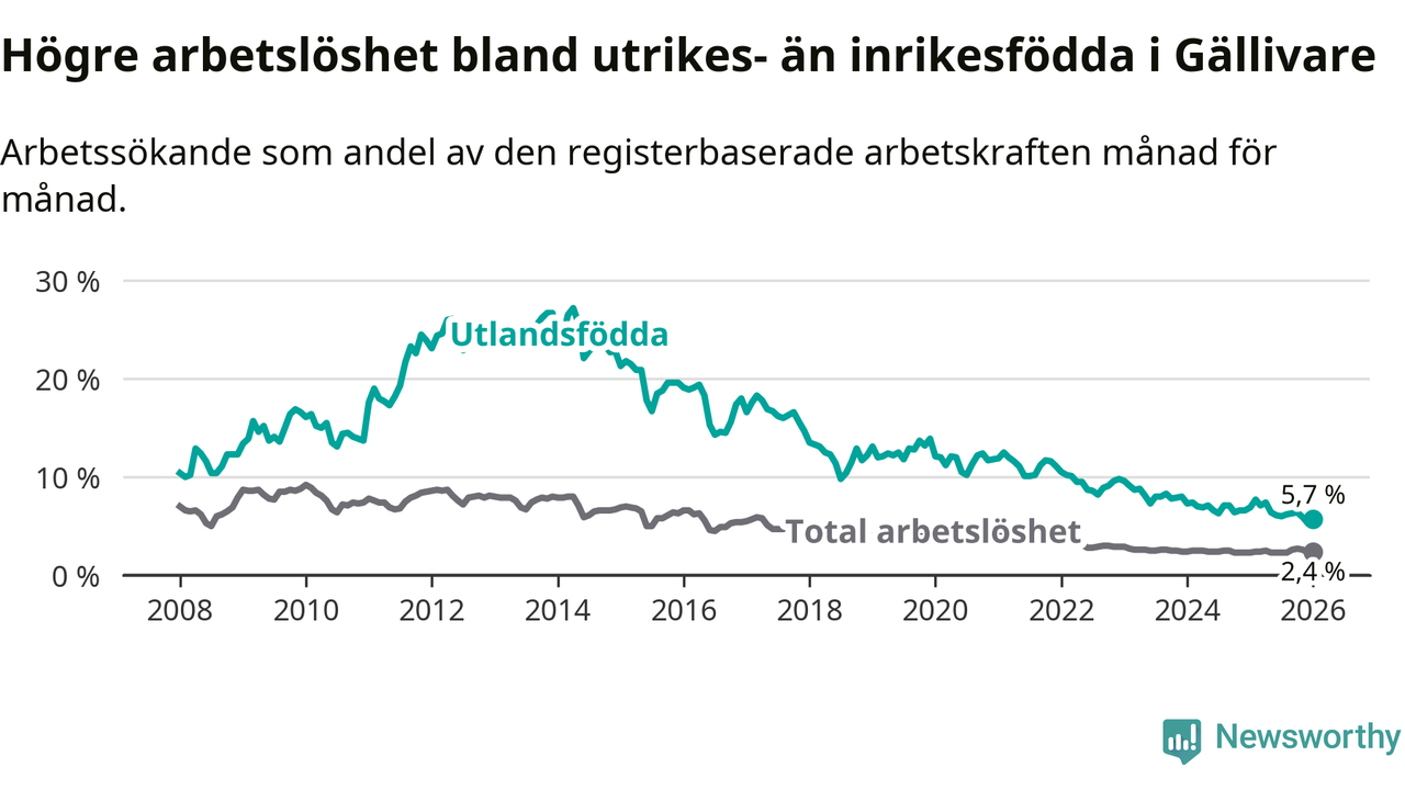 Arbetslösheten bland utlandsfödda var 5,7 procent i Gällivare under januari månad, motsvarande 77 av 1 351 personer. Det är 1,2 procentenheter färre än vid samma tidpunkt i fjol (−11 om man räknar personer).