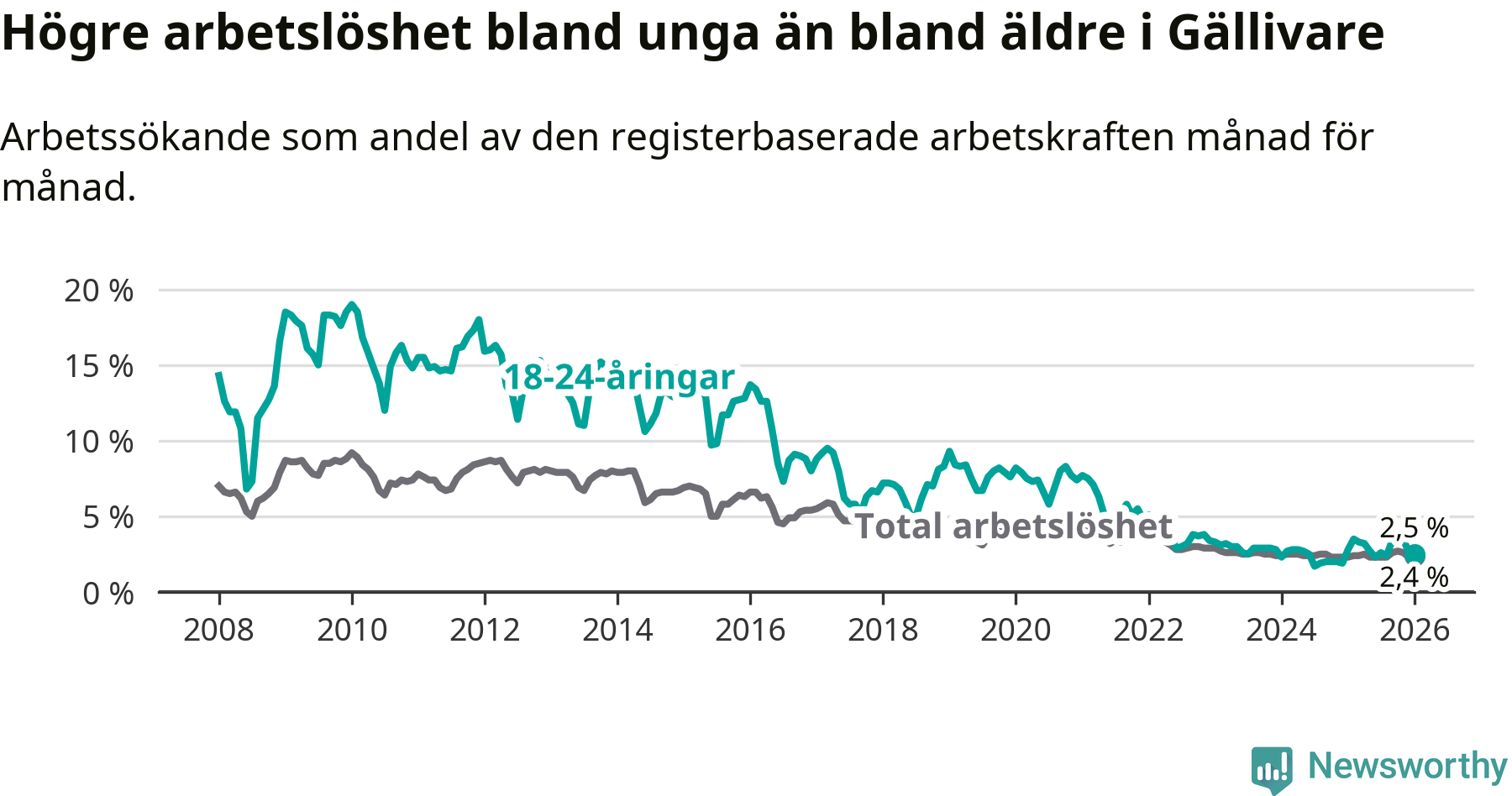 Graf: Arbetslöshet bland unga i Gällivare kommun och Norrbottens län