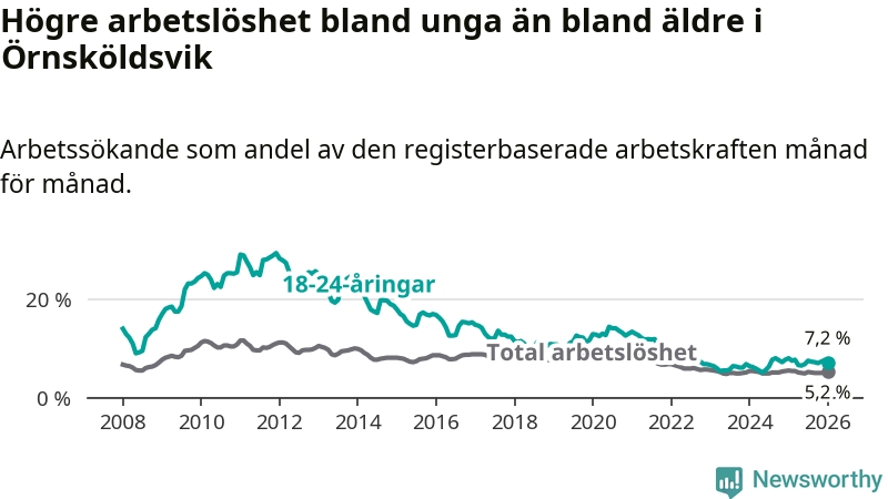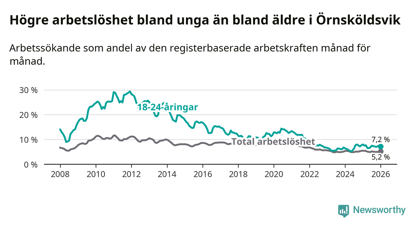 I januari var 7,2 procent av 18–24-åringarna inskrivna som arbetssökande (motsvarande 189 personer). Mäter vi antalet inskrivna ser vi en minskning med 18 personer på ett års sikt.