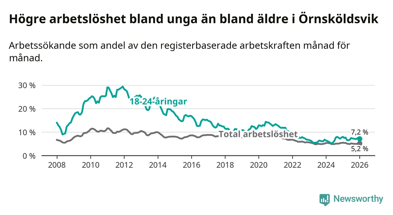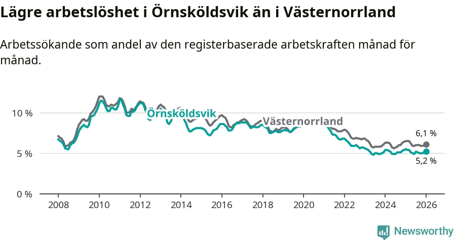 Under januari månad rapporterade Örnsköldsviks kommun en total arbetslöshet på 5,2 procent. Det är en minskning jämfört med samma tidpunkt i fjol (−0,3 procentenheter). Även i Västernorrlands län sjunker arbetslösheten .