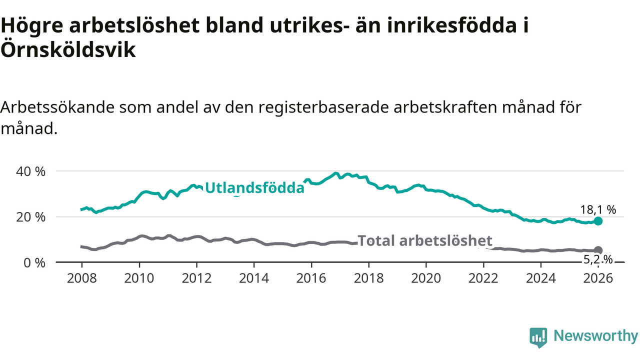 Arbetslösheten bland utlandsfödda var 18,1 procent i Örnsköldsvik under januari månad, motsvarande 590 av 3 260 personer. Det är 0,9 procentenheter färre än vid samma tidpunkt i fjol (−12 om man räknar personer). Därmed är de utlandsföddas arbetslöshet lägre än vid samma tidpunkt i fjol för sjätte månaden i följd.