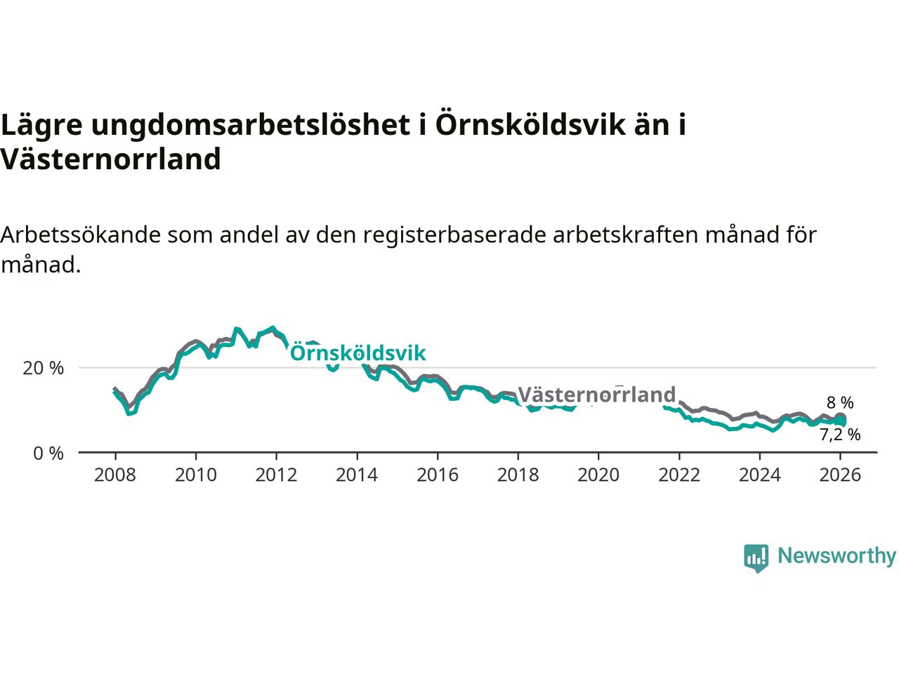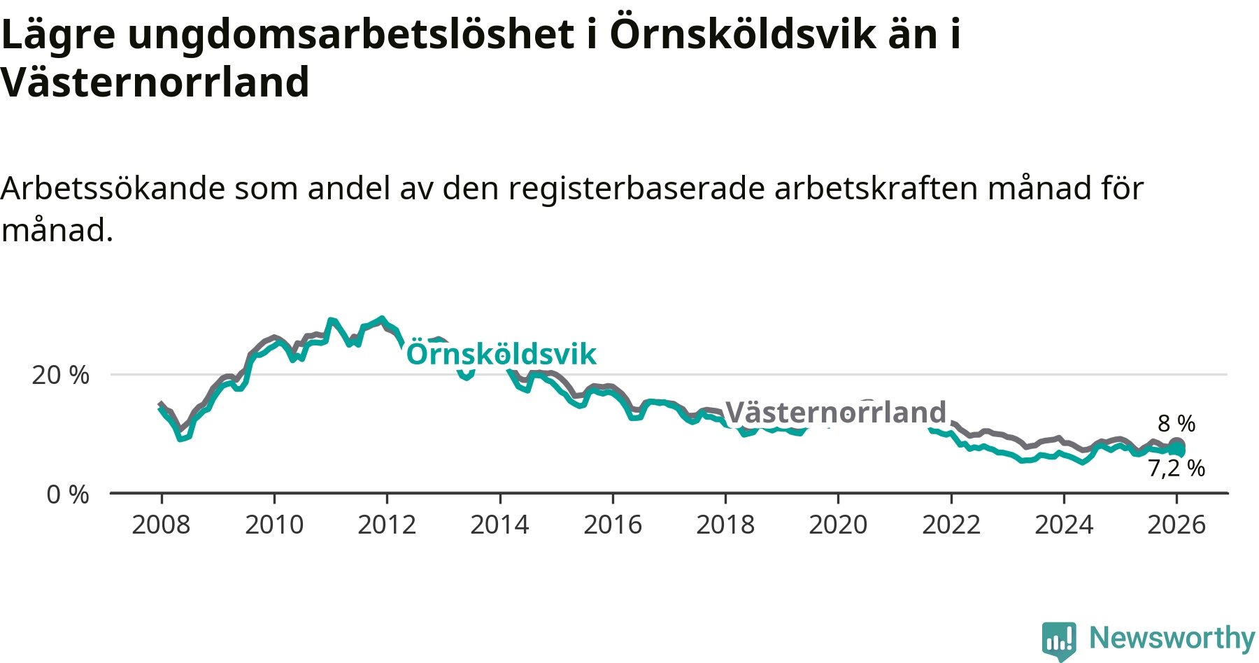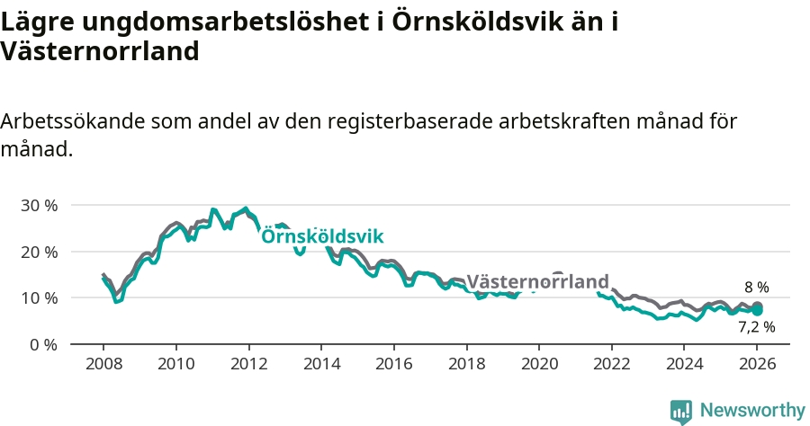 Precis som den totala arbetslösheten ligger ungdomsarbetslösheten i Örnsköldsvik lägre än i Västernorrland som helhet. Skillnaden mellan kommunen och länet är 0,8 procentenheter.