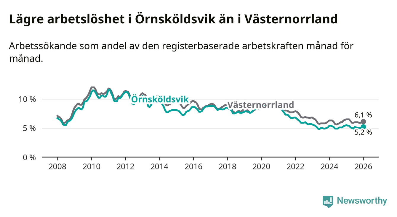 Örnsköldsvik hade redan tidigare lägre arbetslöshet än snittet i hela Västernorrlands län och nu växer klyftan (5,2 procent i kommunen, jämfört med 6,1 procent i hela länet). Örnsköldsvik har därmed även den lägsta arbetslöshetsnivån i länet. Härnösand har den högsta (8,1 procent).