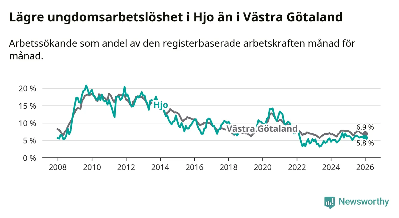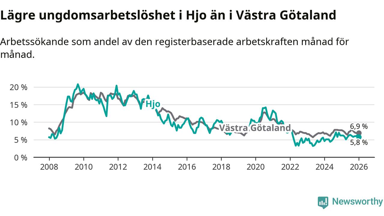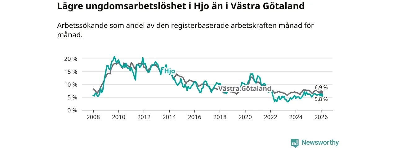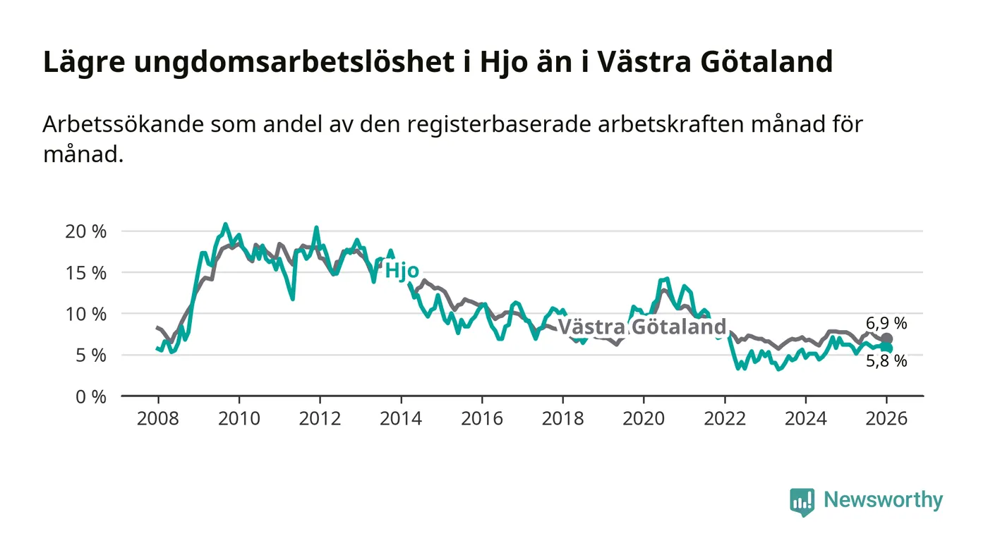 Precis som den totala arbetslösheten ligger ungdomsarbetslösheten i Hjo lägre än i Västra Götaland som helhet. Skillnaden mellan kommunen och länet är 1,1 procentenheter.