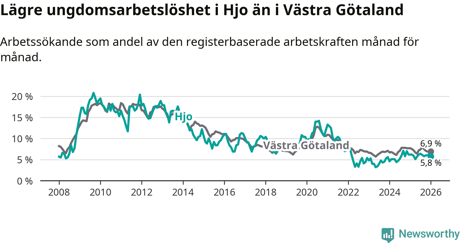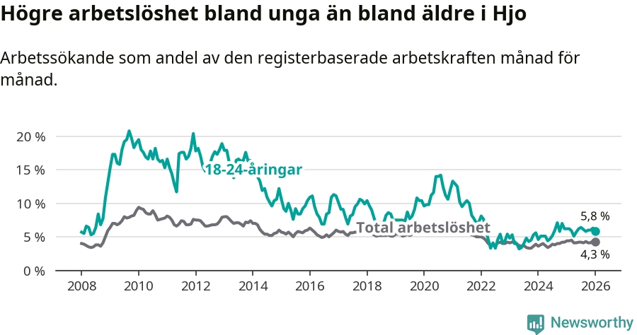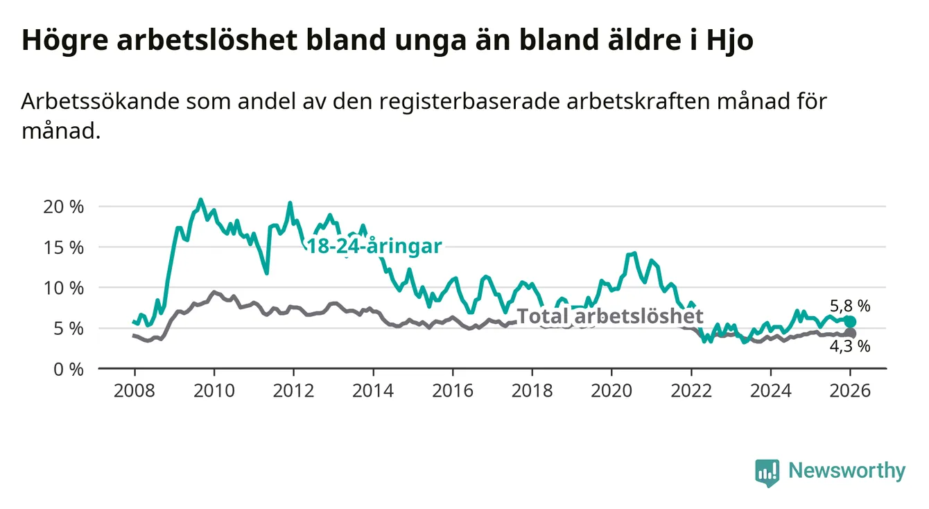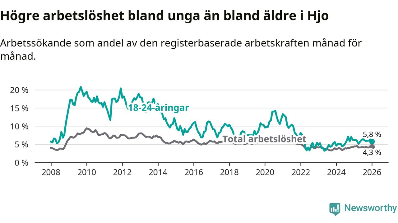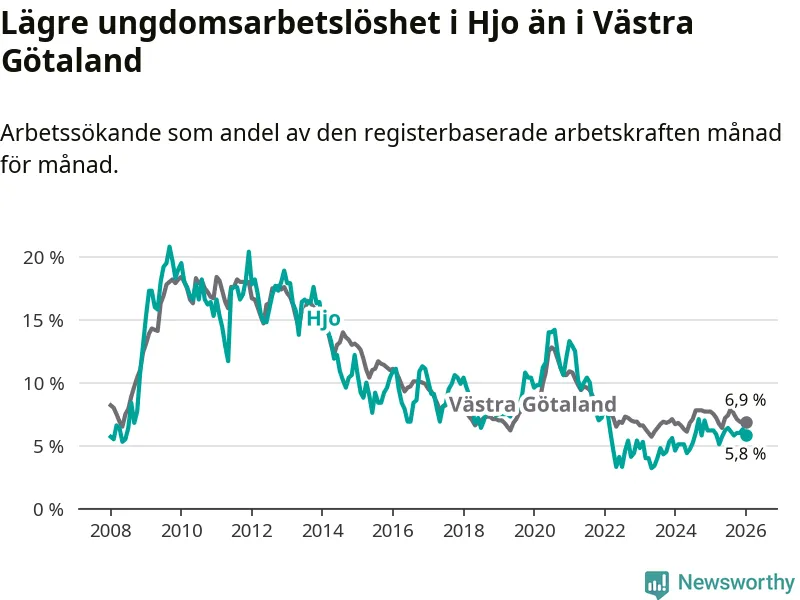 Precis som den totala arbetslösheten ligger ungdomsarbetslösheten i Hjo lägre än i Västra Götaland som helhet. Skillnaden mellan kommunen och länet är 1,1 procentenheter.