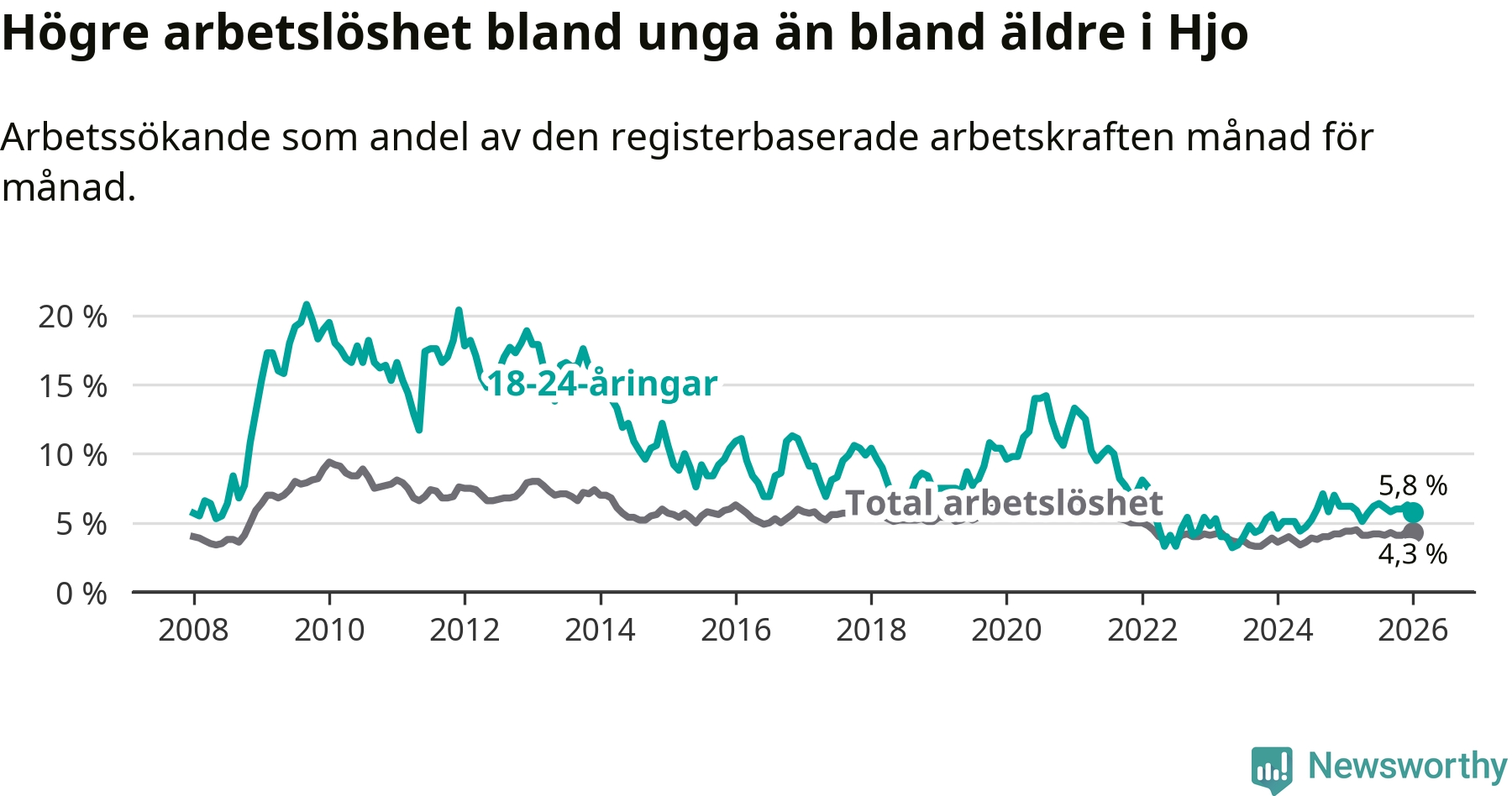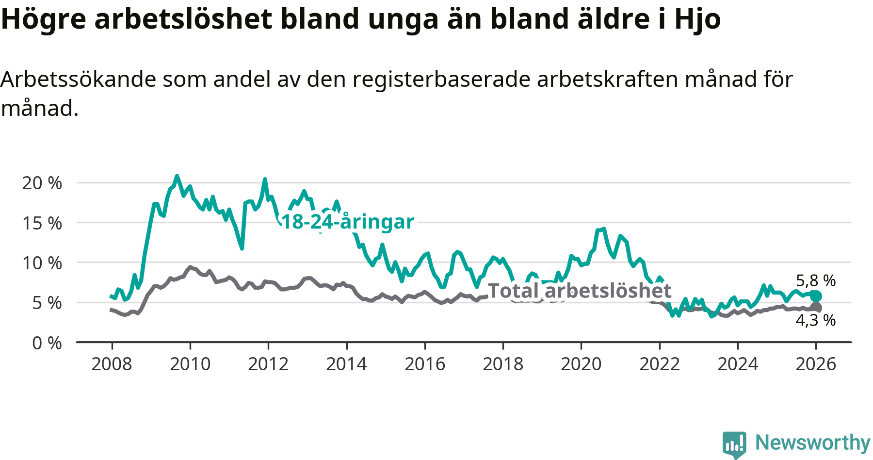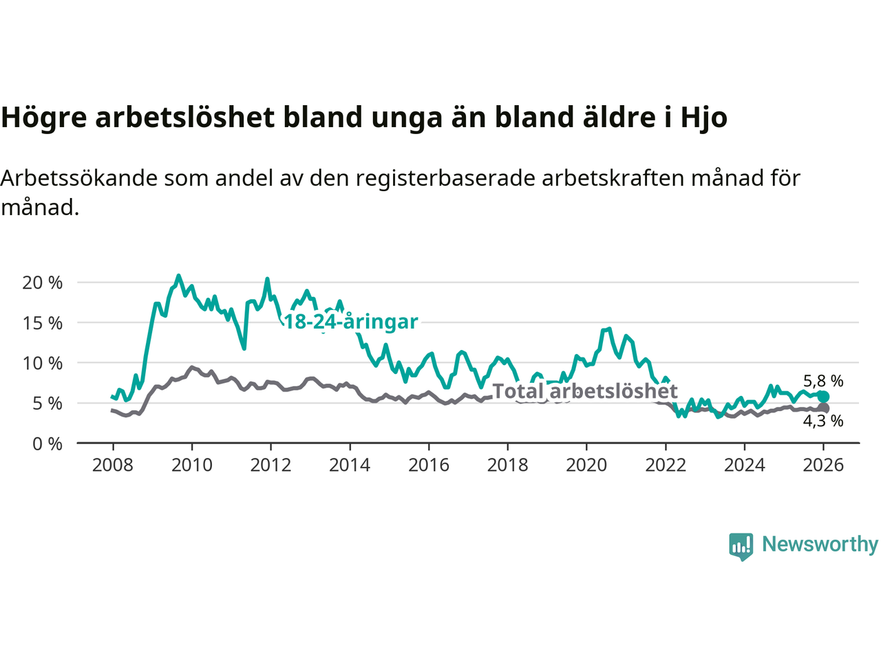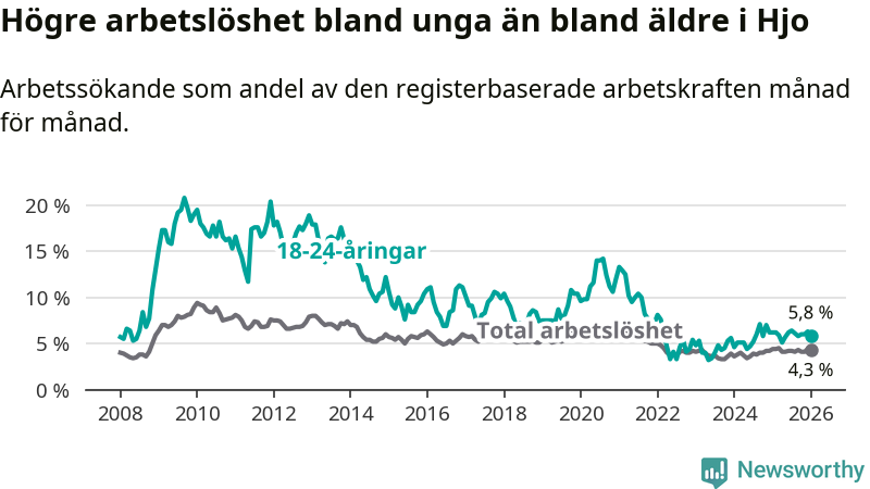 Precis som den totala arbetslösheten sjunker arbetslösheten bland unga (−0,4 procentenheter). I januari var 5,8 procent av 18–24-åringarna inskrivna som arbetssökande (motsvarande 23 personer). Mäter vi antalet inskrivna ser vi en minskning med ett personer på ett års sikt.