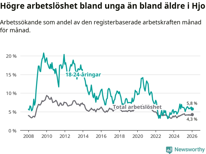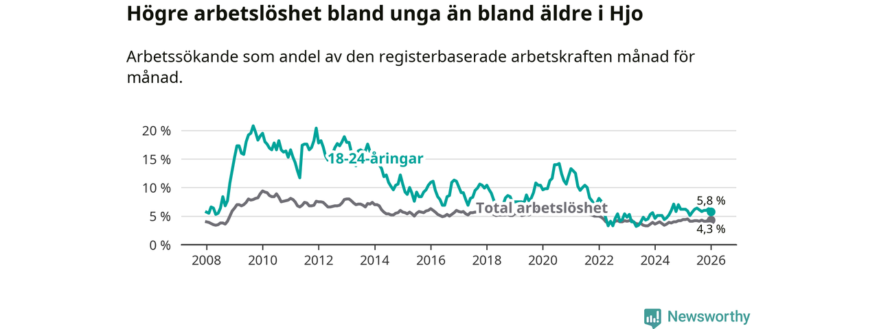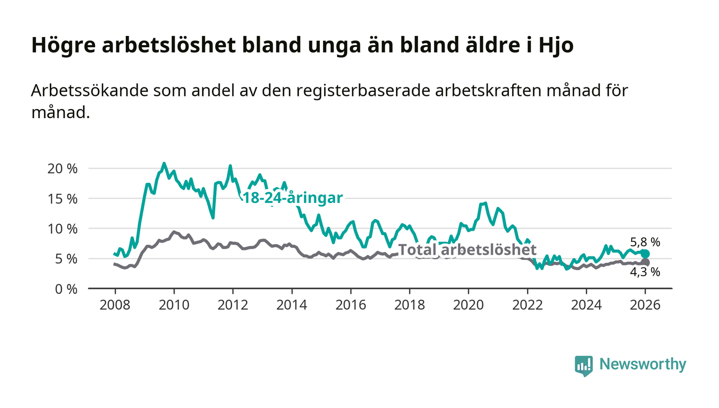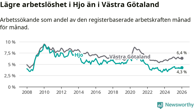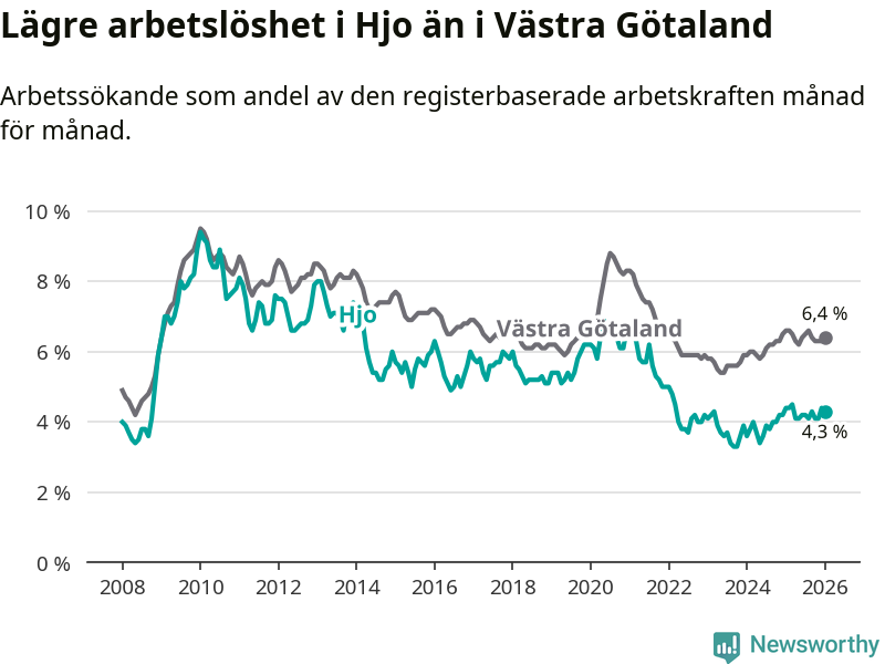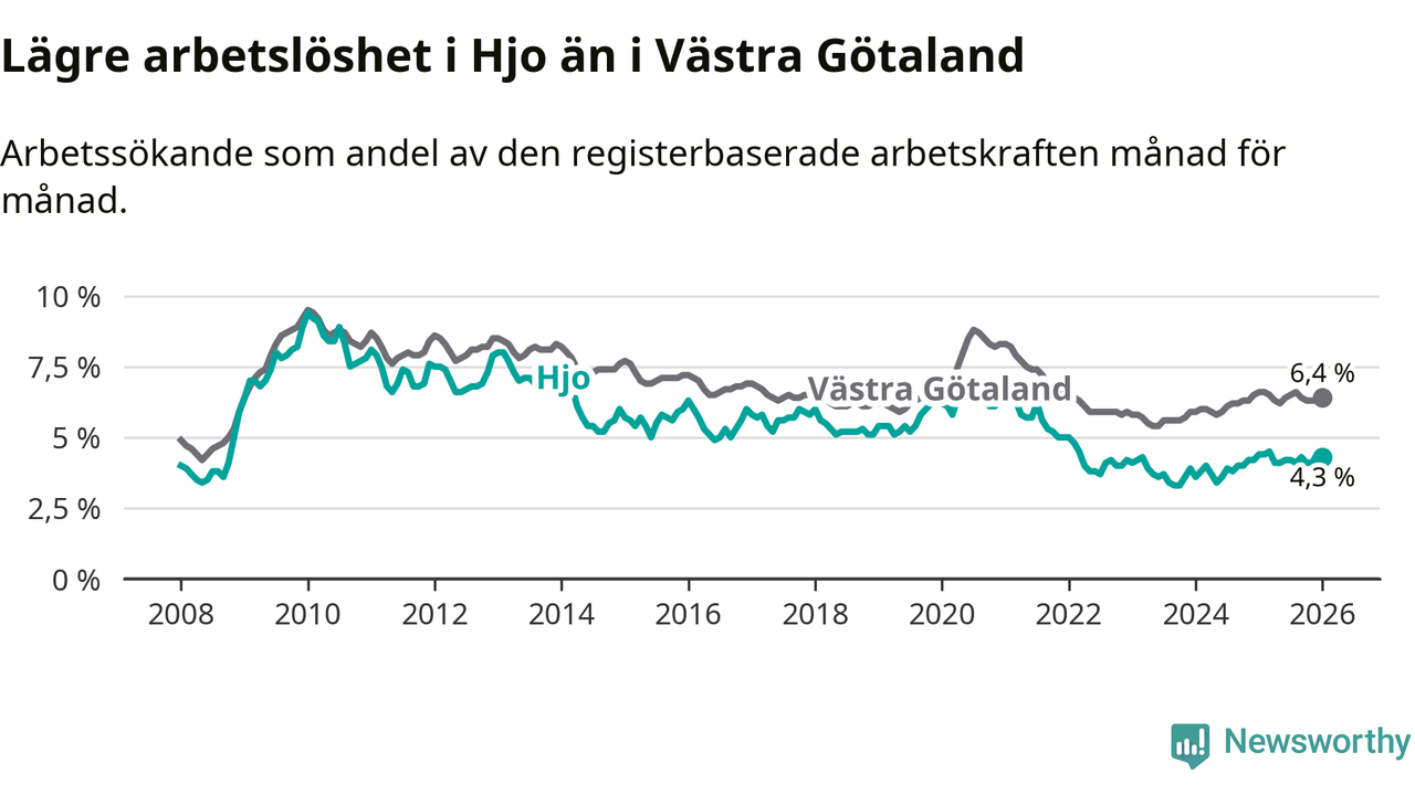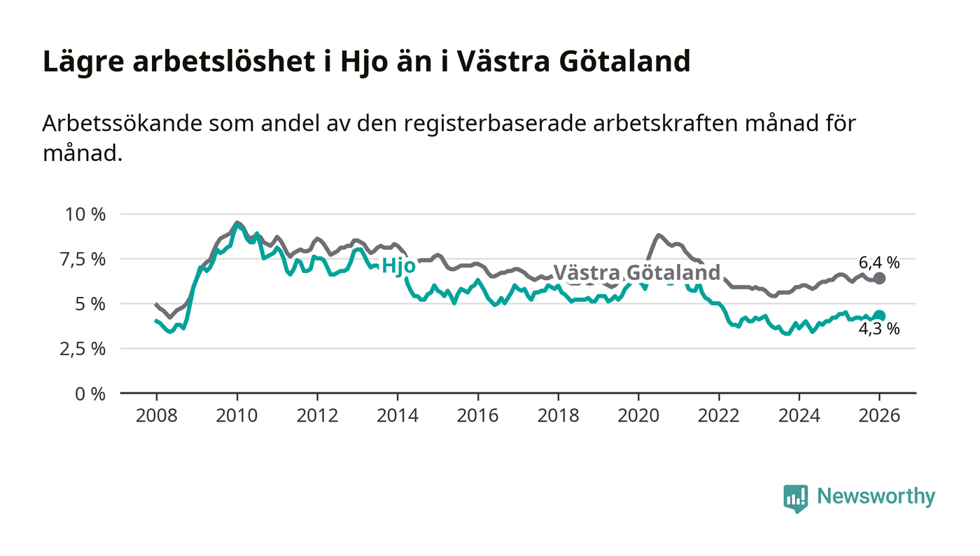 Under januari månad rapporterade Hjo kommun en total arbetslöshet på 4,3 procent. Det är en minskning jämfört med samma tidpunkt i fjol (−0,1 procentenheter). Även i Västra Götalands län sjunker arbetslösheten .