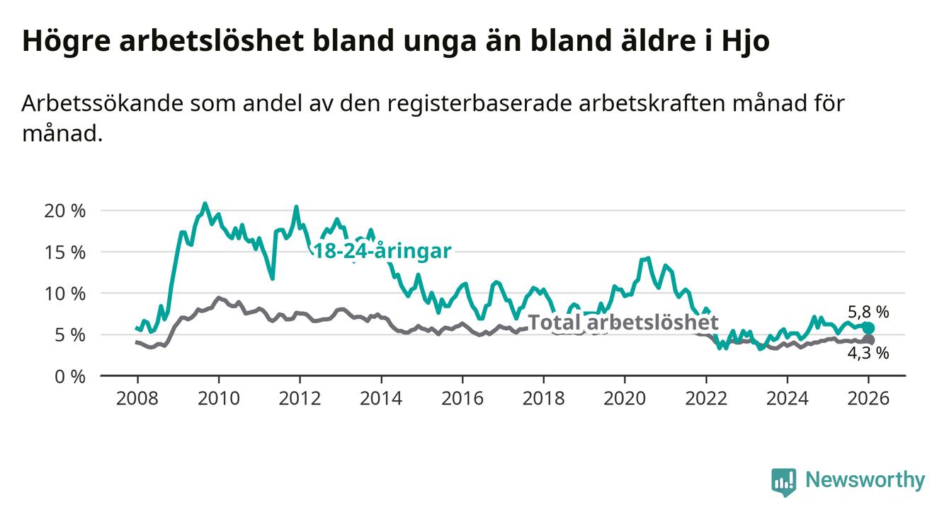Sett till antalet personer betyder det att 189 av 4 395 invånare i åldern 16 till 661 år i Hjo kommun var inskrivna som arbetssökande (ett fler än i januari i fjol).