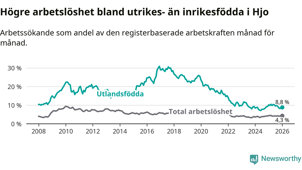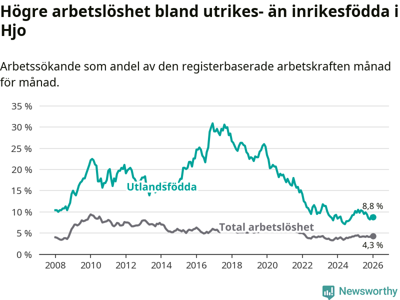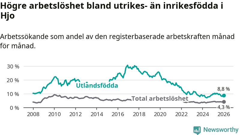 Arbetslösheten bland utlandsfödda var 8,8 procent i Hjo under januari månad, motsvarande 39 av 443 personer. Det är 1,4 procentenheter färre än vid samma tidpunkt i fjol (−5 om man räknar personer).