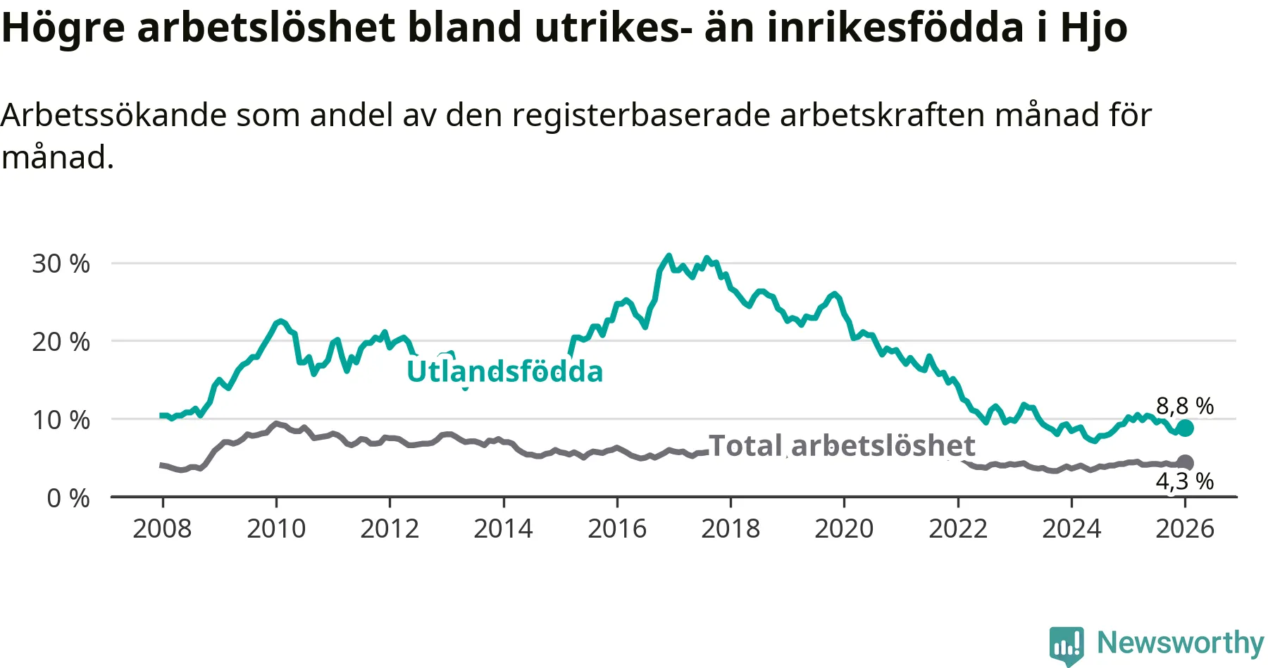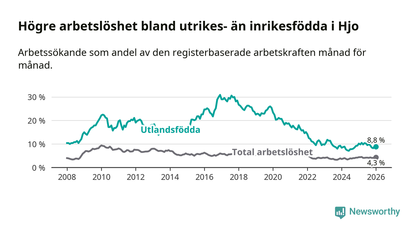 Skillnaden i arbetslöshet mellan utrikesfödda och hela befolkningen är 4,5 procentenheter i Hjo. Det är en mindre skillnad än för ett år sedan (−1,3 procentenheter).