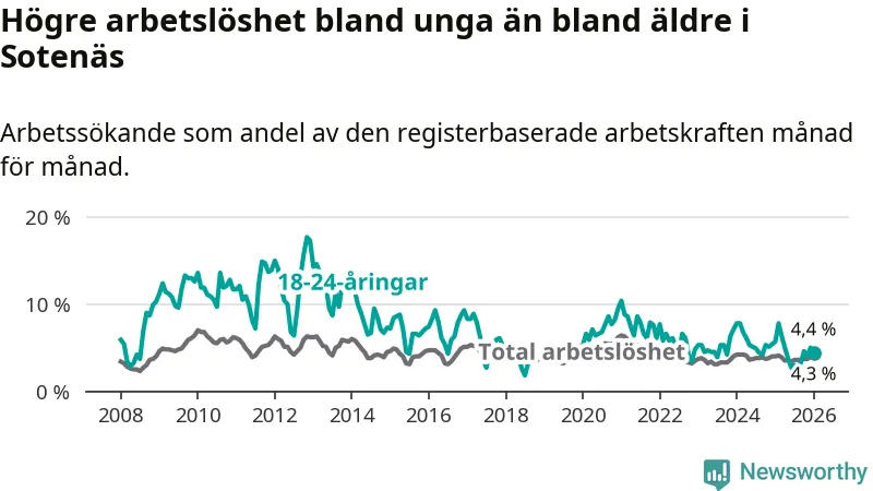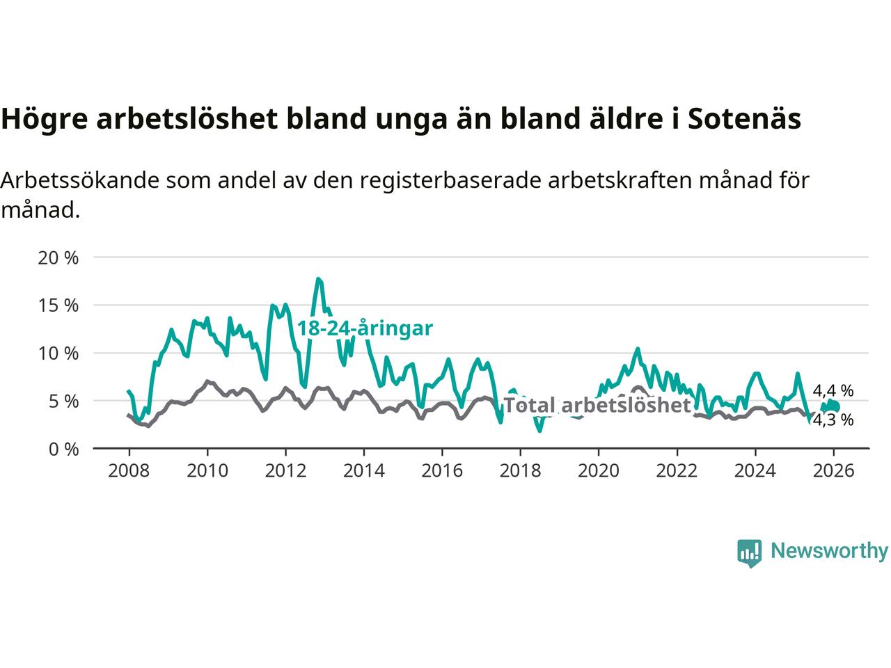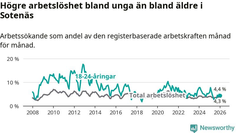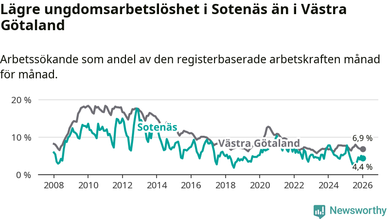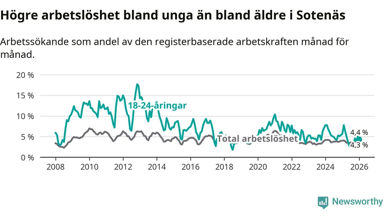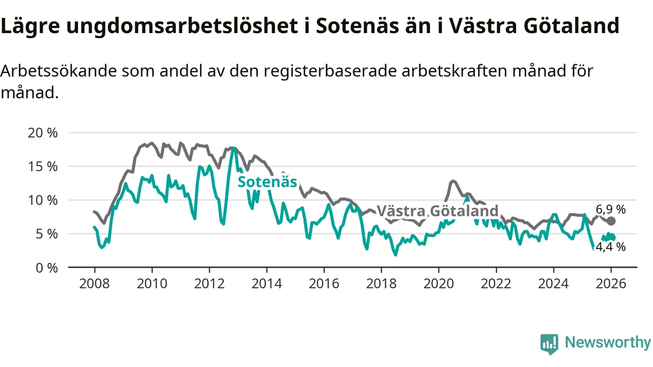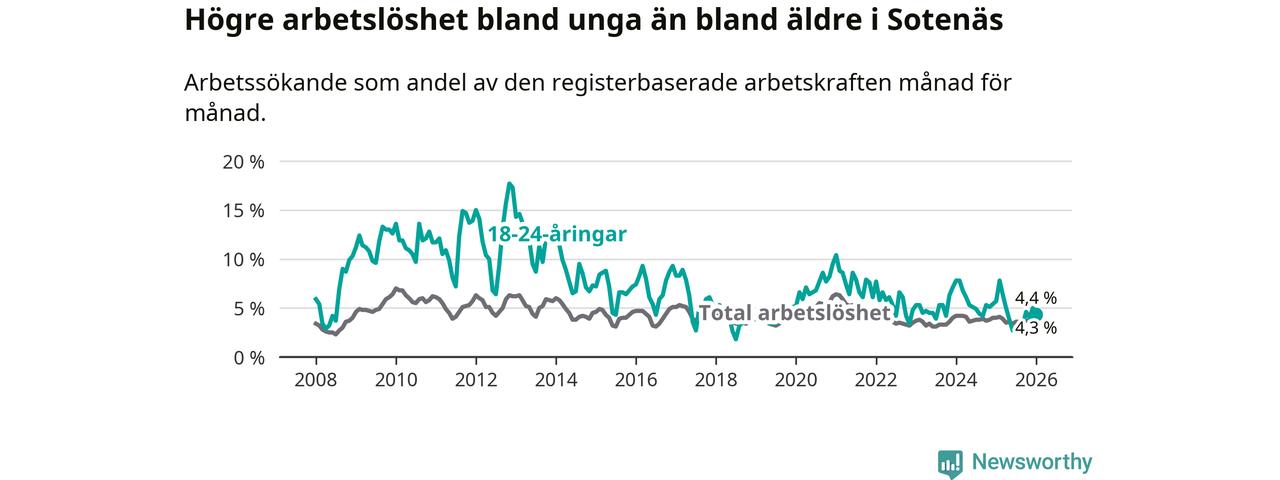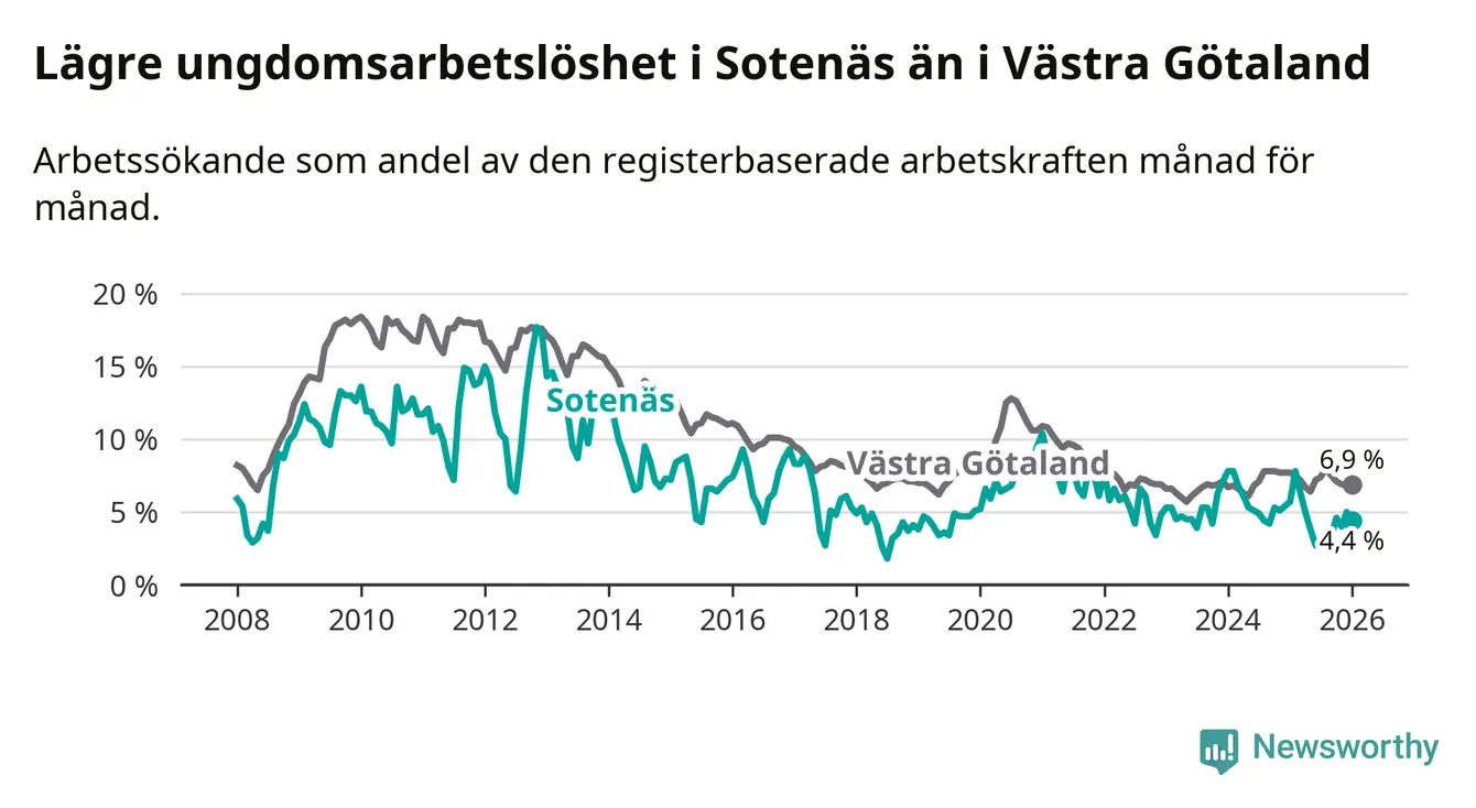 I och med den senaste månadens nedgång har de ungas arbetslöshet i Sotenäs sjunkit elva månader i följd (ner från 7,8 procent i februari 2025 till 4,4 procent nu).