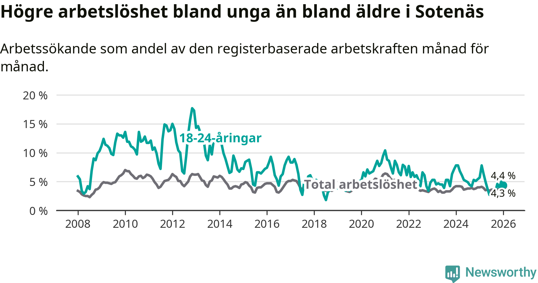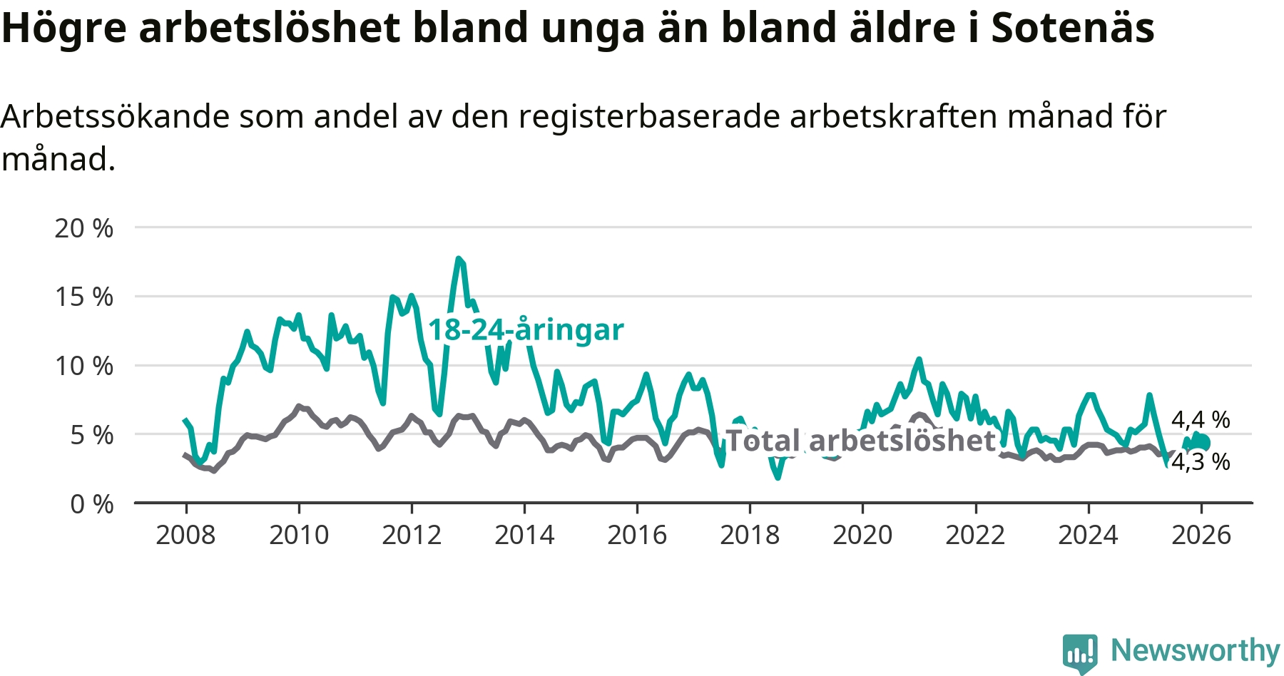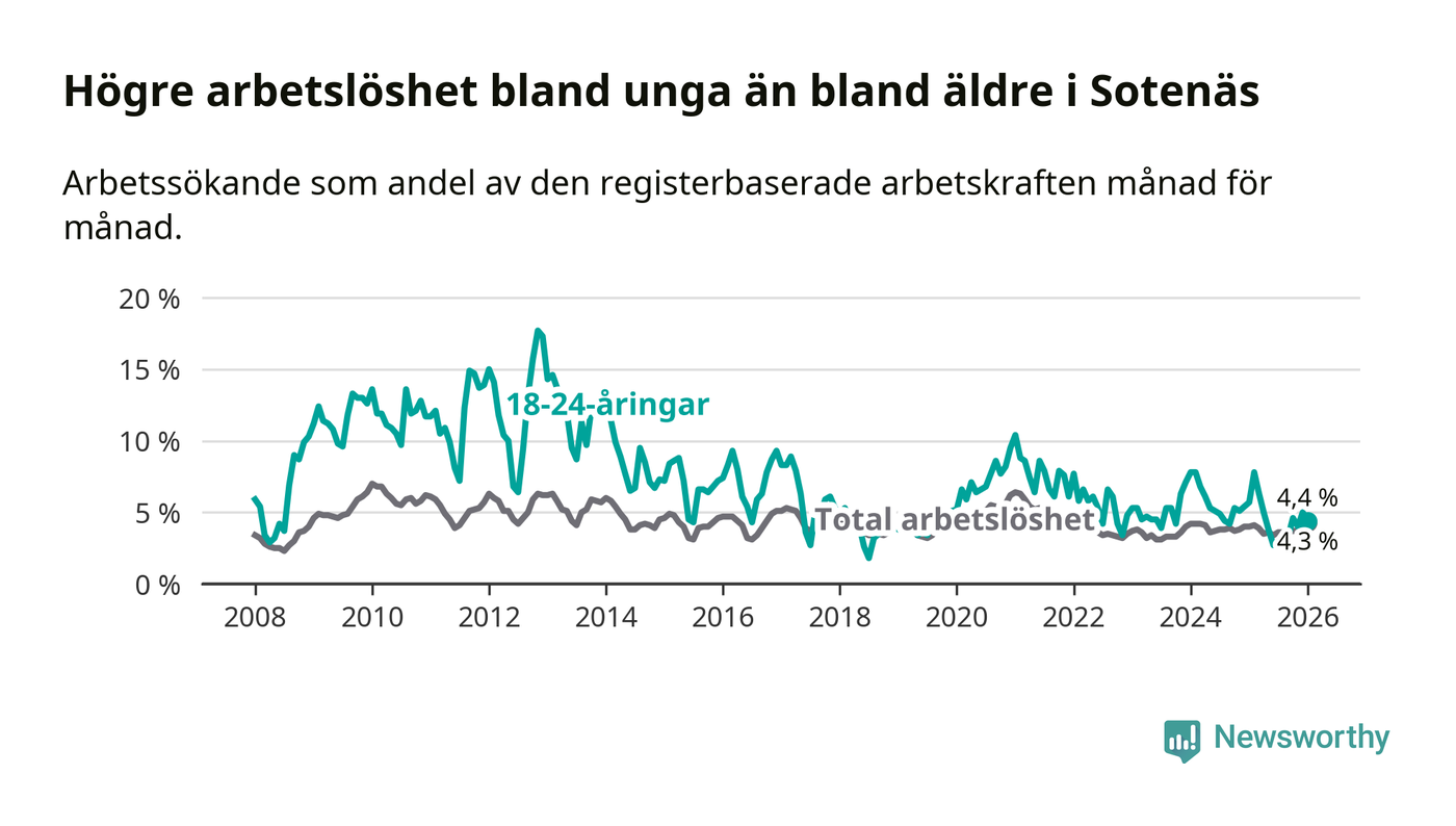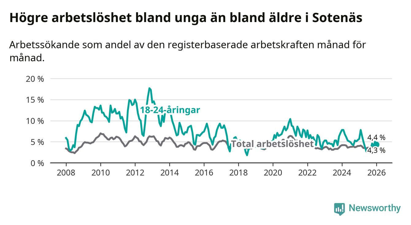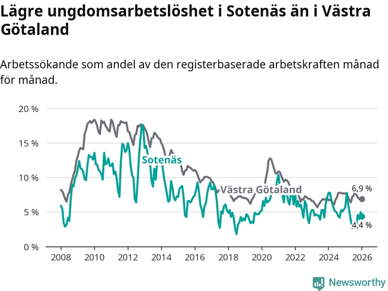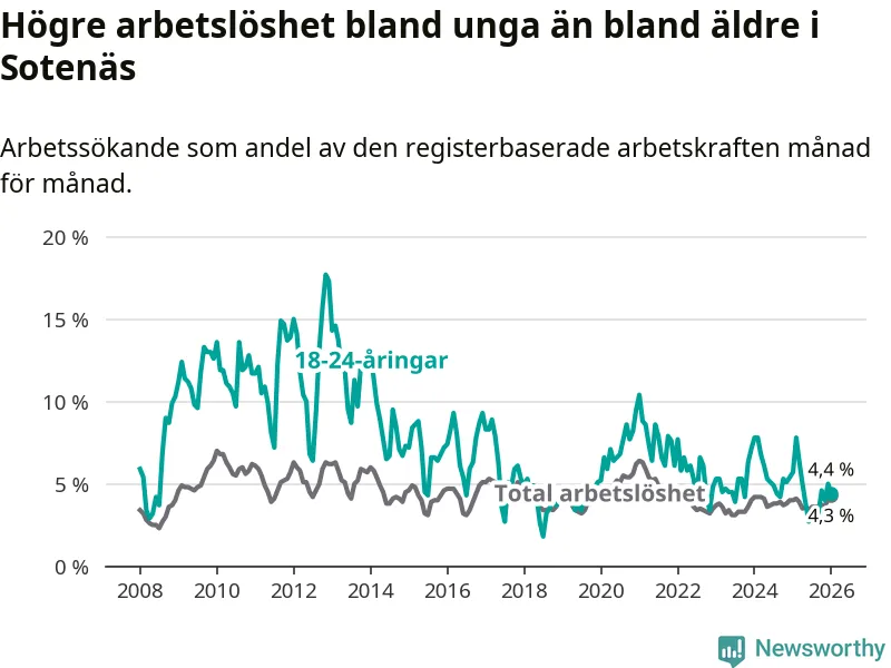 I och med den senaste månadens nedgång har de ungas arbetslöshet i Sotenäs sjunkit elva månader i följd (ner från 7,8 procent i februari 2025 till 4,4 procent nu).