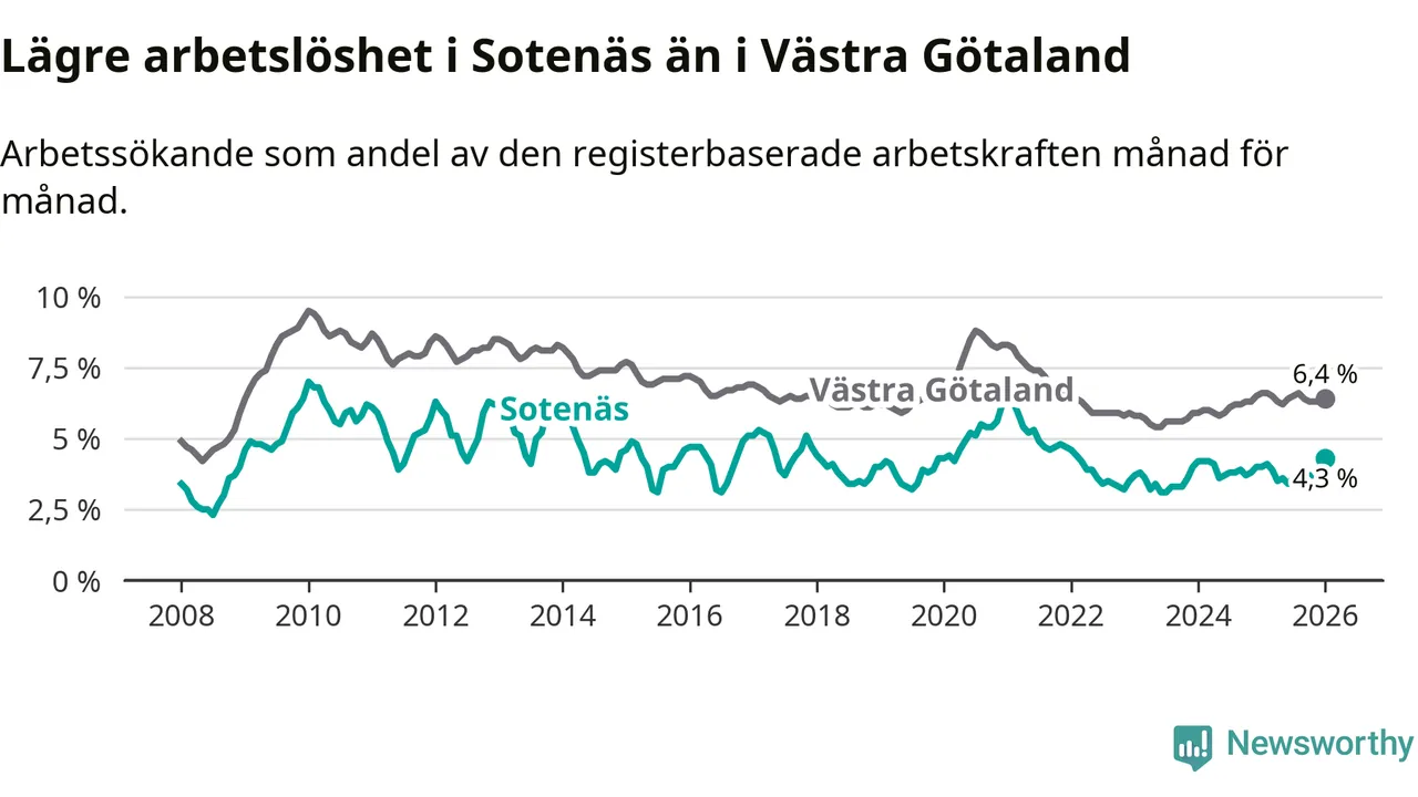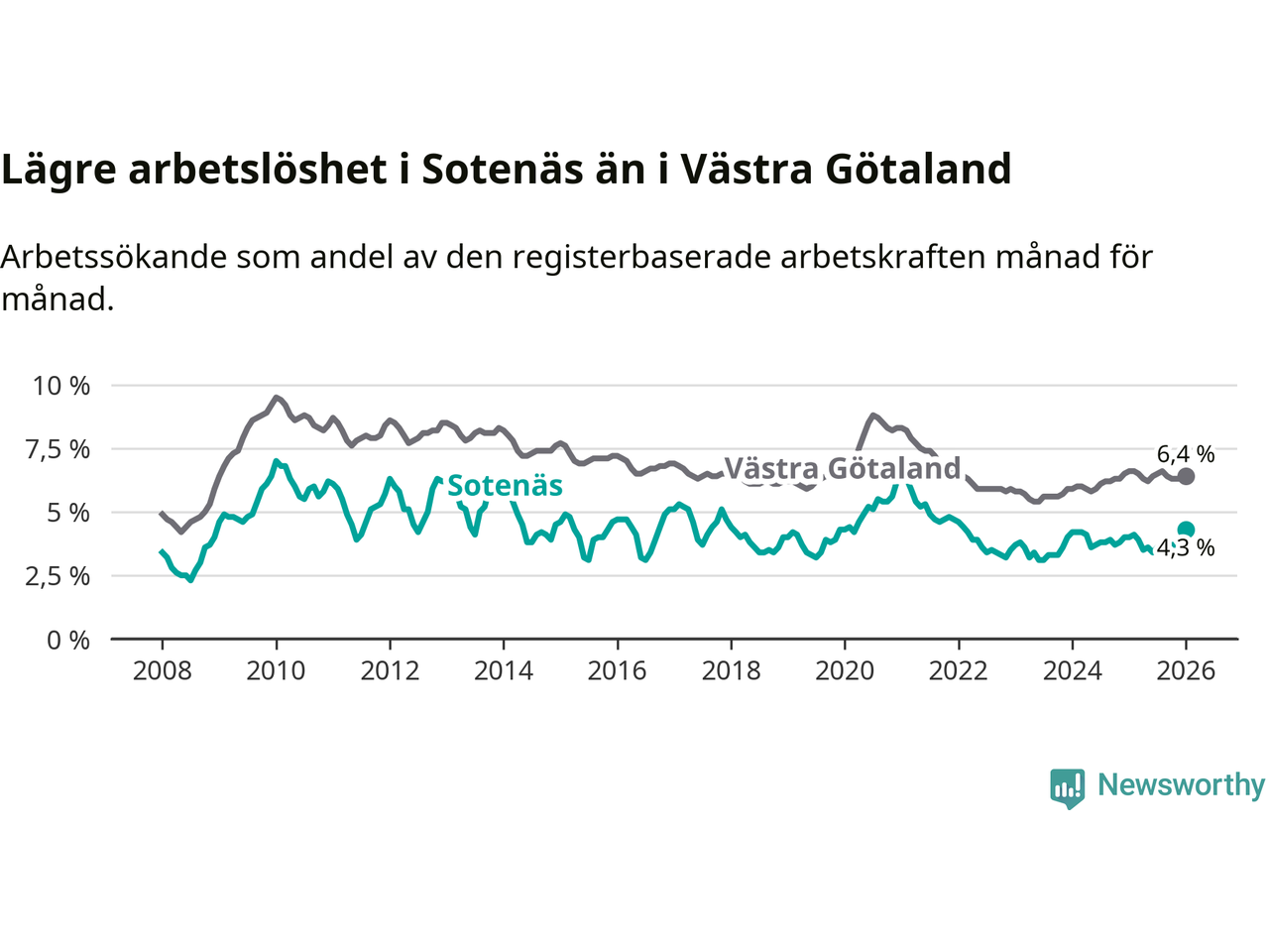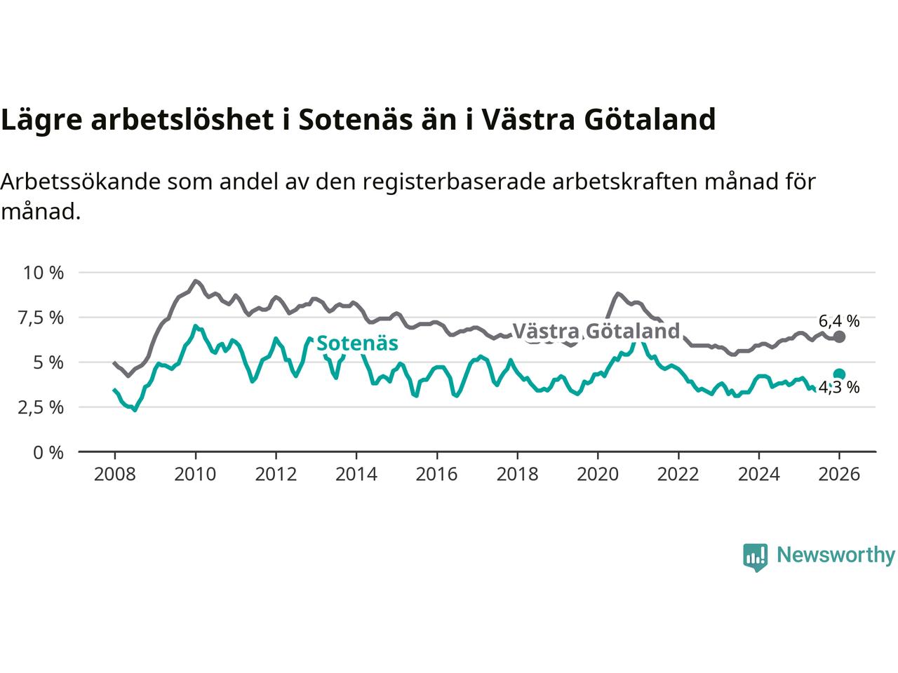 Under januari månad rapporterade Sotenäs kommun en total arbetslöshet på 4,3 procent. Det är en ökning jämfört med samma tidpunkt i fjol (+0,3 procentenheter). I Västra Götalands län däremot sjunker arbetslösheten .