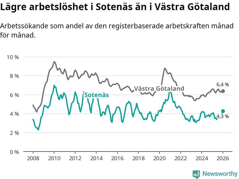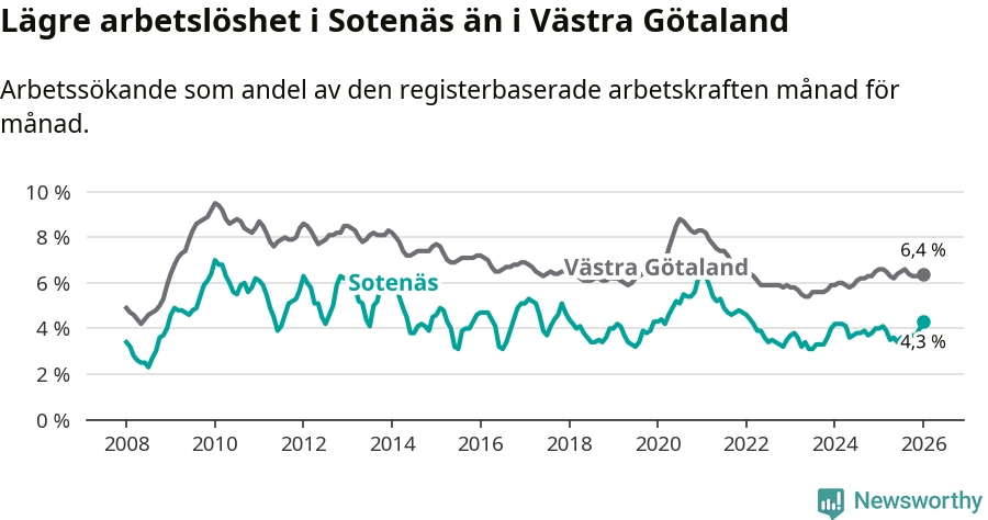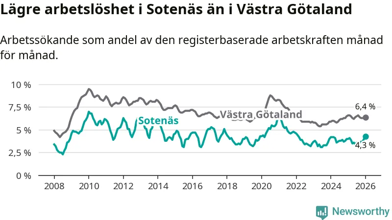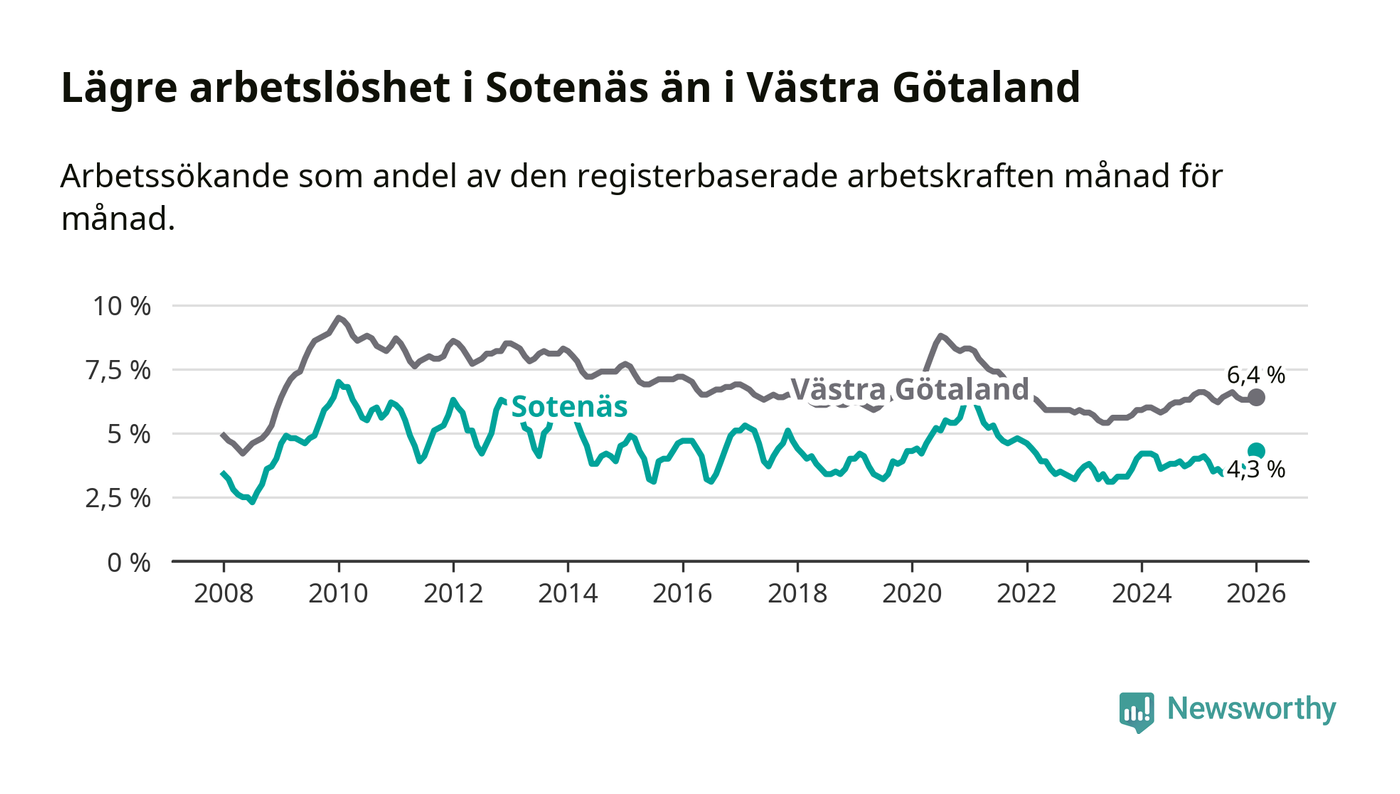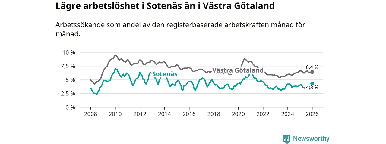 Under januari månad rapporterade Sotenäs kommun en total arbetslöshet på 4,3 procent. Det är en ökning jämfört med samma tidpunkt i fjol (+0,3 procentenheter). I Västra Götalands län däremot sjunker arbetslösheten .