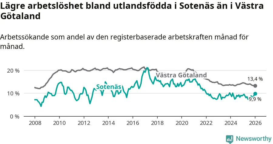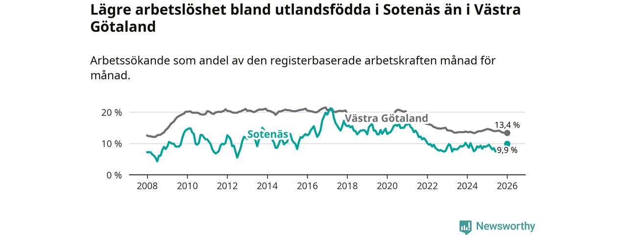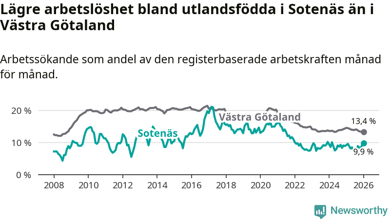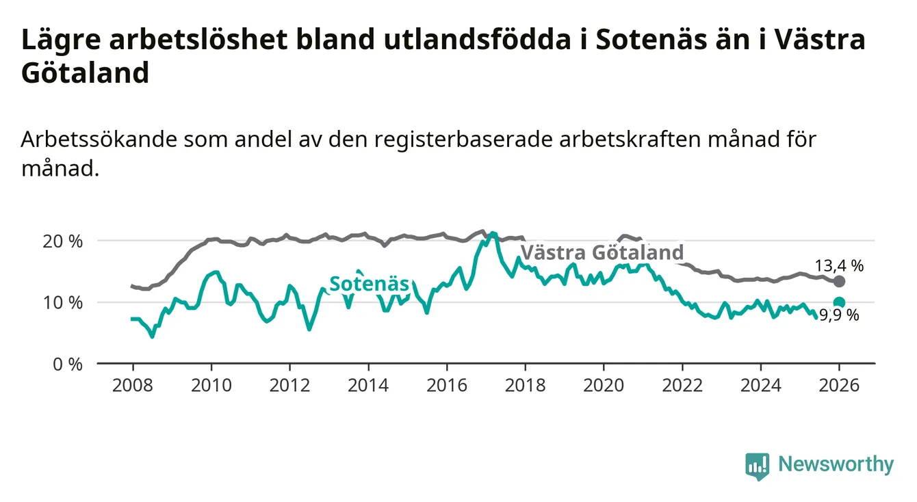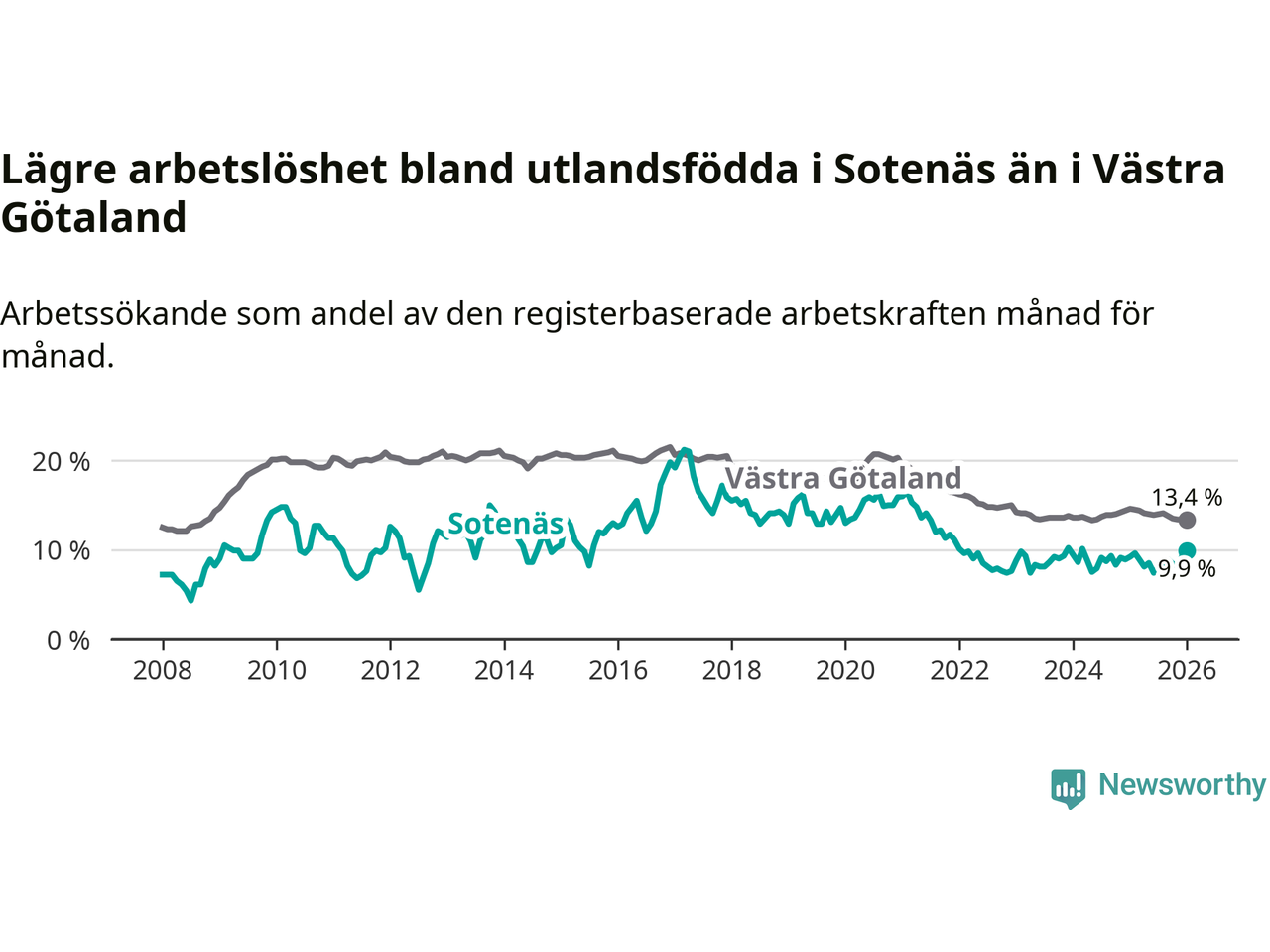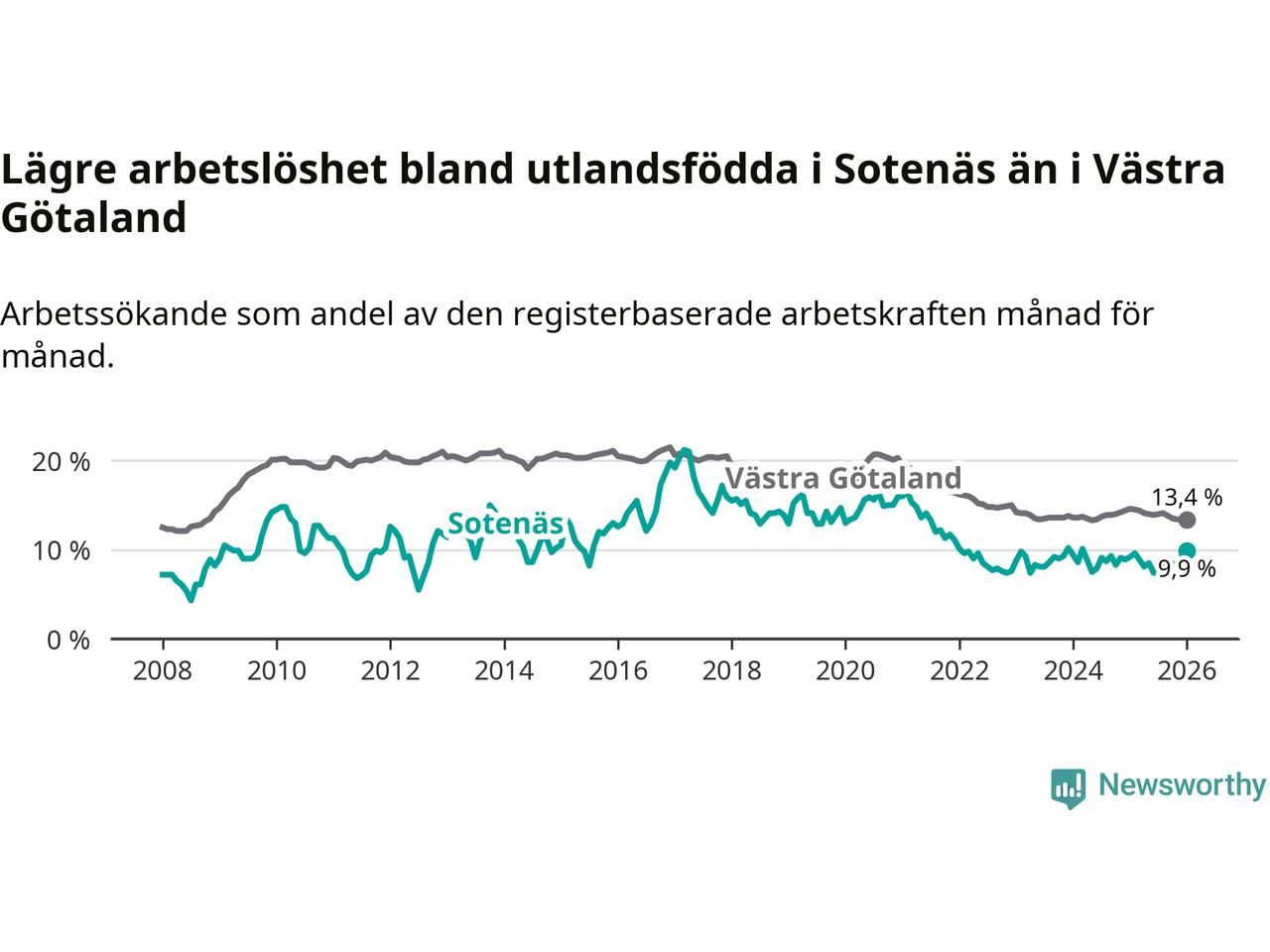 Medan arbetslösheten bland utlandsfödda alltså ökar i Sotenäs så minskar den i Västra Götaland. Jämfört med januari förra året har andelen arbetslösa utlandsfödda i länet minskat med 1,2 procentenheter (till 13,4 procent). Trots den senaste uppgången har Sotenäs med andra ord fortfarande lägre arbetslöshet bland utlandsfödda än Västra Götaland.